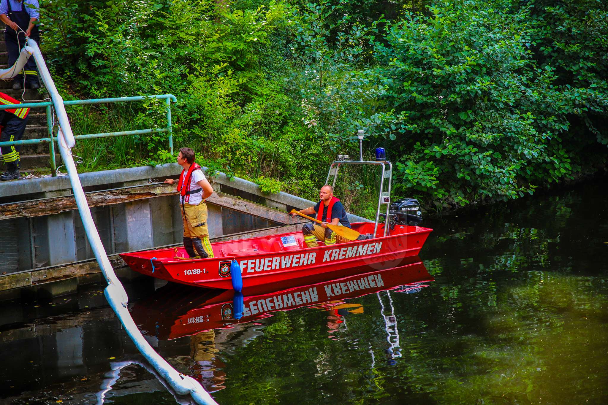 Sofort nach dem Vorfall wurden die zuständigen Behörden informiert. Auch die Feuerwehr der Stadt Kremmen rückte an, da sich Öl auf der Wasseroberfläche ausbreitete. Parallel wurde die Umweltbehörde hinzugezogen.