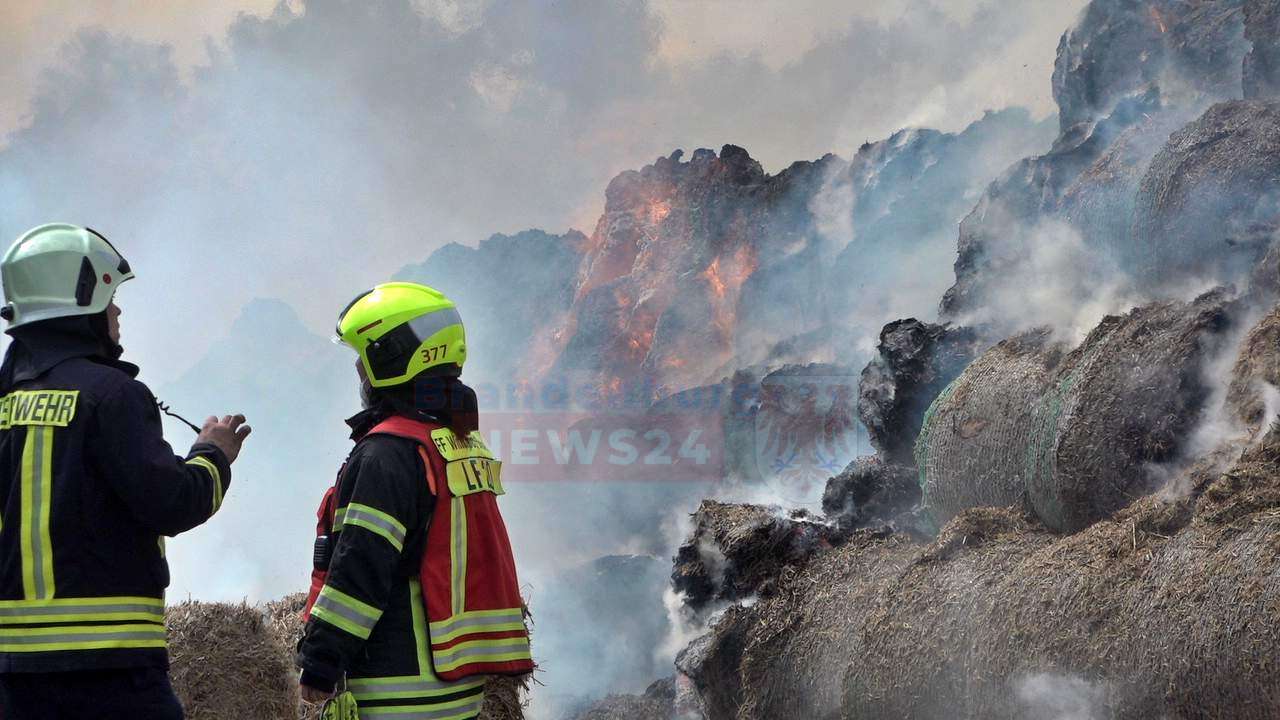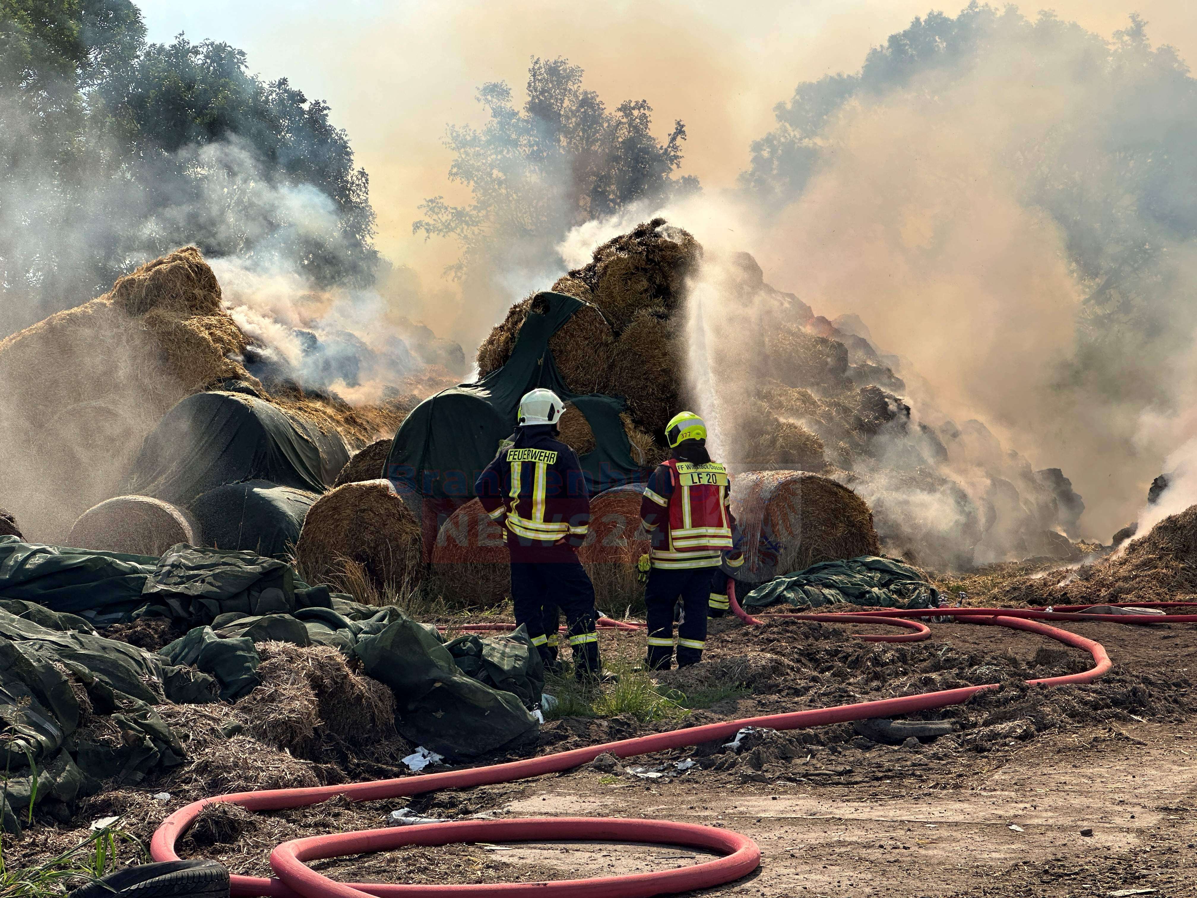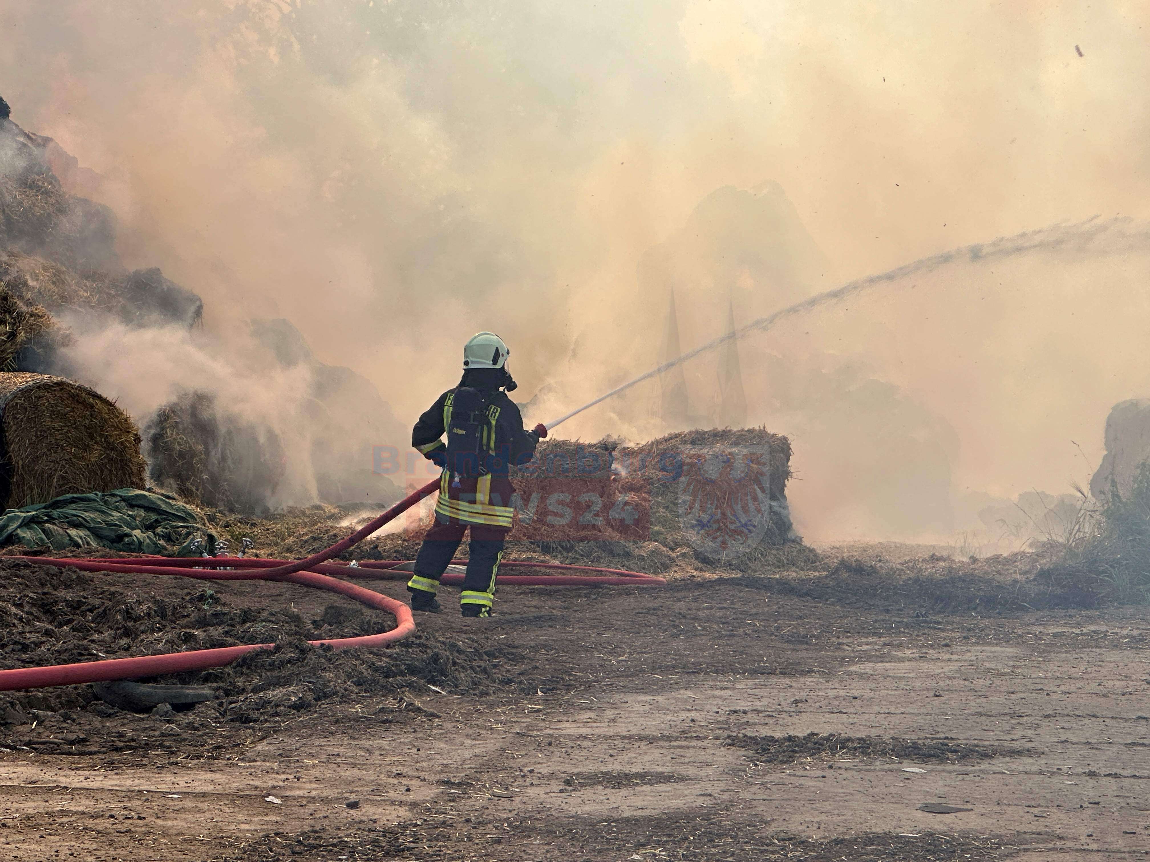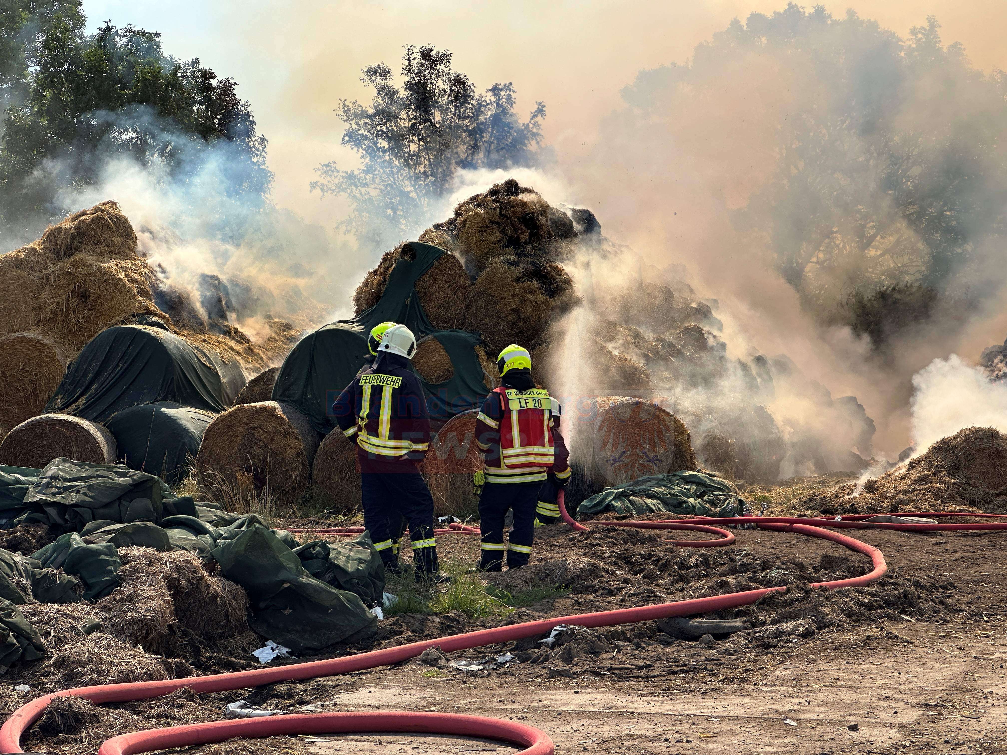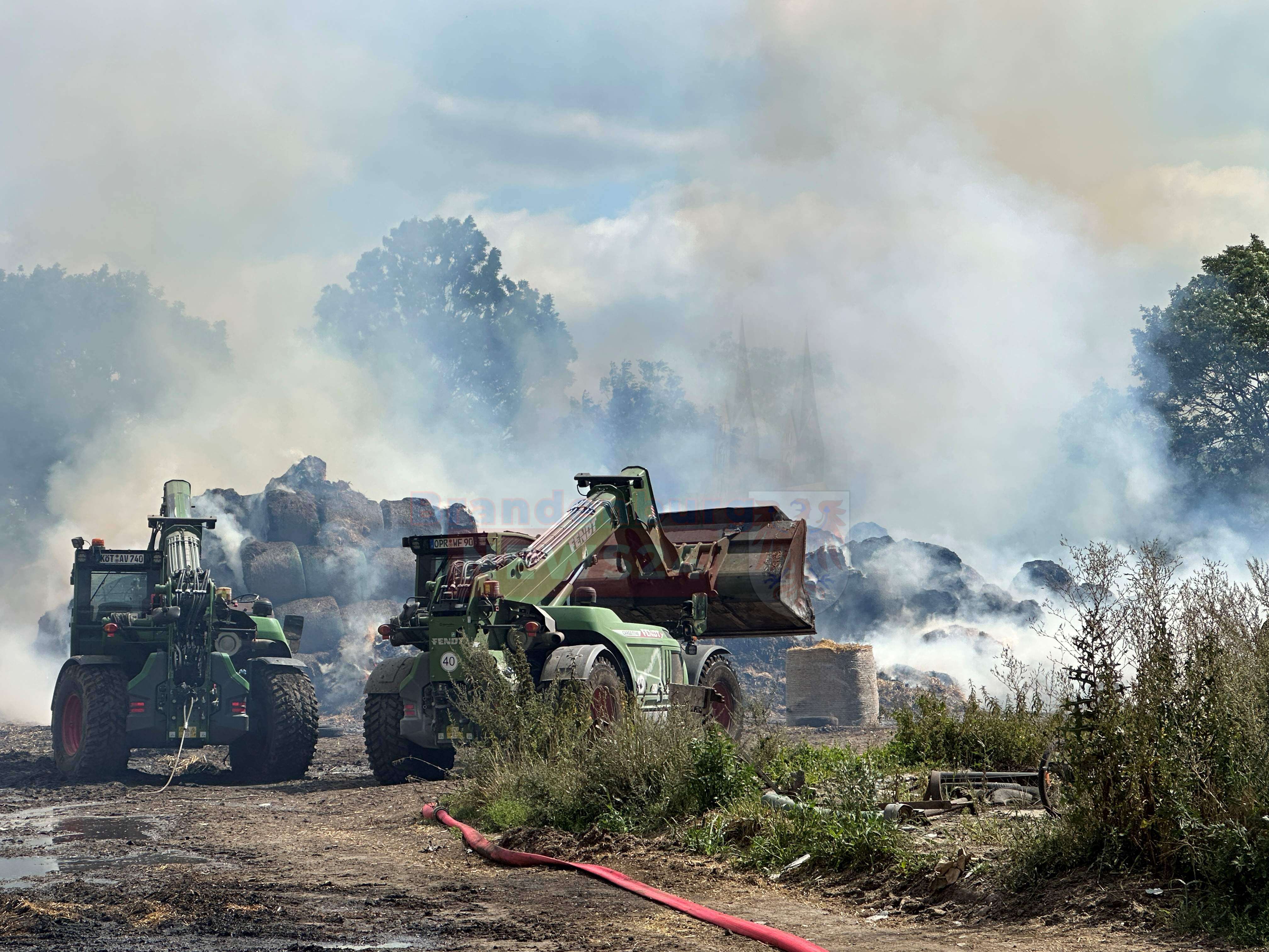 Die Feuerwehr rückte mit einem Großaufgebot an, doch die Löscharbeiten gestalteten sich äußerst schwierig. Das eingestürzte Dach erschwerte den Zugang zu den Brandherden erheblich, und die Flammen griffen im Laufe des Nachmittags auf in der Umgebung gestapelte Strohmieten über. Mehr als 60 Einsatzkräfte kämpften unermüdlich gegen das Feuer, unterstützt von Landwirten mit Teleskopladern, die die brennenden Strohballen auseinanderzogen, um Glutnester zu bekämpfen.
