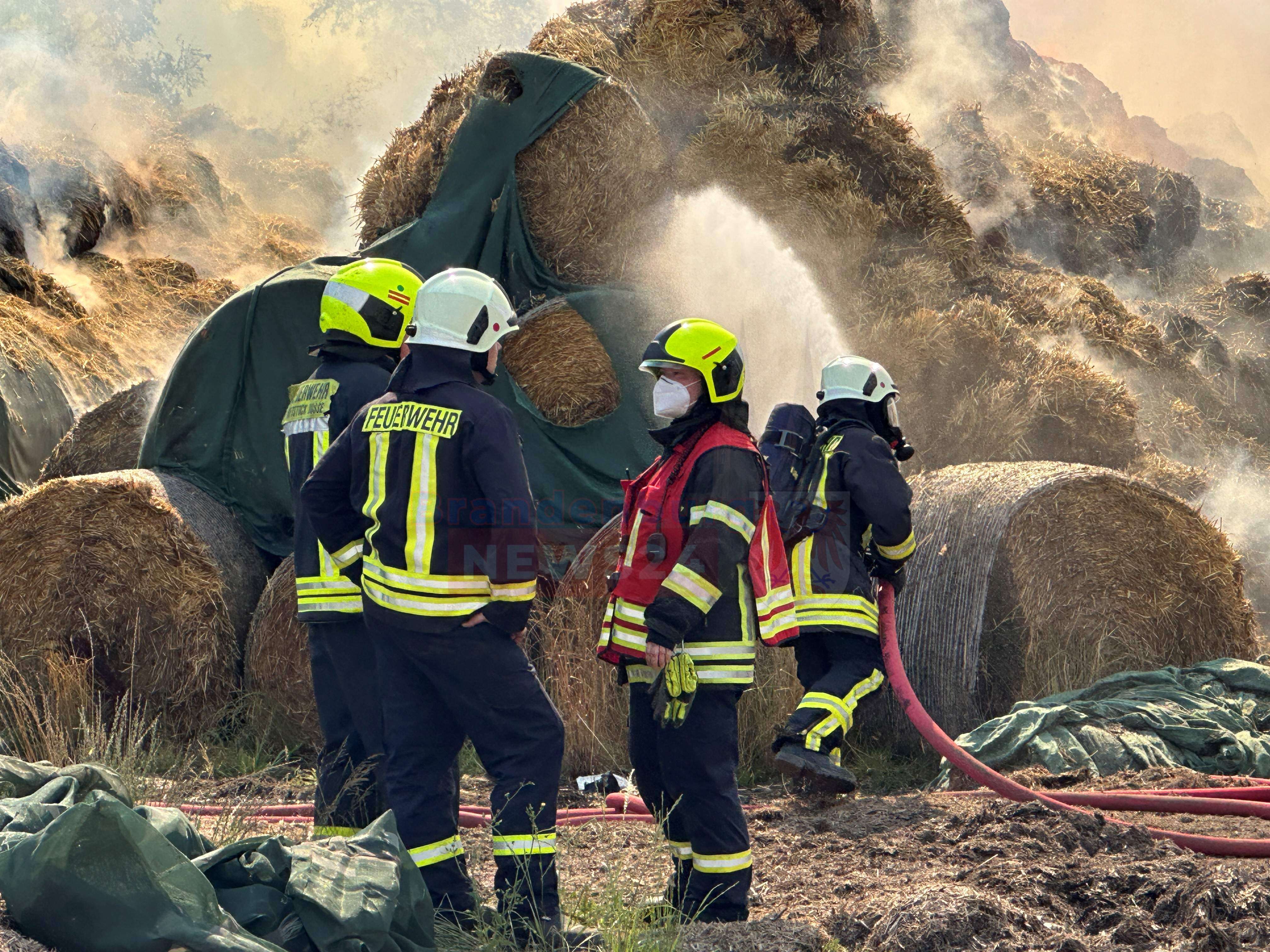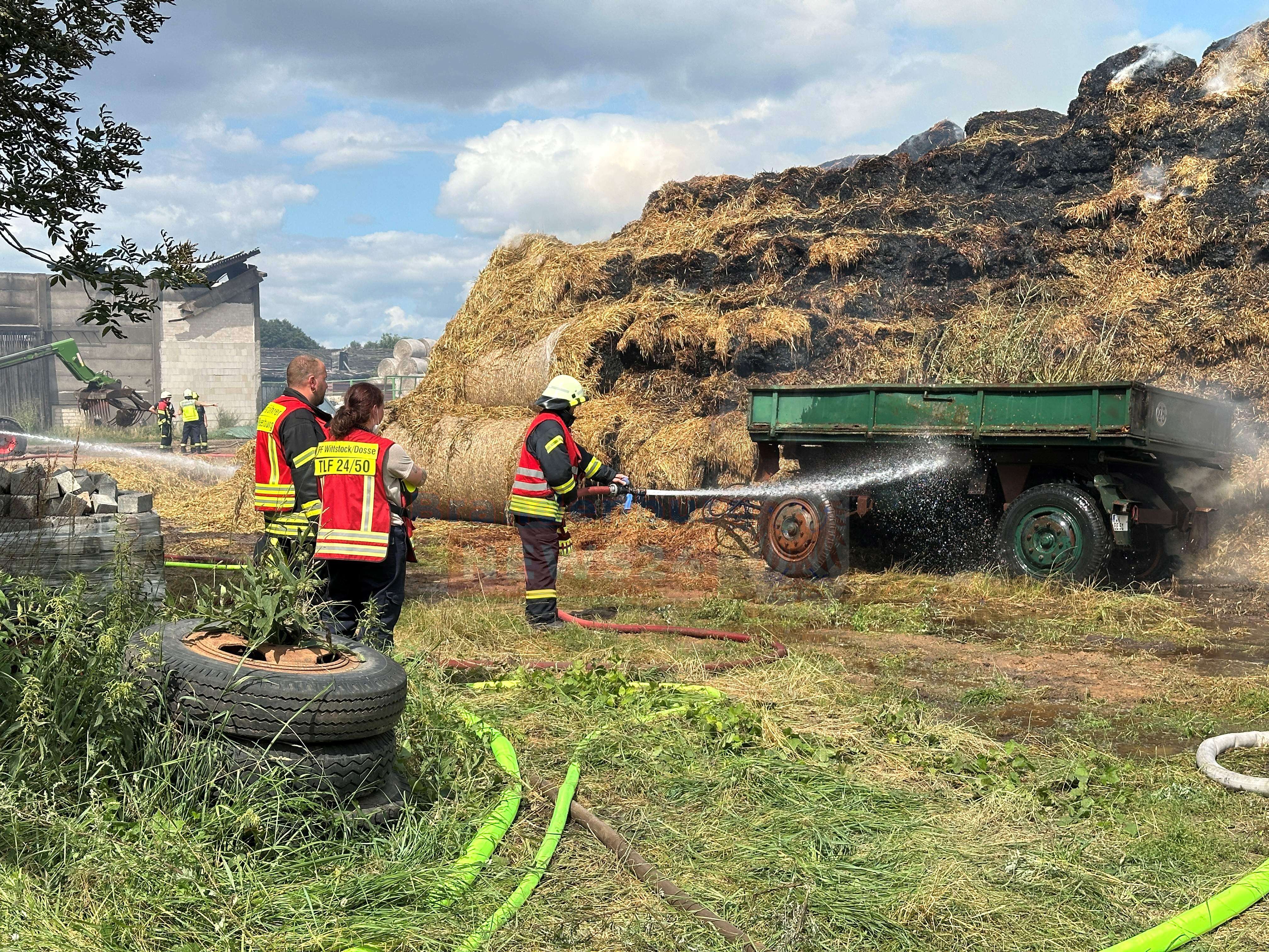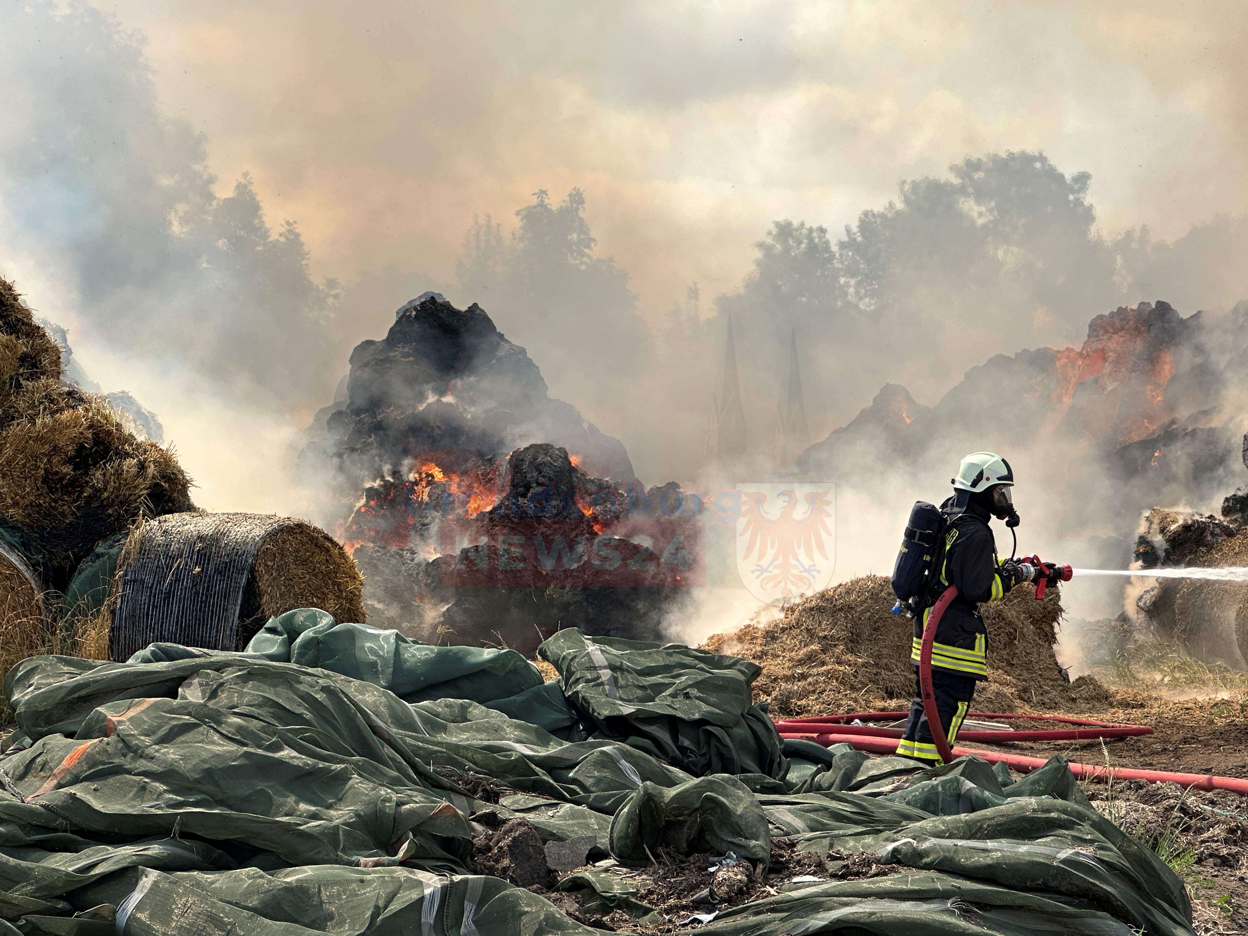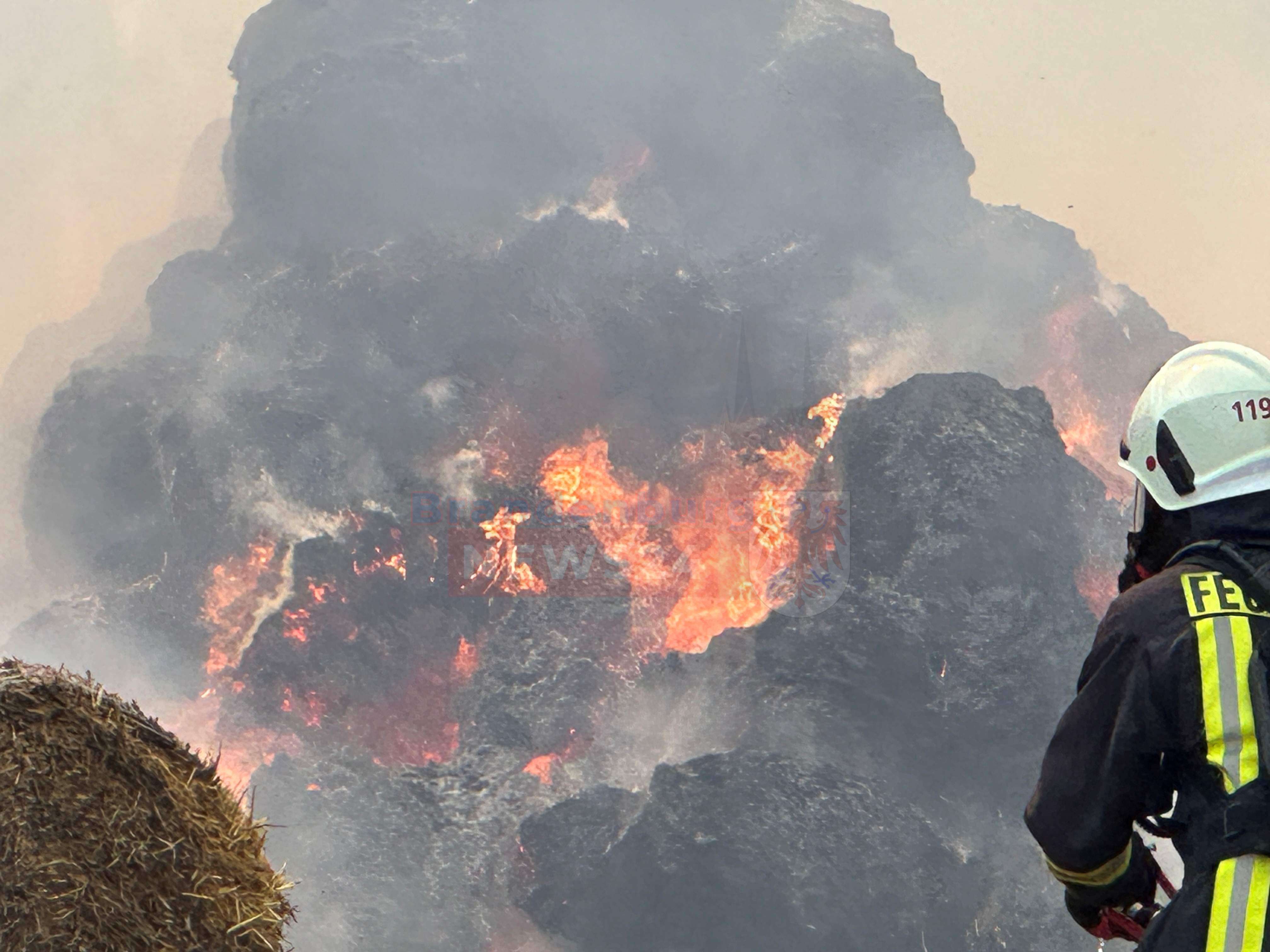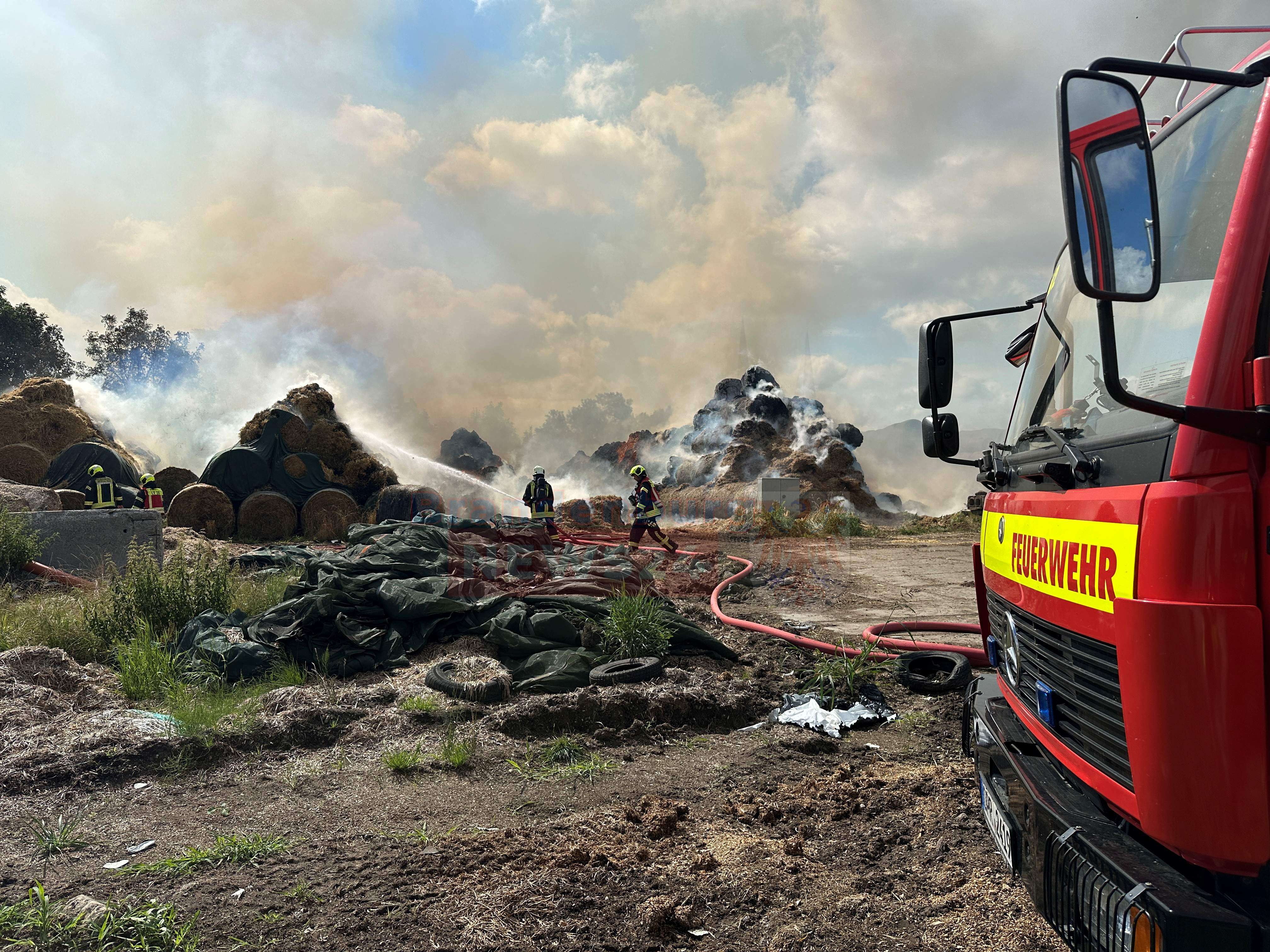 Die Feuerwehr rückte mit einem Großaufgebot an, doch die Löscharbeiten gestalteten sich äußerst schwierig. Das eingestürzte Dach erschwerte den Zugang zu den Brandherden erheblich, und die Flammen griffen im Laufe des Nachmittags auf in der Umgebung gestapelte Strohmieten über. Mehr als 60 Einsatzkräfte kämpften unermüdlich gegen das Feuer, unterstützt von Landwirten mit Teleskopladern, die die brennenden Strohballen auseinanderzogen, um Glutnester zu bekämpfen.