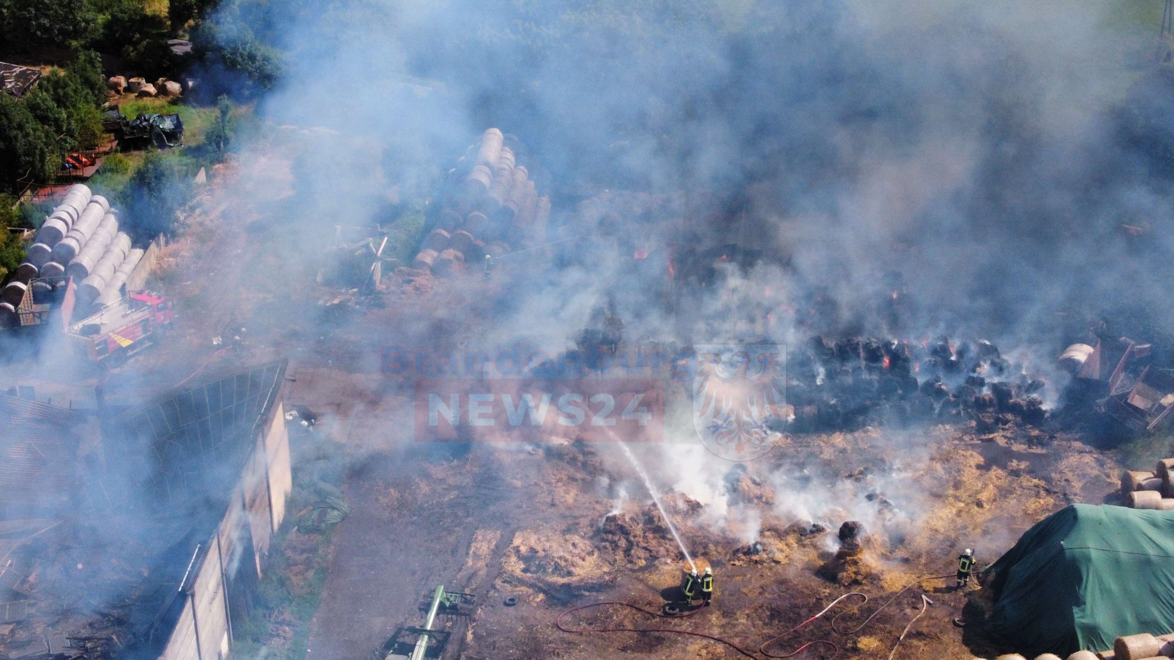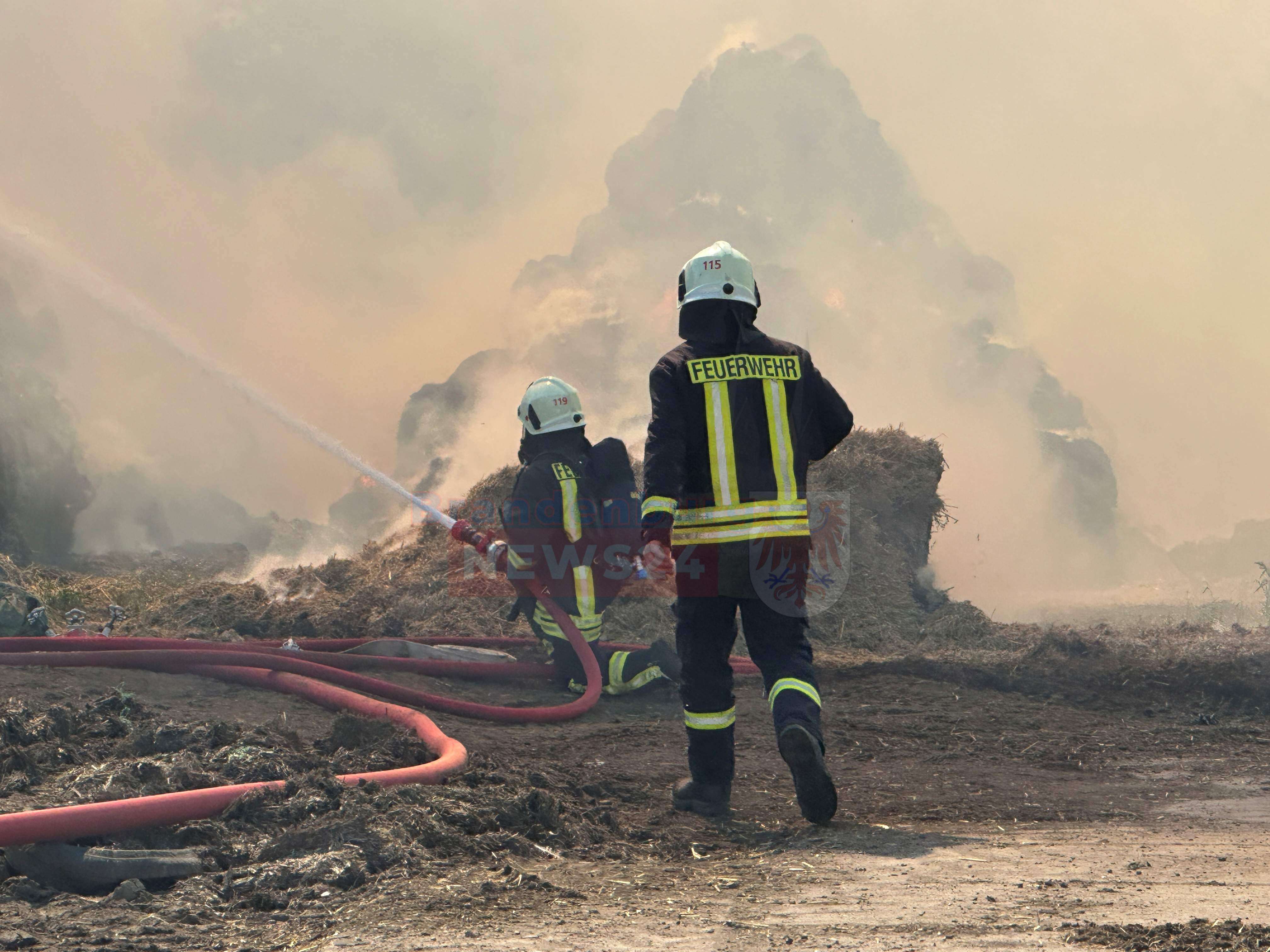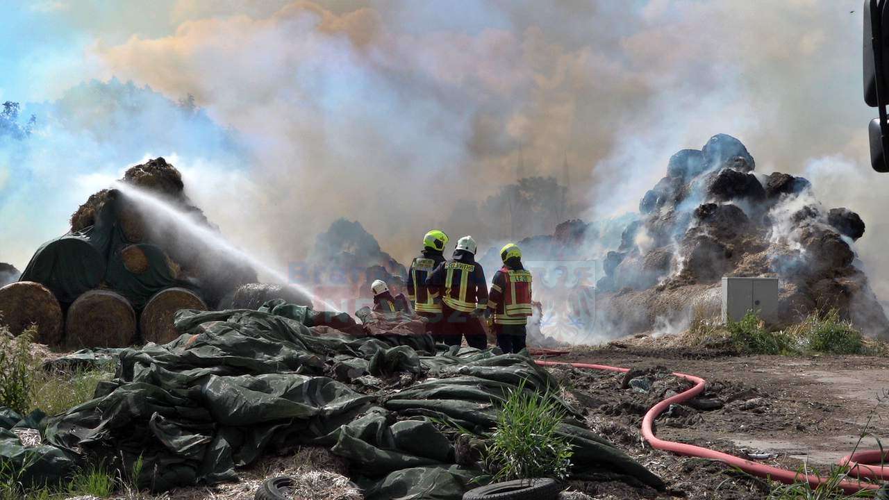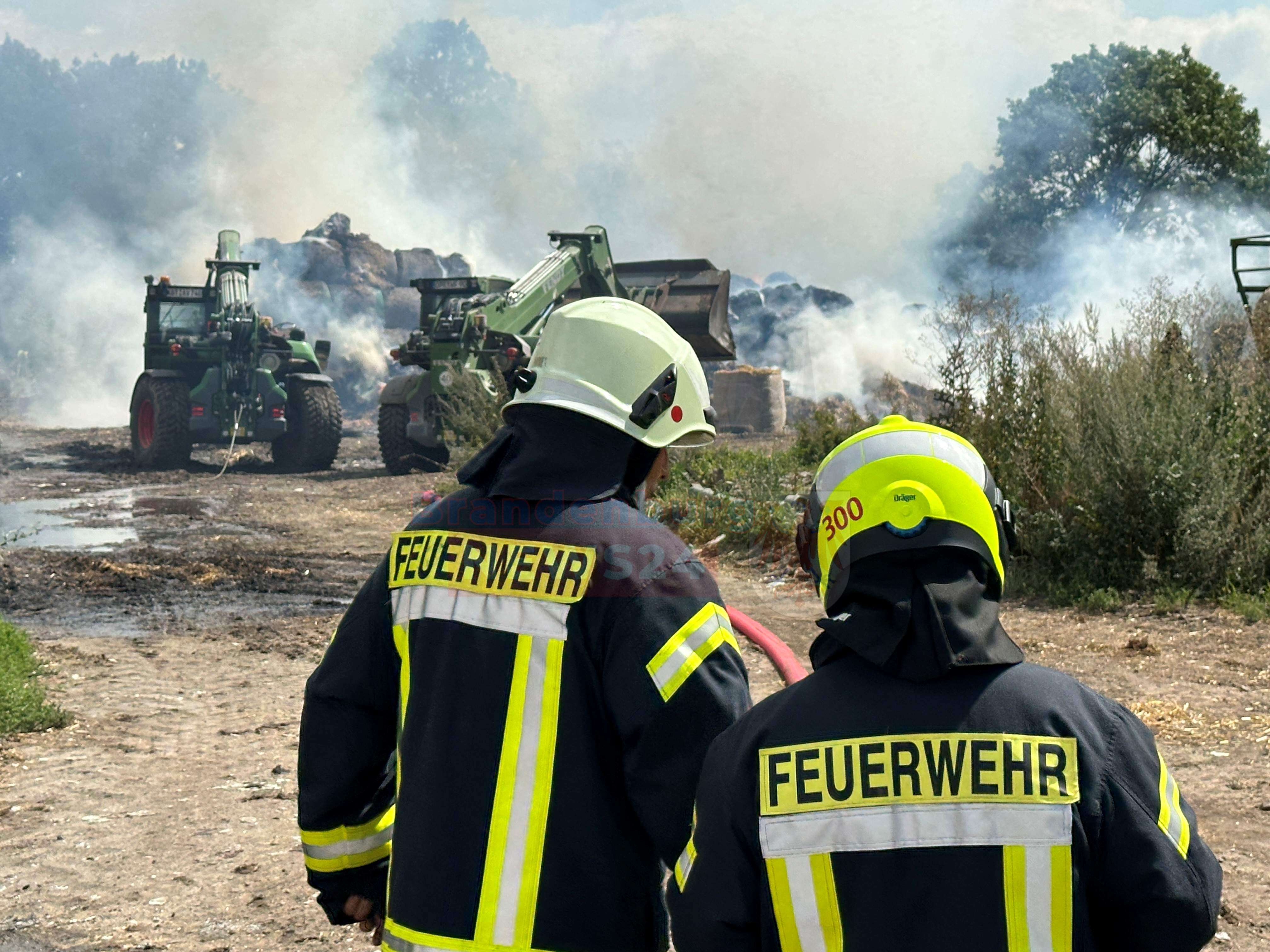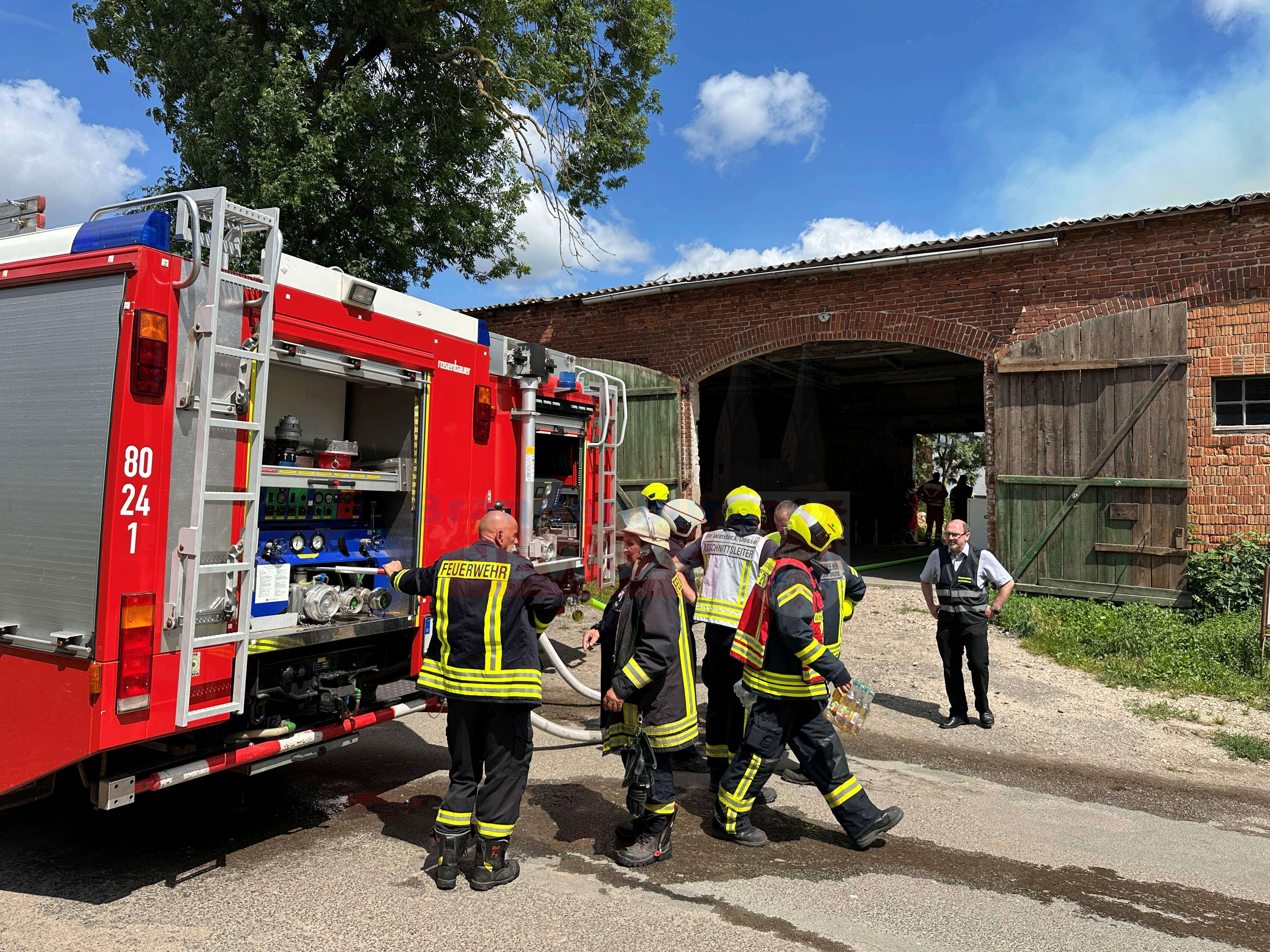 Die Feuerwehr rückte mit einem Großaufgebot an, doch die Löscharbeiten gestalteten sich äußerst schwierig. Das eingestürzte Dach erschwerte den Zugang zu den Brandherden erheblich, und die Flammen griffen im Laufe des Nachmittags auf in der Umgebung gestapelte Strohmieten über. Mehr als 60 Einsatzkräfte kämpften unermüdlich gegen das Feuer, unterstützt von Landwirten mit Teleskopladern, die die brennenden Strohballen auseinanderzogen, um Glutnester zu bekämpfen.