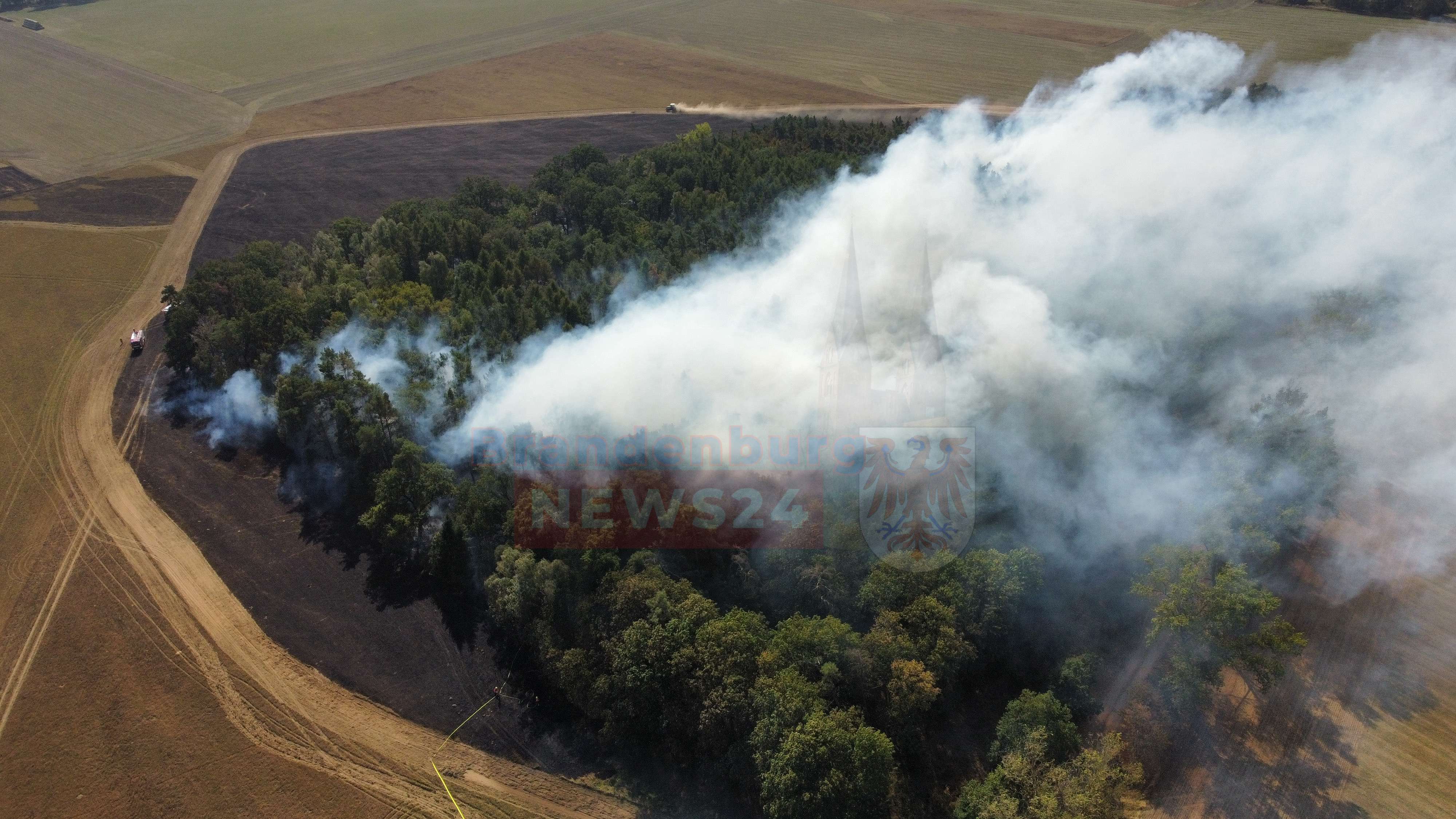 Gottberg - Ein Waldbrand hat am Freitagvormittag bei Gottberg einen Großeinsatz der Feuerwehr ausgelöst. Ausgelöst durch Funkenflug bei Erntearbeiten, breitete sich das Feuer rasch auf eine Fläche von insgesamt 7 Hektar aus. Die Rauchwolke war kilometerweit sichtbar, Anwohner wurden zeitweise aufgefordert, Fenster und Türen geschlossen zu halten.