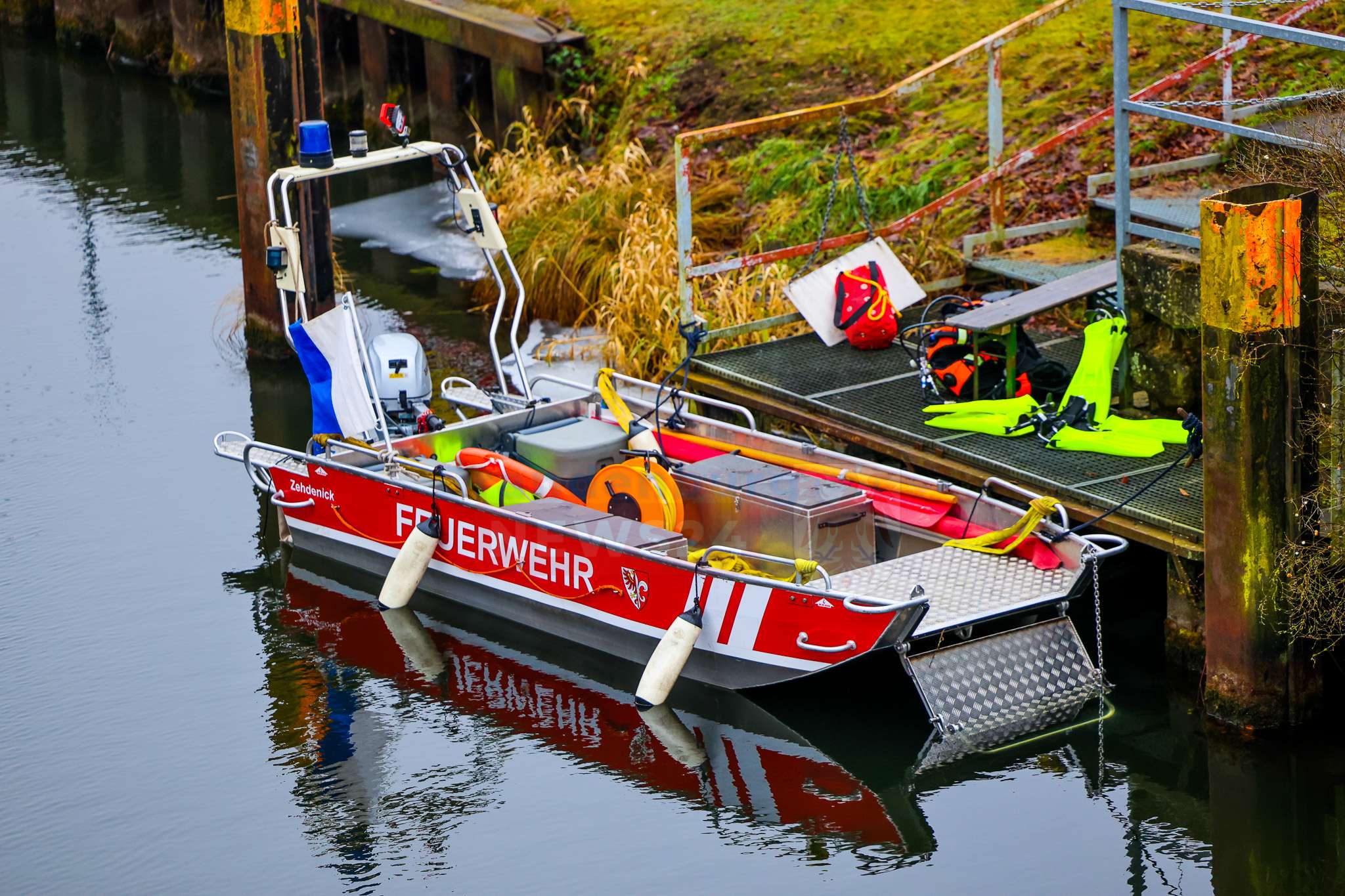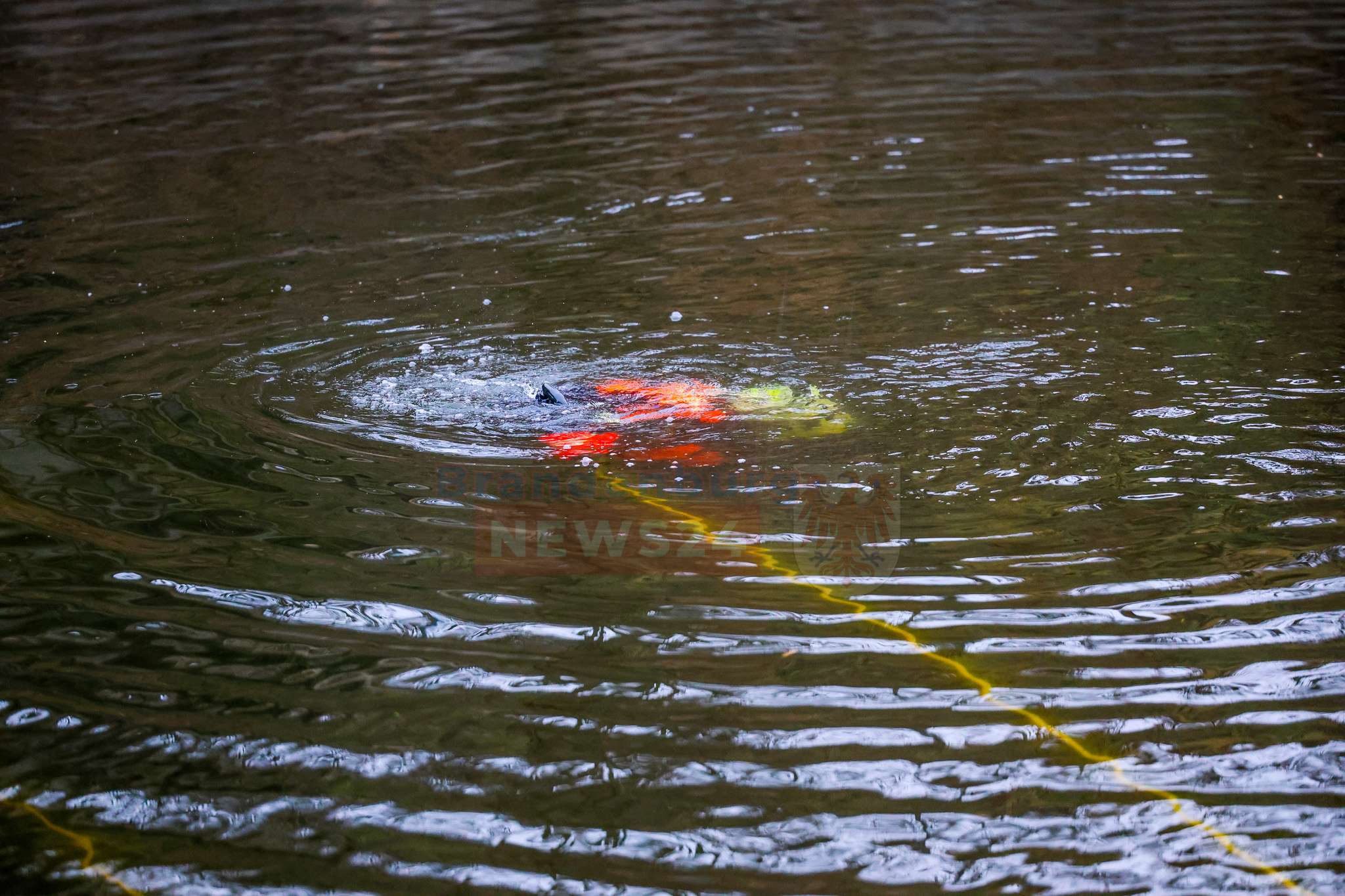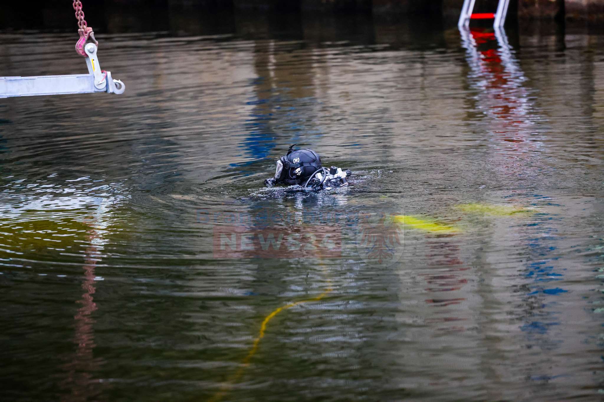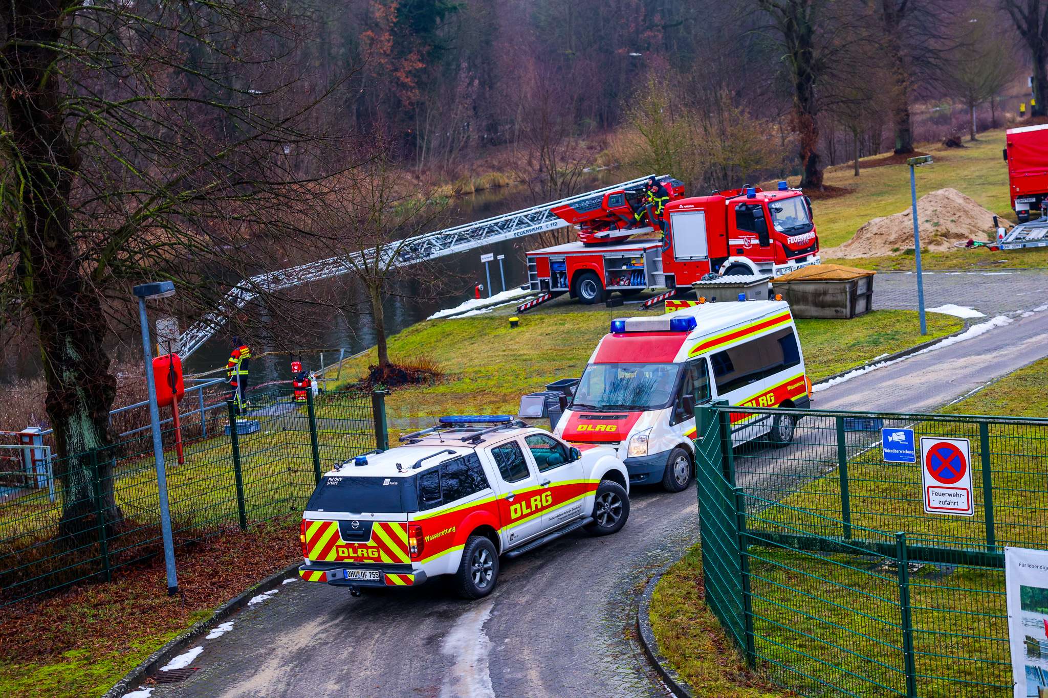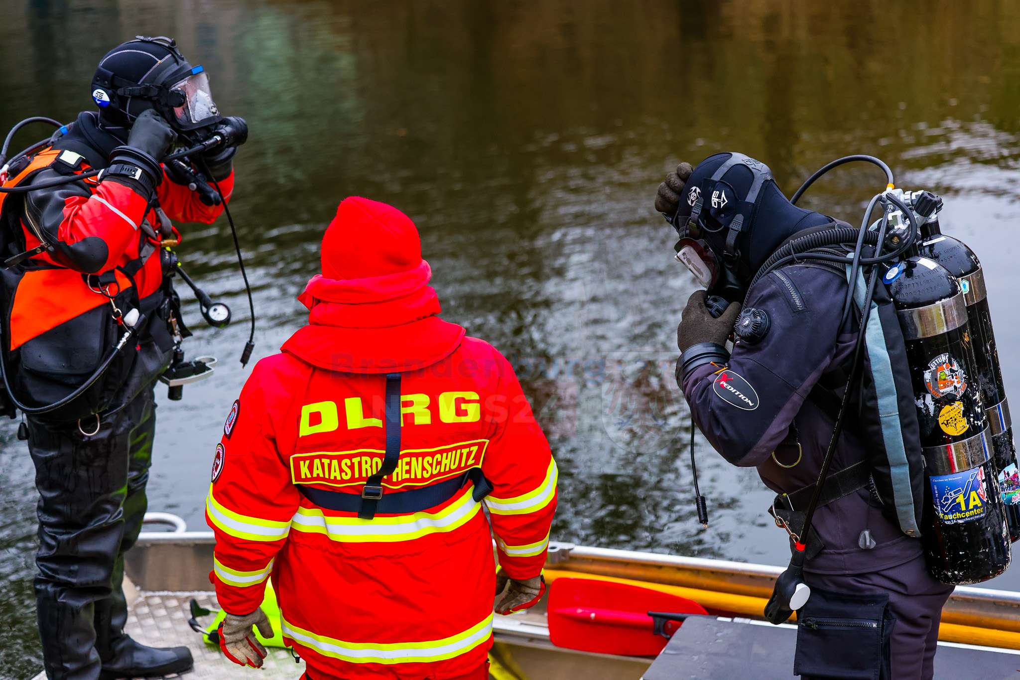 Beim Eintreffen der Feuerwehr stand die Suche nach möglichen Insassen im Vordergrund. Einsatzkräfte näherten sich dem Fahrzeug zunächst mit Überlebensanzügen und kontrollierten es von oben. Da dabei keine Person festgestellt werden konnte, wurden parallel Einsatztaucher der DLRG Hennigsdorf nachalarmiert. Diese durchsuchten das Fahrzeug sowie den Nahbereich im Wasser sorgfältig. Auch hier bestätigte sich: Es befanden sich keine Personen im oder am Pkw.