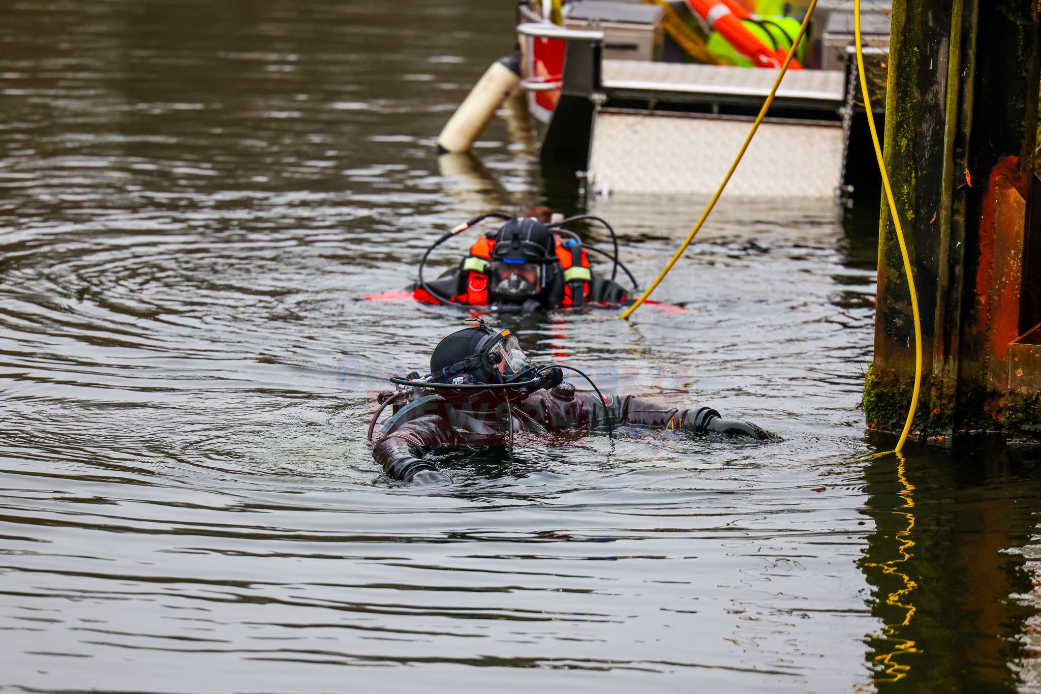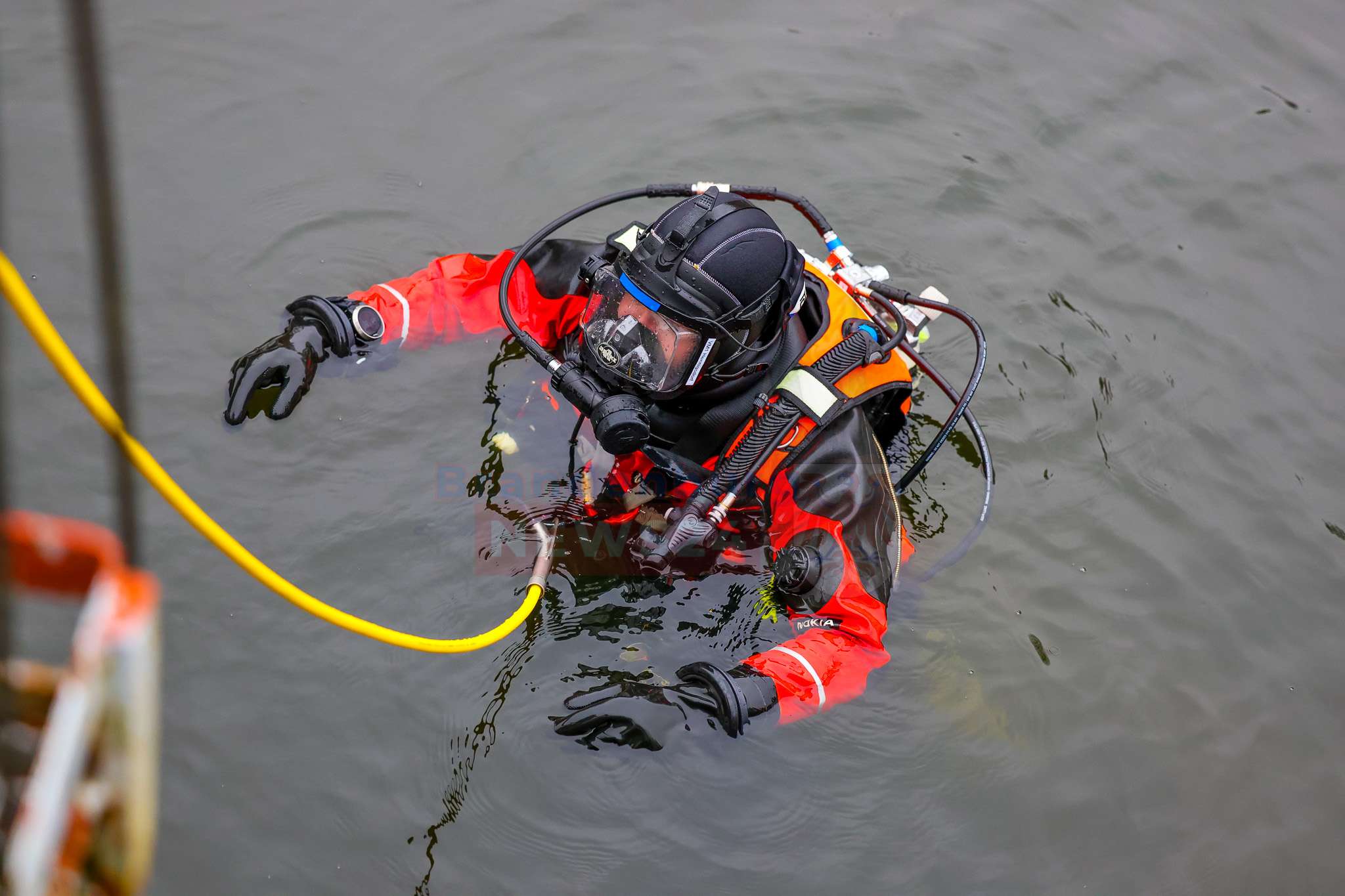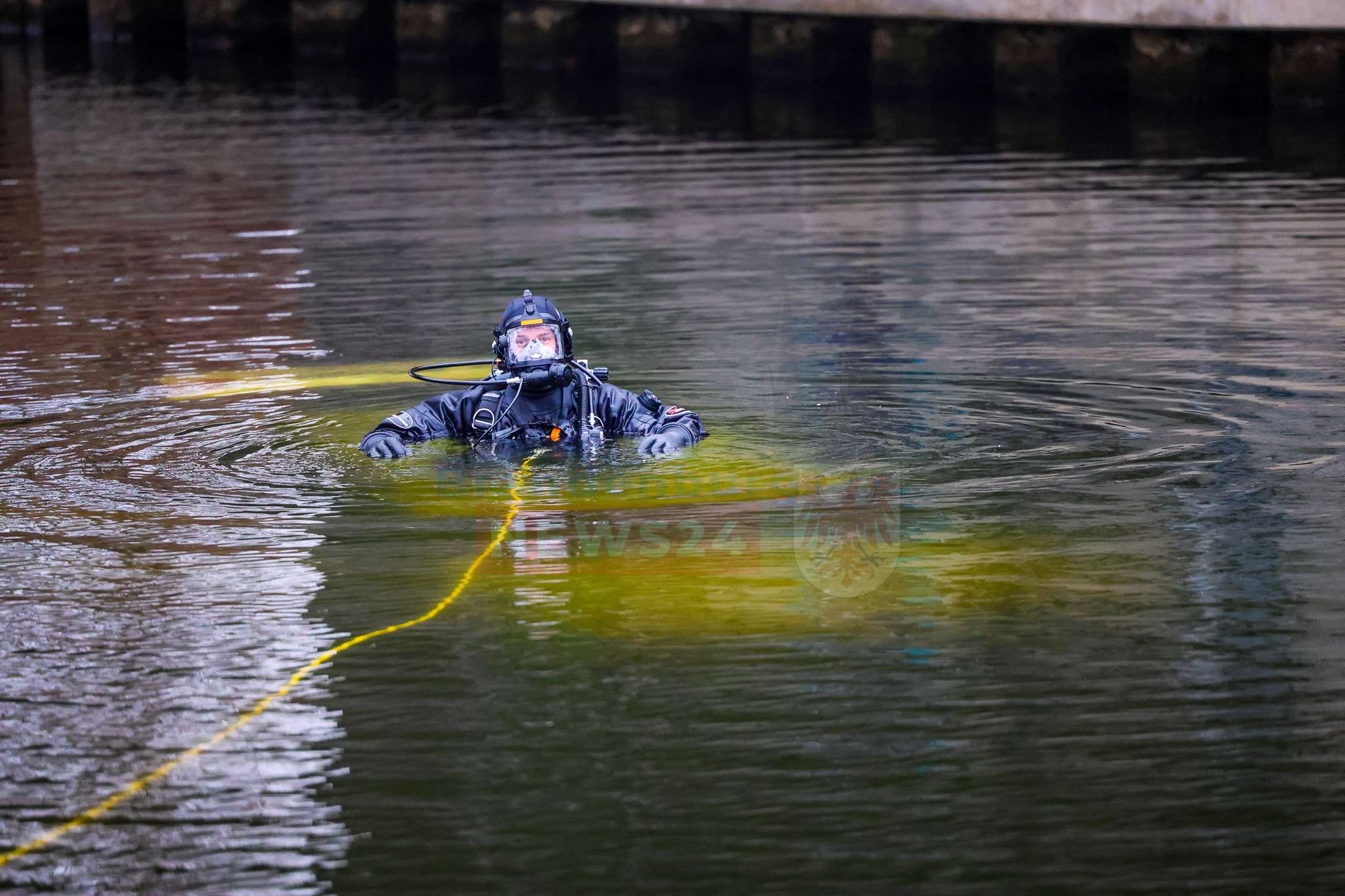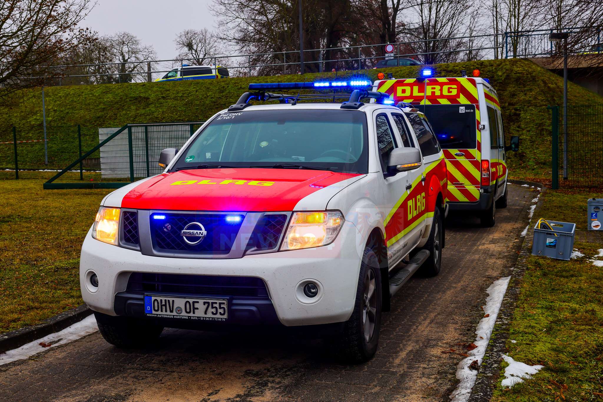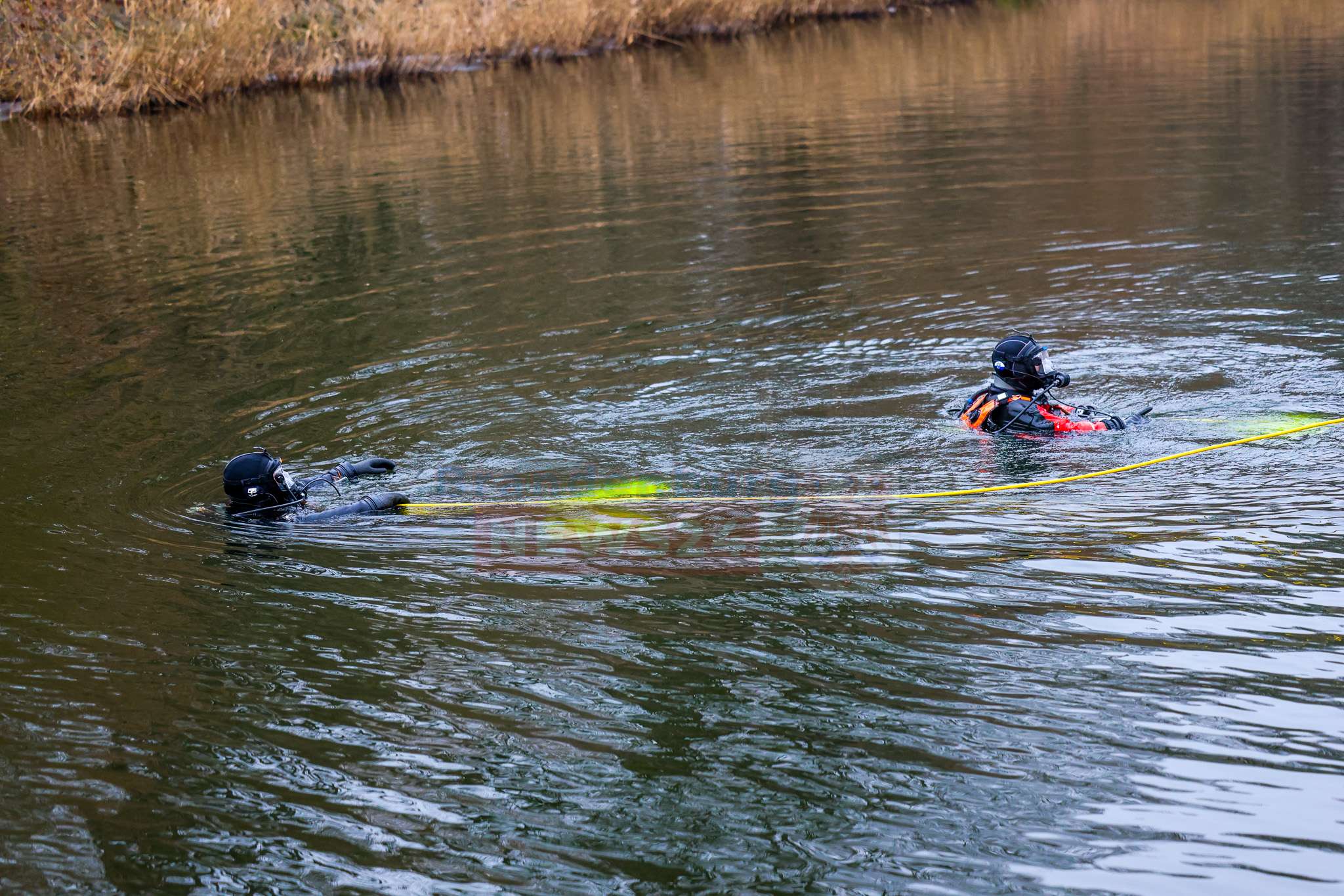 Beim Eintreffen der Feuerwehr stand die Suche nach möglichen Insassen im Vordergrund. Einsatzkräfte näherten sich dem Fahrzeug zunächst mit Überlebensanzügen und kontrollierten es von oben. Da dabei keine Person festgestellt werden konnte, wurden parallel Einsatztaucher der DLRG Hennigsdorf nachalarmiert. Diese durchsuchten das Fahrzeug sowie den Nahbereich im Wasser sorgfältig. Auch hier bestätigte sich: Es befanden sich keine Personen im oder am Pkw.