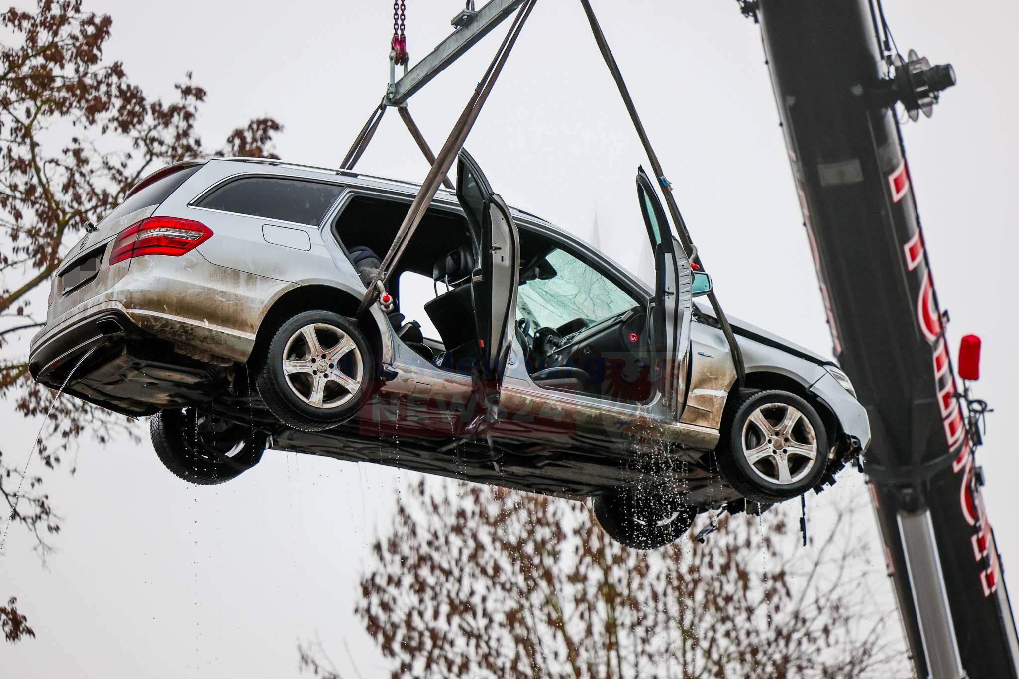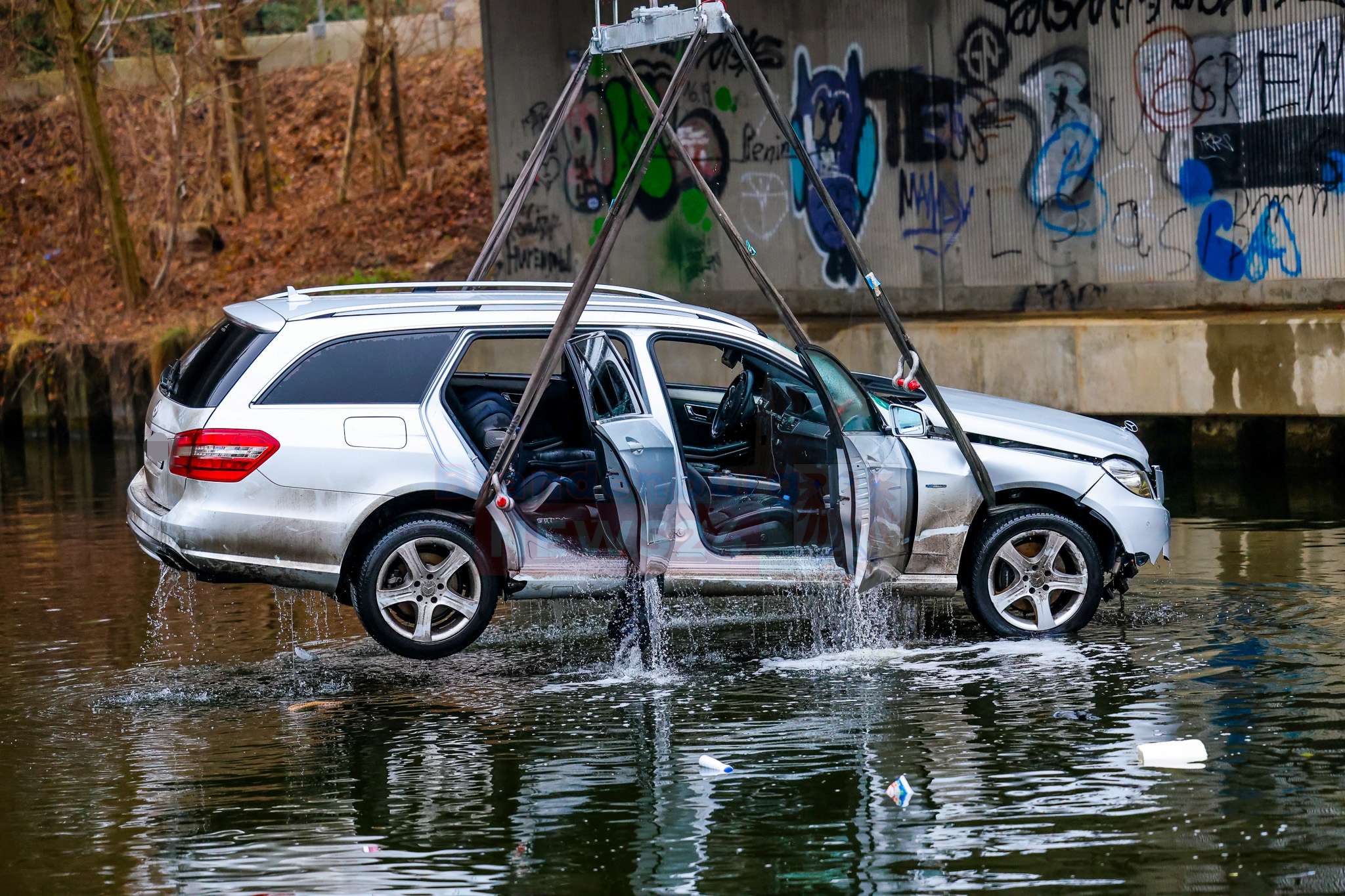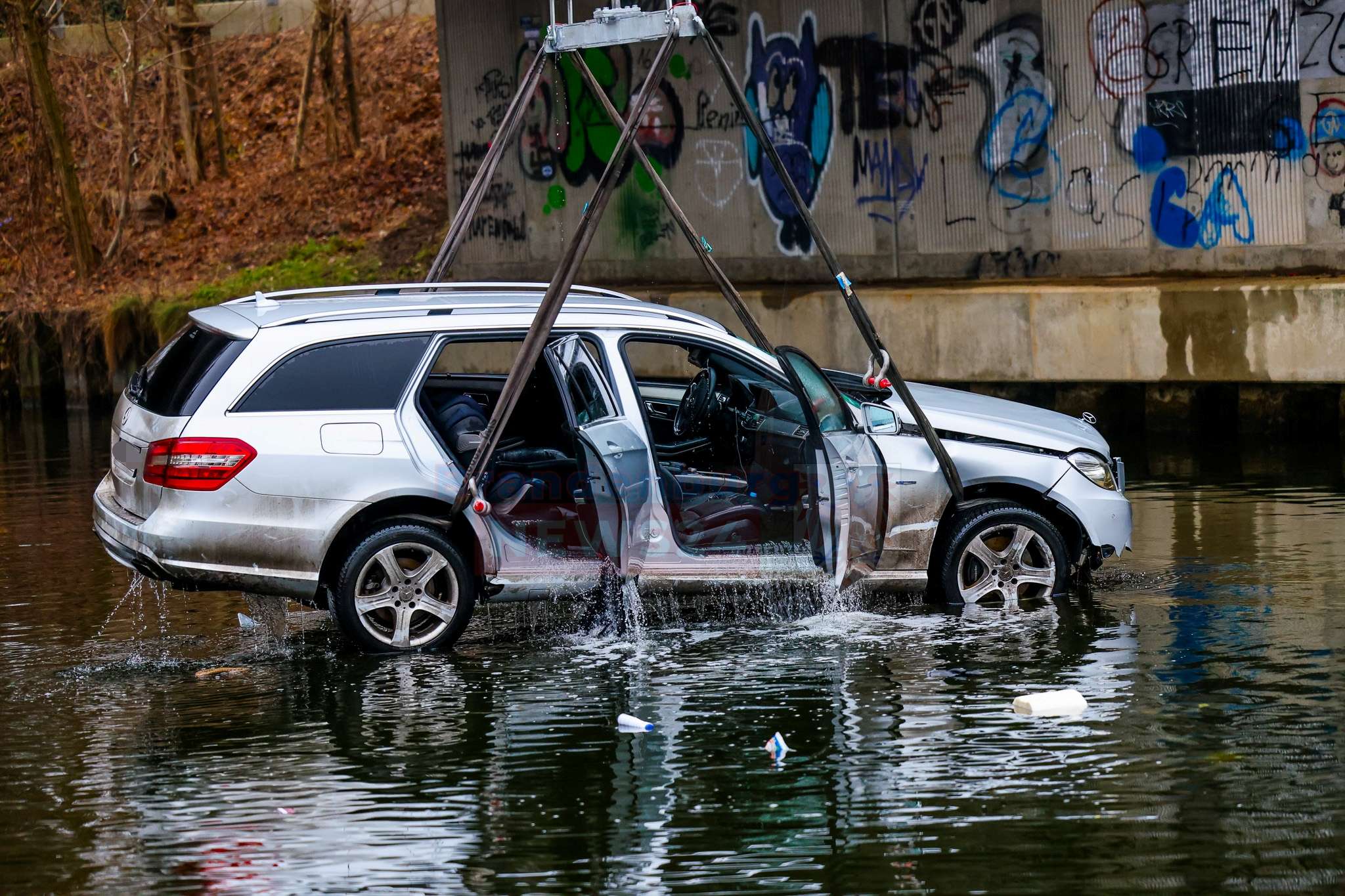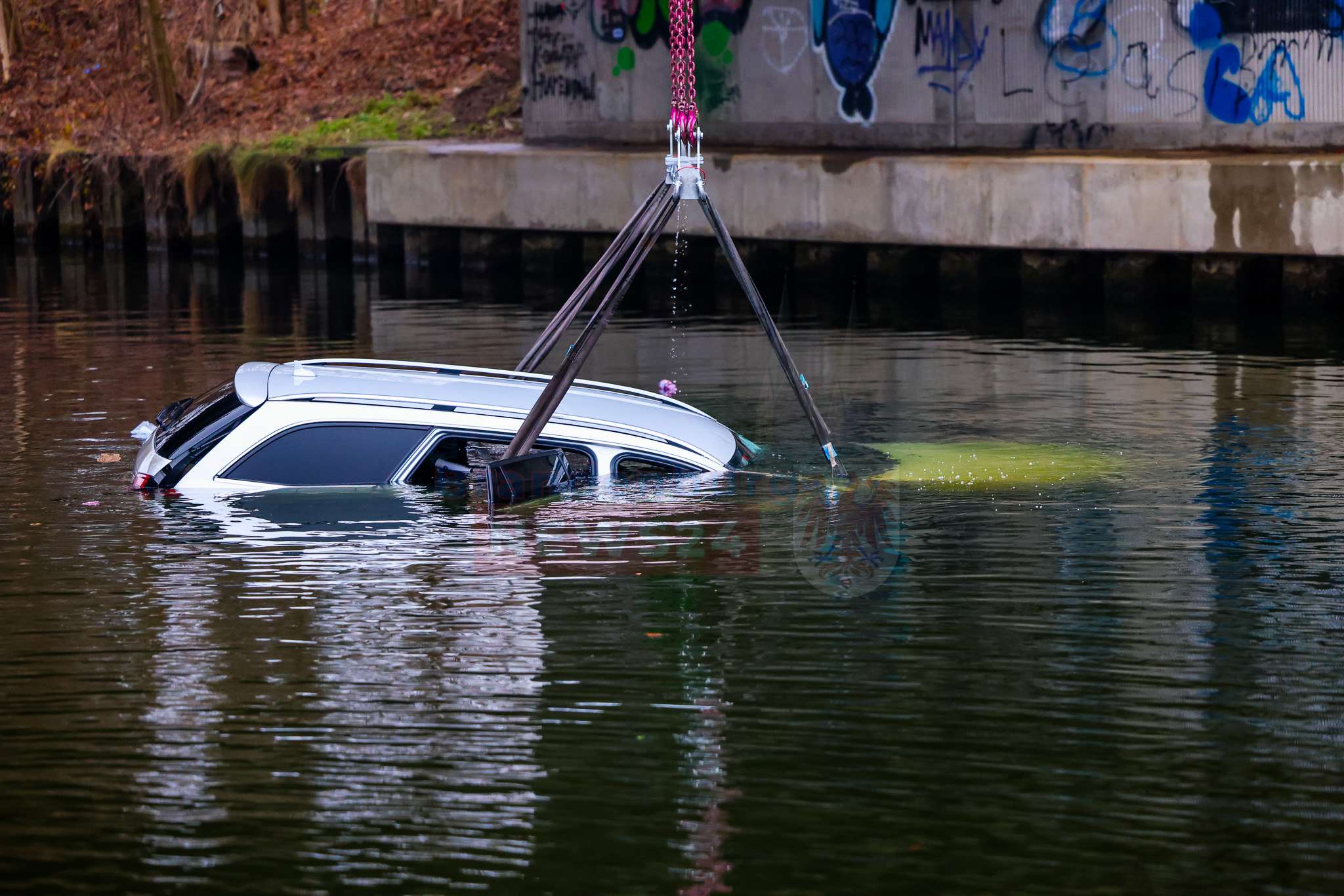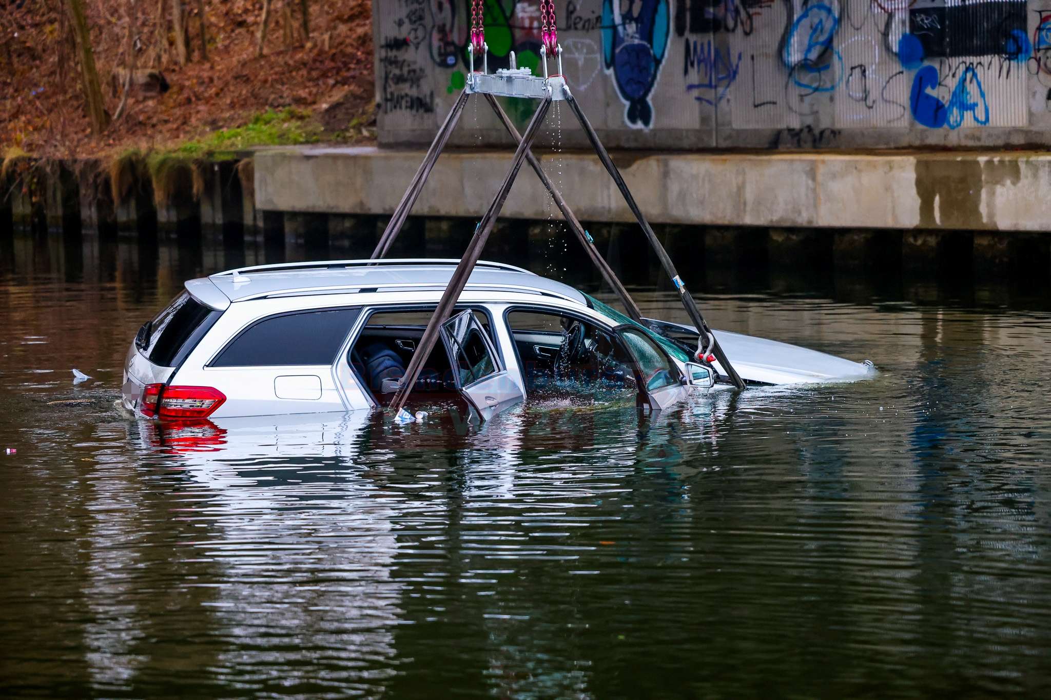 Anschließend wurde die Bergung des Fahrzeugs vorbereitet. Aufgrund der Gefahr einer Gewässerverunreinigung forderte die Einsatzleitung frühzeitig einen Kran an. Feuerwehr, DLRG und ein Bergungsunternehmen arbeiteten dabei eng und koordiniert zusammen. Der Pkw konnte schließlich aus dem Wasser geborgen werden.