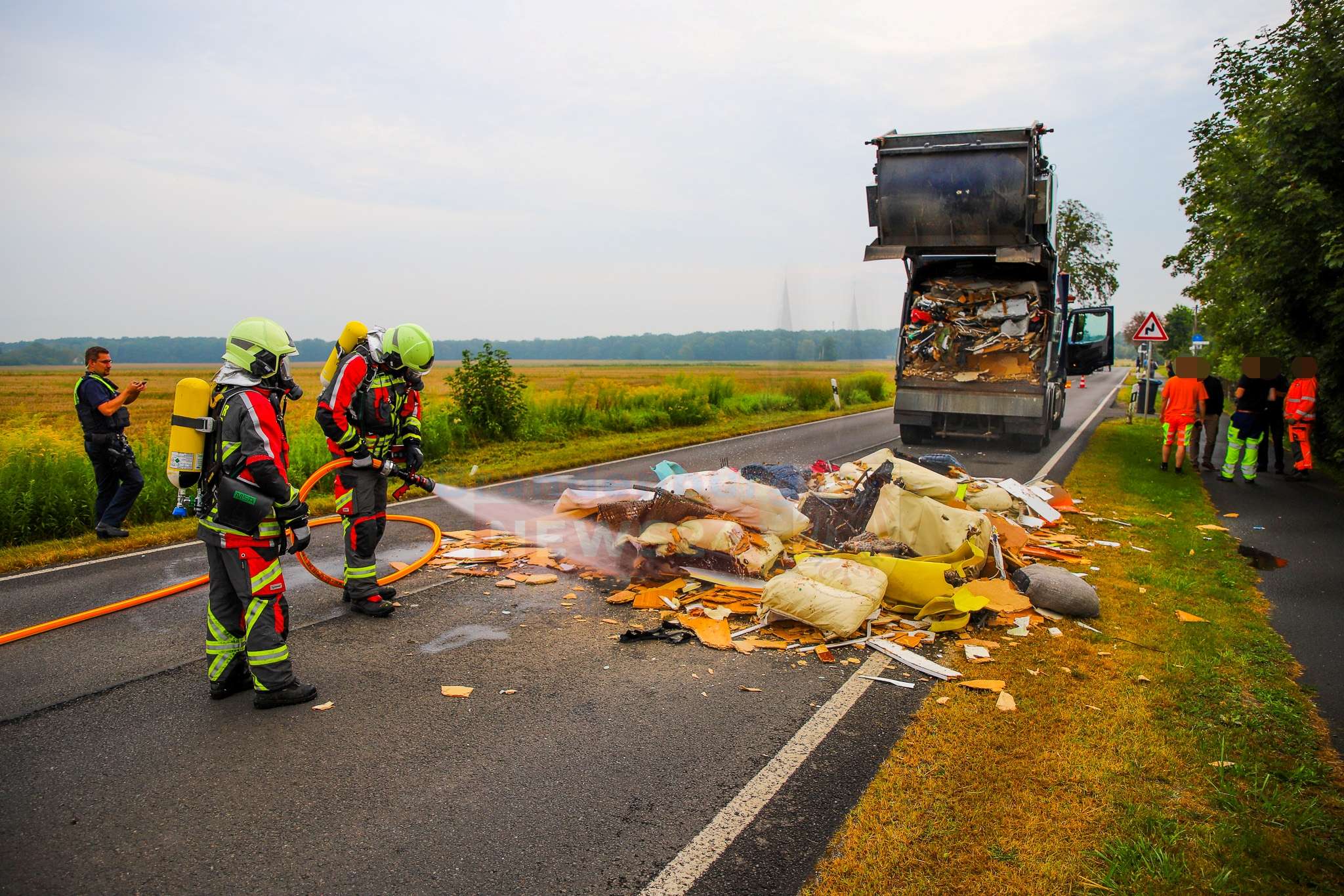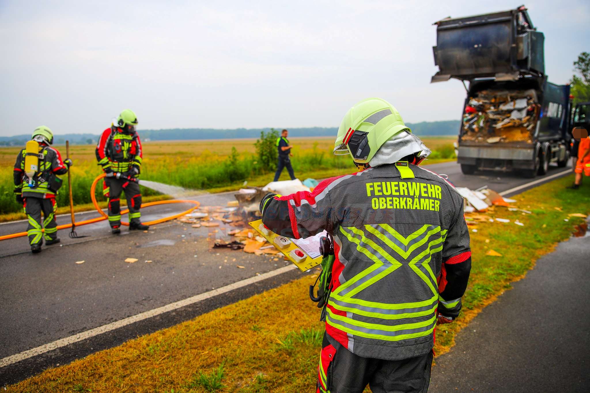 Verletzt wurde niemand. Nach ersten Erkenntnissen lösten Akkus von Batterien den Brand aus. Für die Dauer des Einsatzes musste die Straße voll gesperrt werden. Die Polizei hat die Ermittlungen aufgenommen.