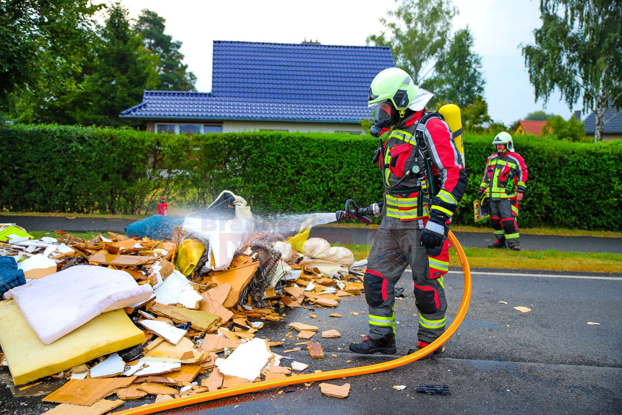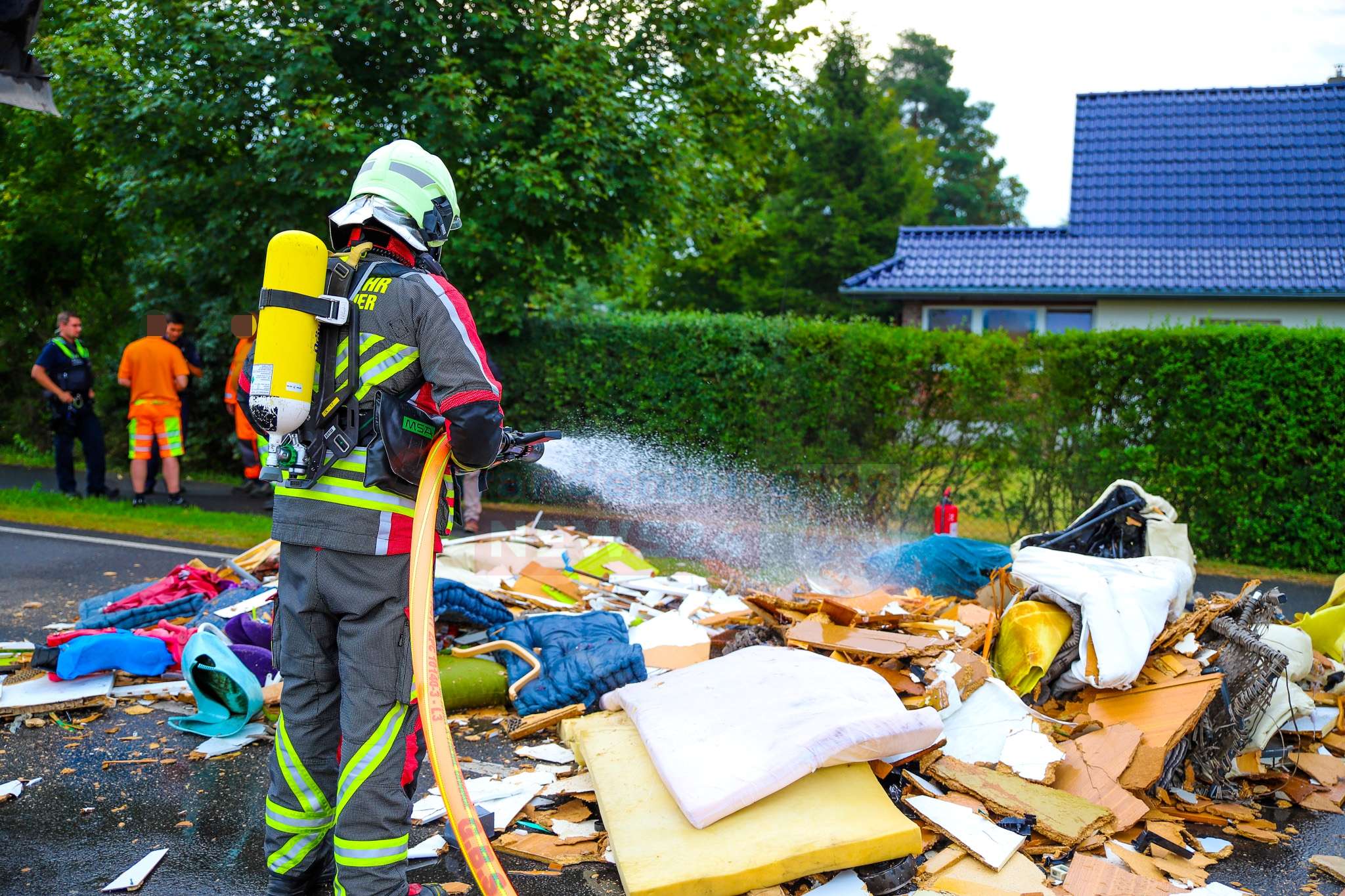 Dank ihres schnellen Handelns konnte ein größerer Schaden verhindert werden: Die Mitarbeiter kippten den brennenden Sperrmüll geistesgegenwärtig auf die Straße und alarmierten sofort die Feuerwehr.