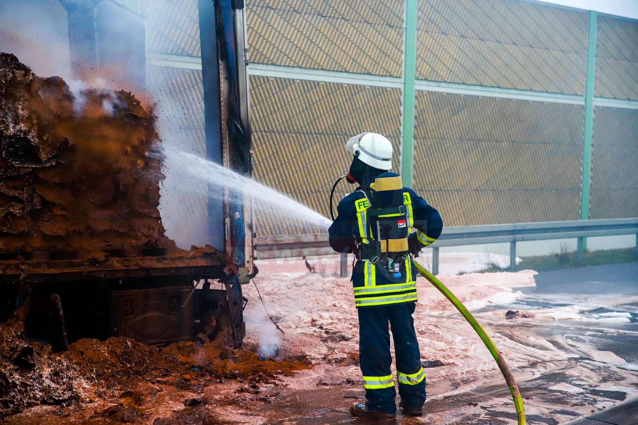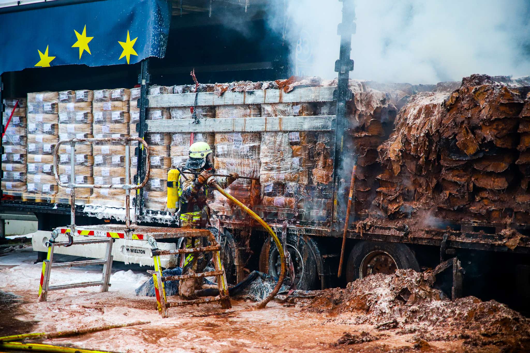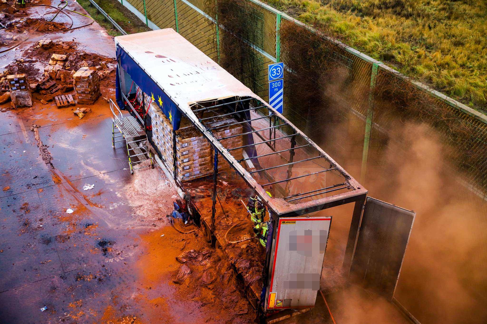 Da das Kakaopulver palettiert transportiert wurde und durch die Hitze bereits beschädigt war, verteilte sich ein Teil der Ladung großflächig auf der Fahrbahn. Für die Brandbekämpfung musste die komplette Fracht abgeladen, auseinandergerissen und einzeln abgelöscht werden.