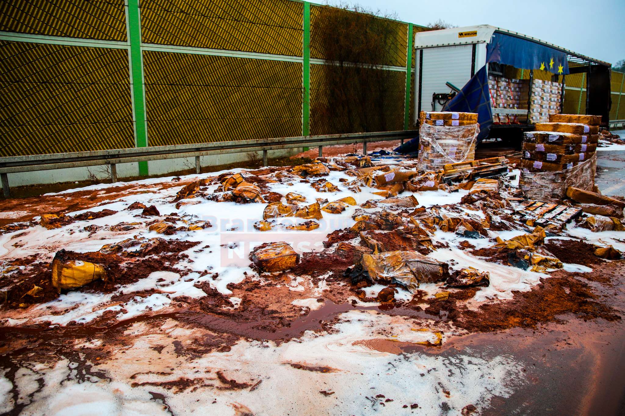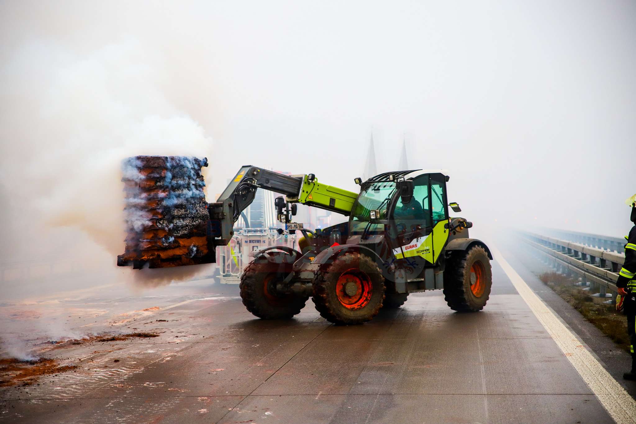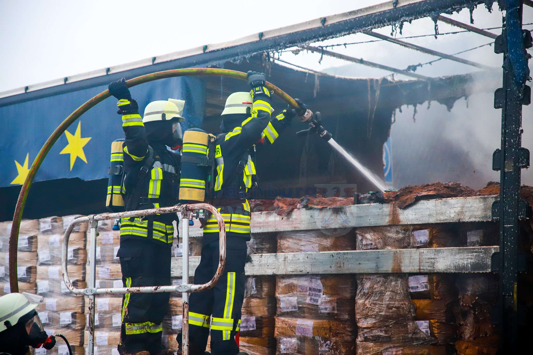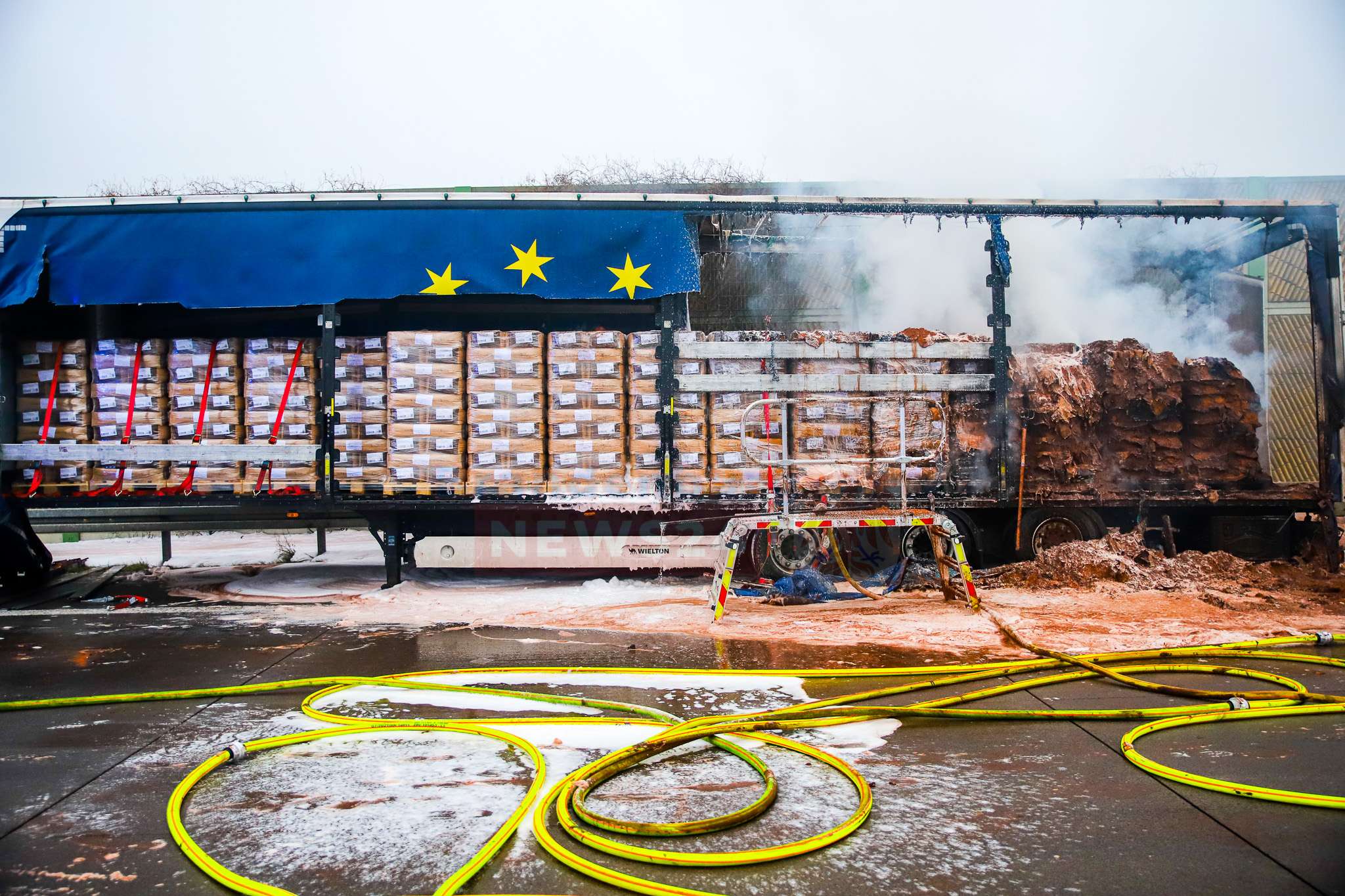 Da das Kakaopulver palettiert transportiert wurde und durch die Hitze bereits beschädigt war, verteilte sich ein Teil der Ladung großflächig auf der Fahrbahn. Für die Brandbekämpfung musste die komplette Fracht abgeladen, auseinandergerissen und einzeln abgelöscht werden.
