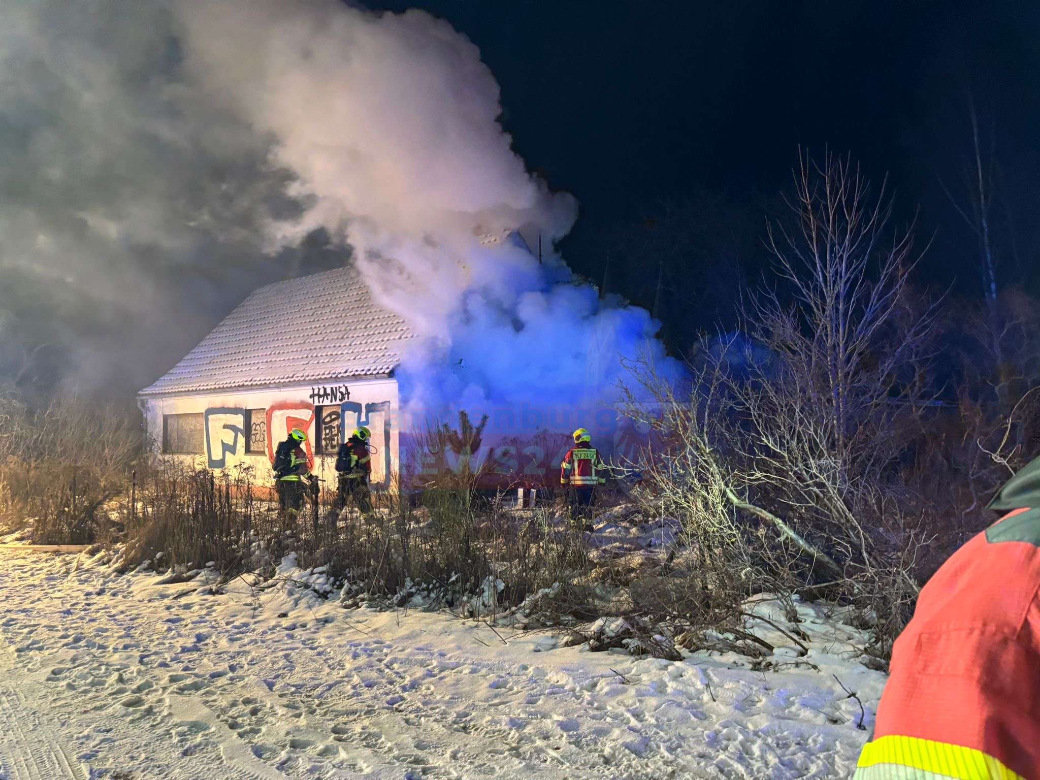 Schon bei der Anfahrt war die brenzlige Lage erkennbar – dichter Qualm hüllte das betroffene Objekt ein. Beim Eintreffen der ersten Retter stand der Vorbau des Gebäudes bereits in Flammen. Da zu diesem Zeitpunkt völlig unklar war, ob sich noch Bewohner in dem verrauchten Haus aufhielten, zögerten die Einsatzkräfte keine Sekunde.