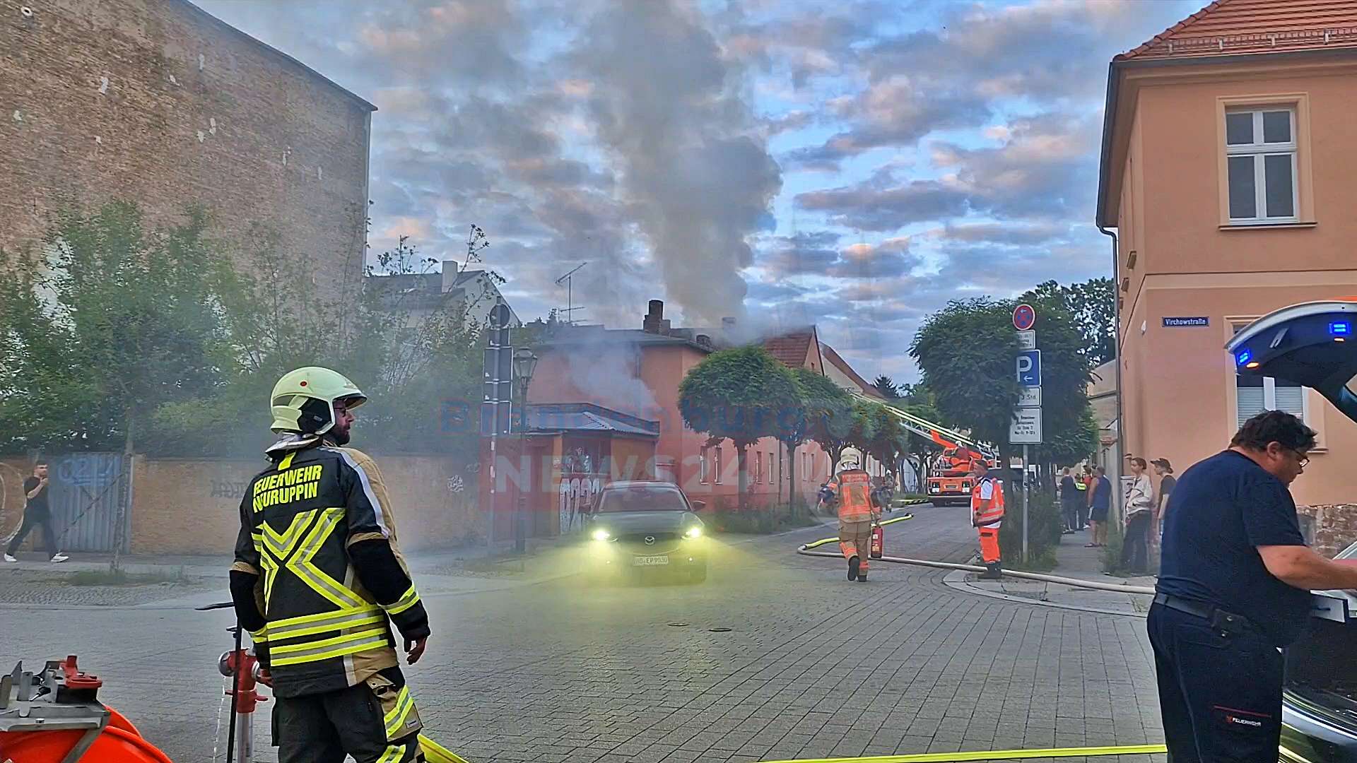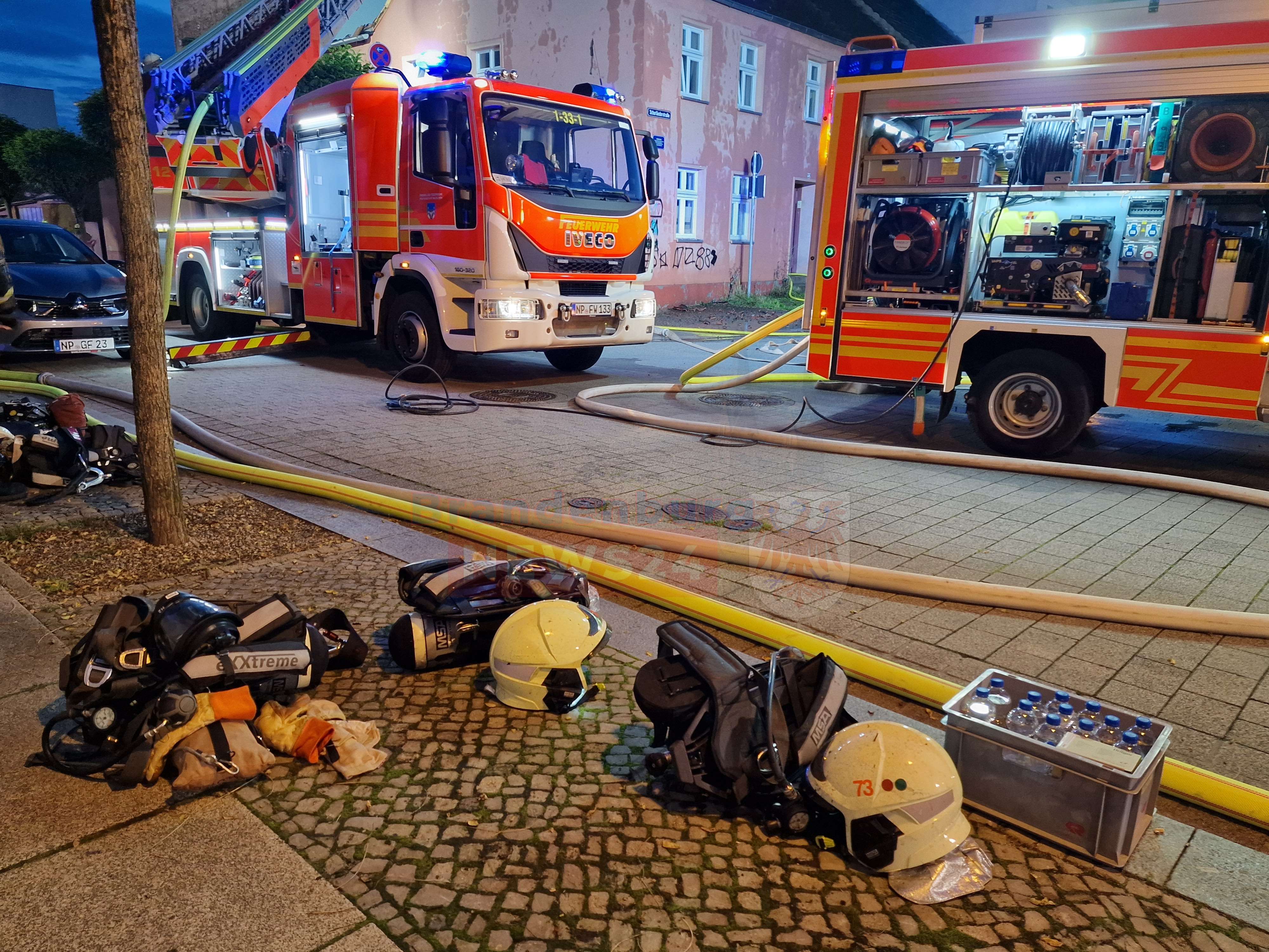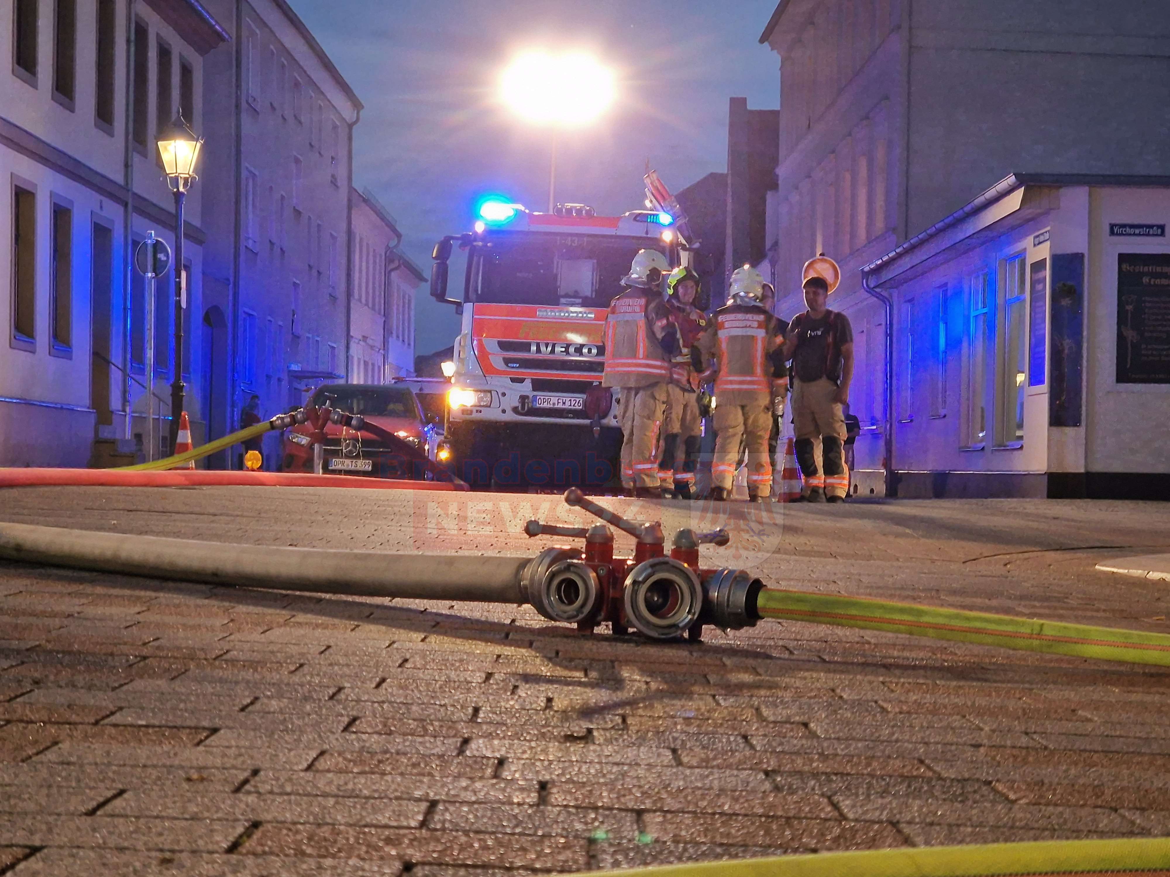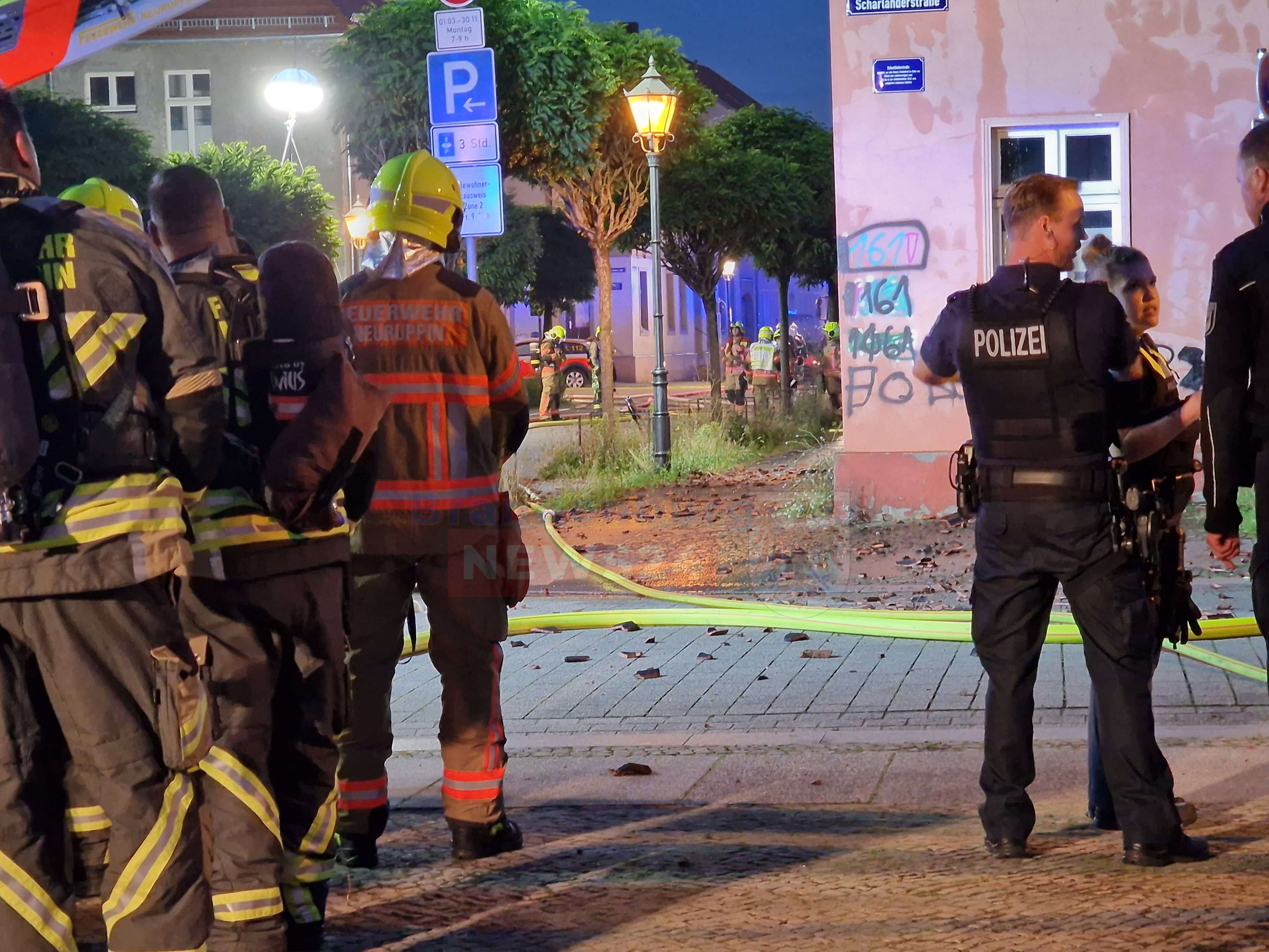 Neuruppin – Ein Großbrand in einem Eckwohnhaus in der August-Bebel-Straße hat die Neuruppiner Feuerwehr die ganze Nacht zum Sonntag in Atem gehalten. Erst um 01:45 Uhr konnte "Feuer aus!" gemeldet werden. Die Löscharbeiten gestalteten sich extrem schwierig, da das Gebäude einsturzgefährdet war. Für die Bewohner hat die Nacht dramatische Folgen: Ihre Wohnungen sind nach dem Brand unbewohnbar.