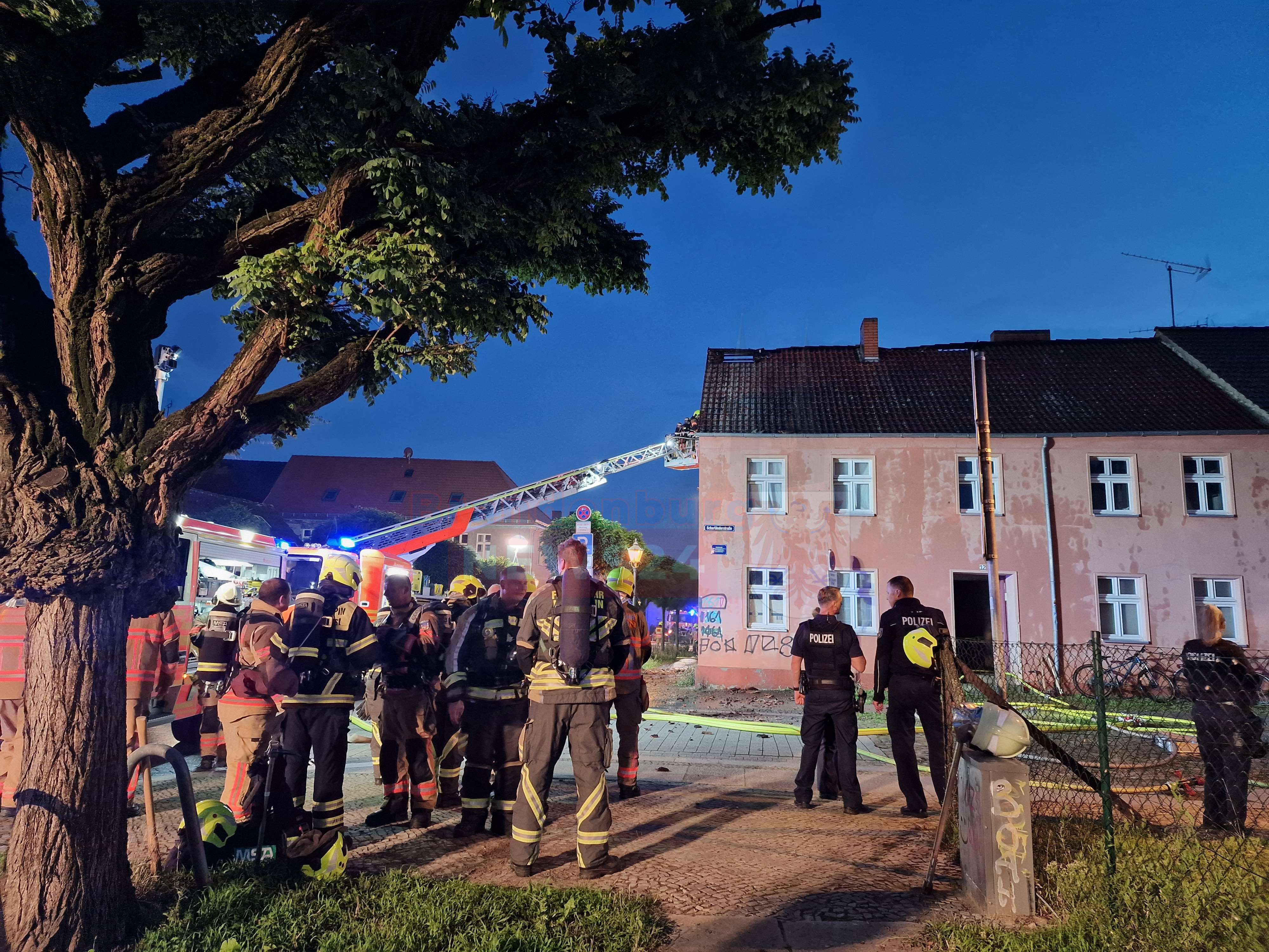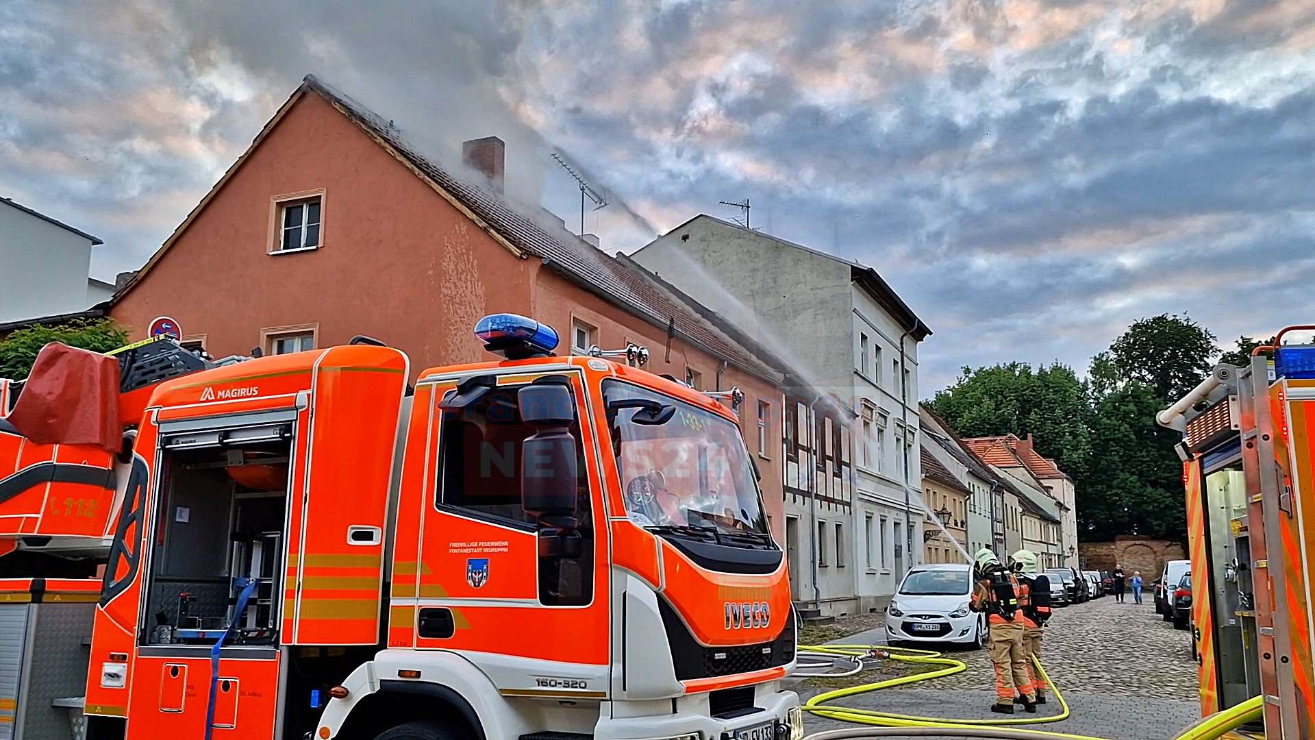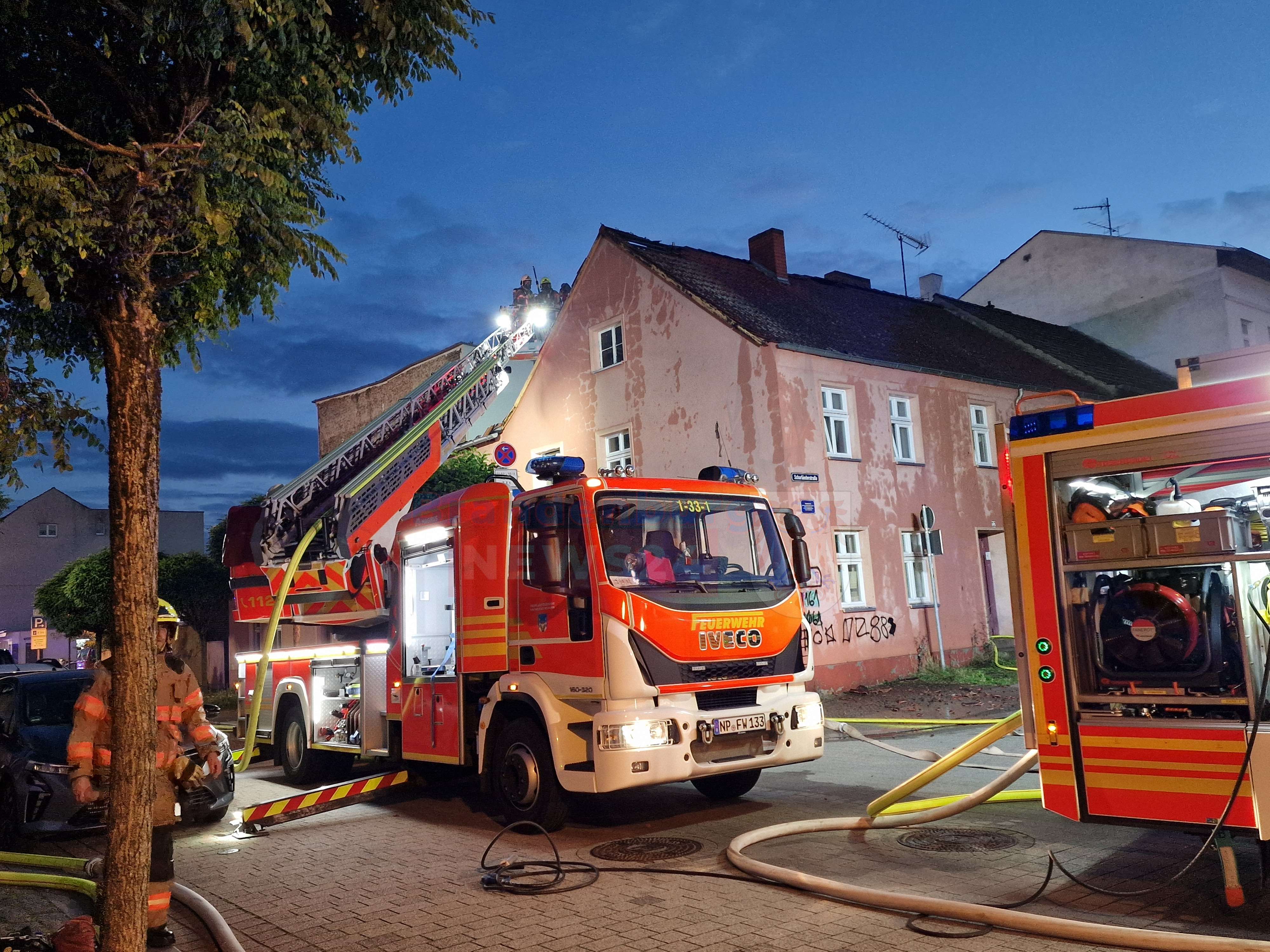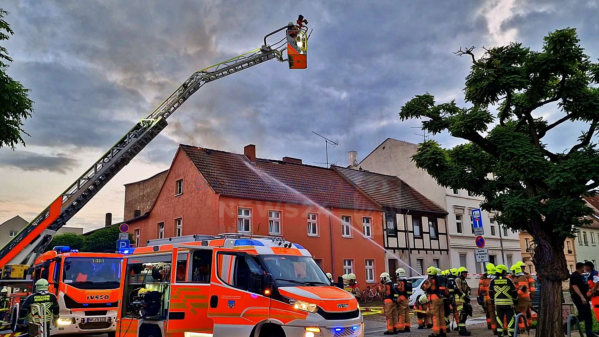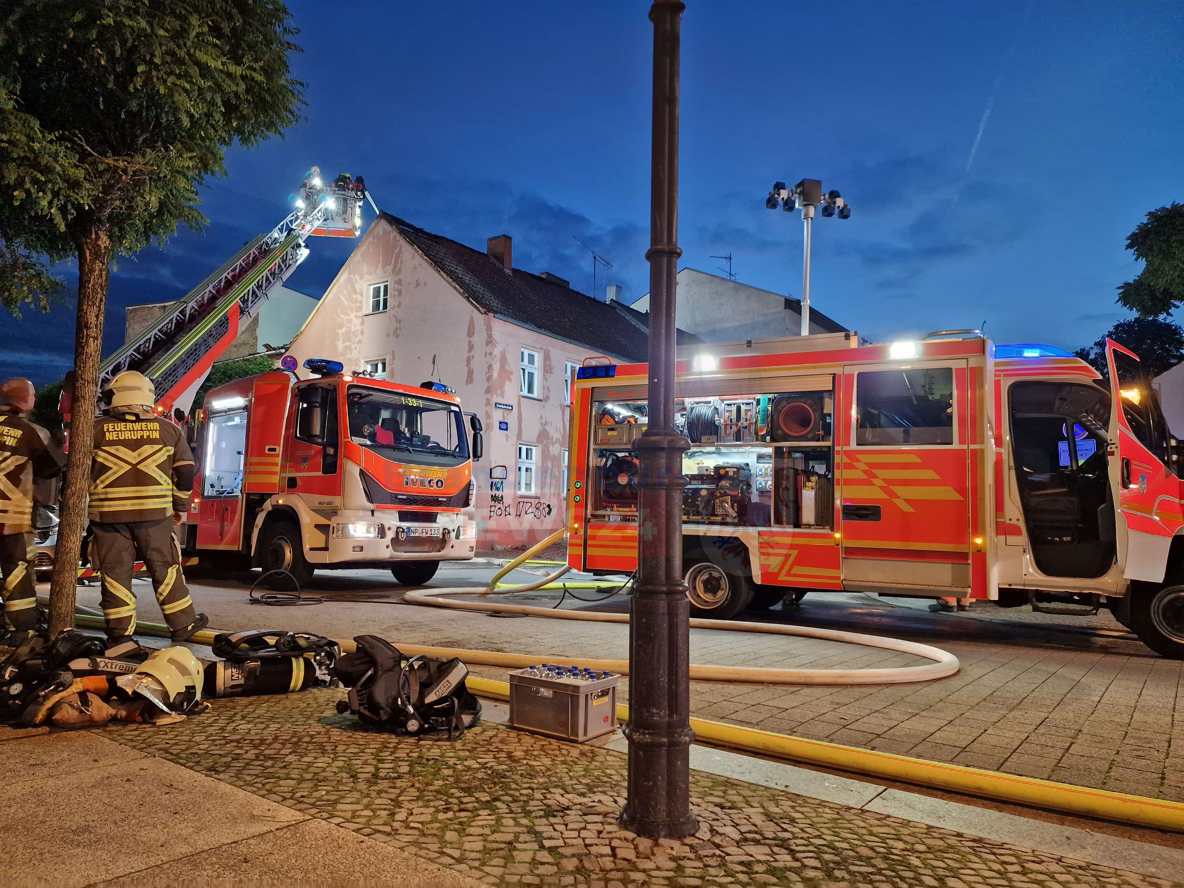 Neuruppin – Ein Großbrand in einem Eckwohnhaus in der August-Bebel-Straße hat die Neuruppiner Feuerwehr die ganze Nacht zum Sonntag in Atem gehalten. Erst um 01:45 Uhr konnte "Feuer aus!" gemeldet werden. Die Löscharbeiten gestalteten sich extrem schwierig, da das Gebäude einsturzgefährdet war. Für die Bewohner hat die Nacht dramatische Folgen: Ihre Wohnungen sind nach dem Brand unbewohnbar.