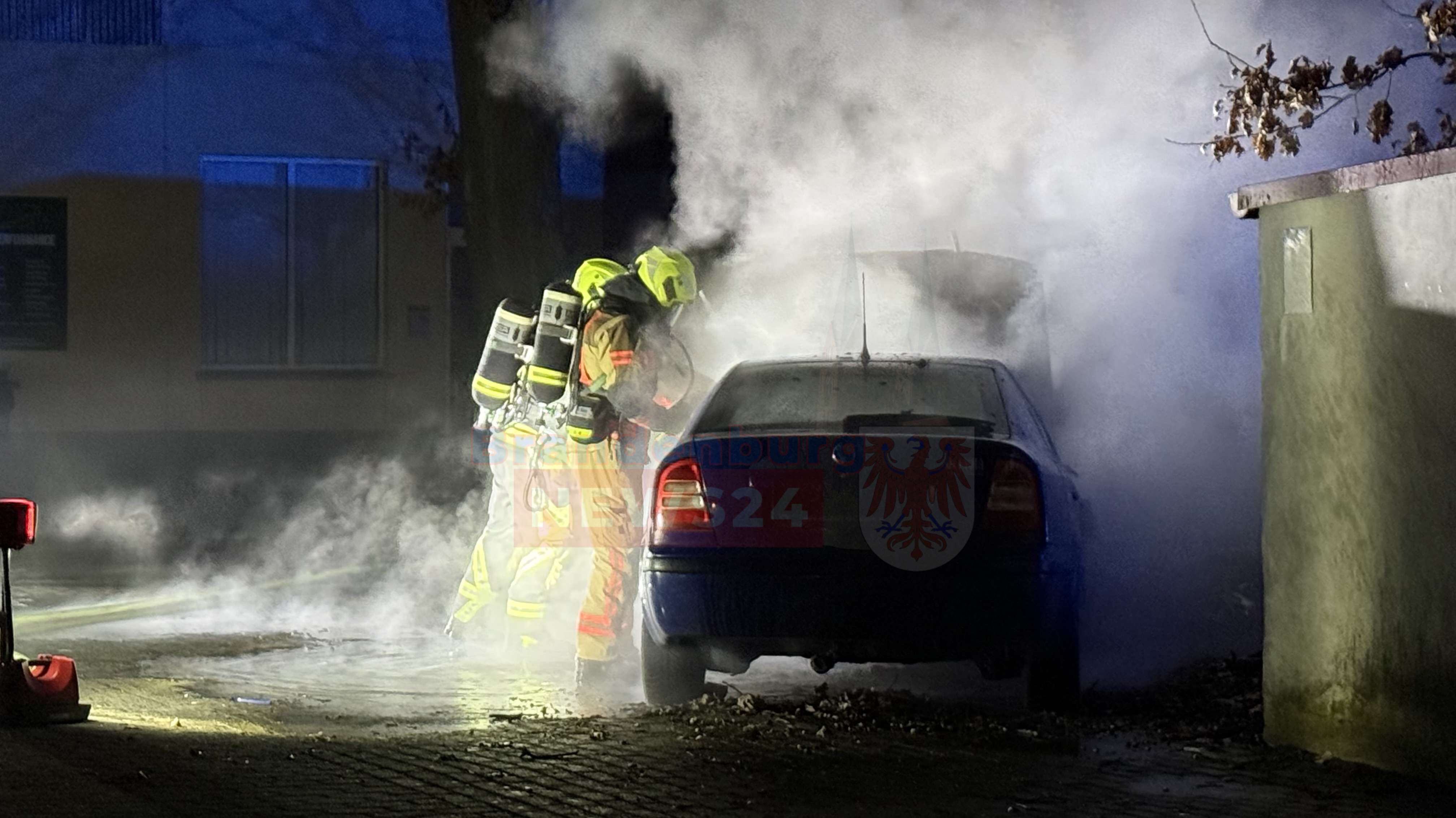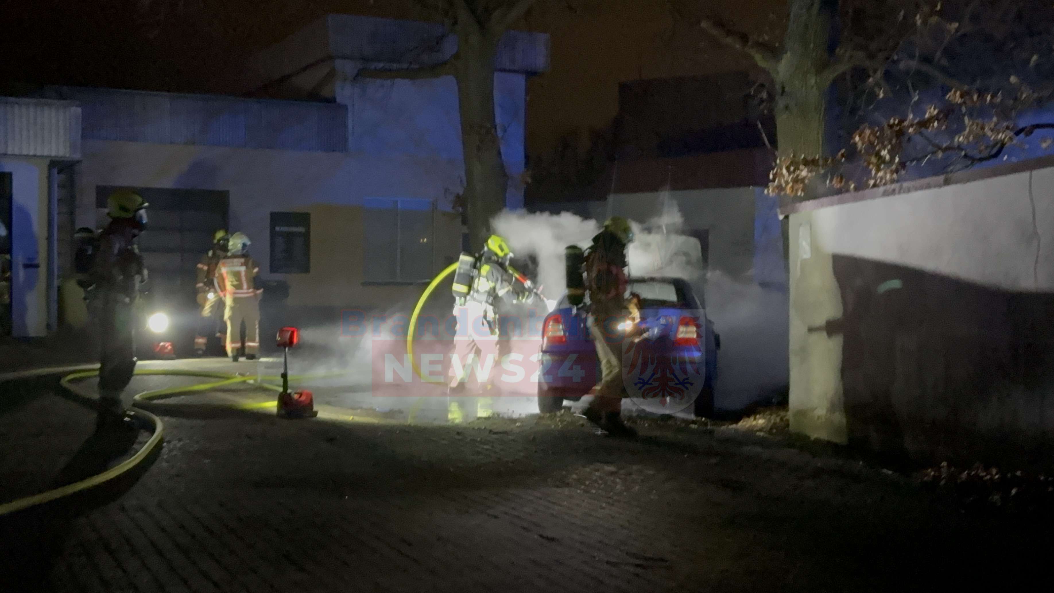 Die Feuerwehr brachte das Feuer zügig unter Kontrolle. Einsatzleiter Kevin Grigorian schilderte die Situation vor Ort: „Der PKW stand alleine auf dem Hinterhof. Eine Ausbreitung auf einen danebenliegenden Baum und eine in der Nähe stehende Garage konnte durch das schnelle Eingreifen der Feuerwehr verhindert werden.“ Um sicher arbeiten zu können, leuchteten die Einsatzkräfte den Bereich von einem benachbarten Grundstück aus großflächig aus.