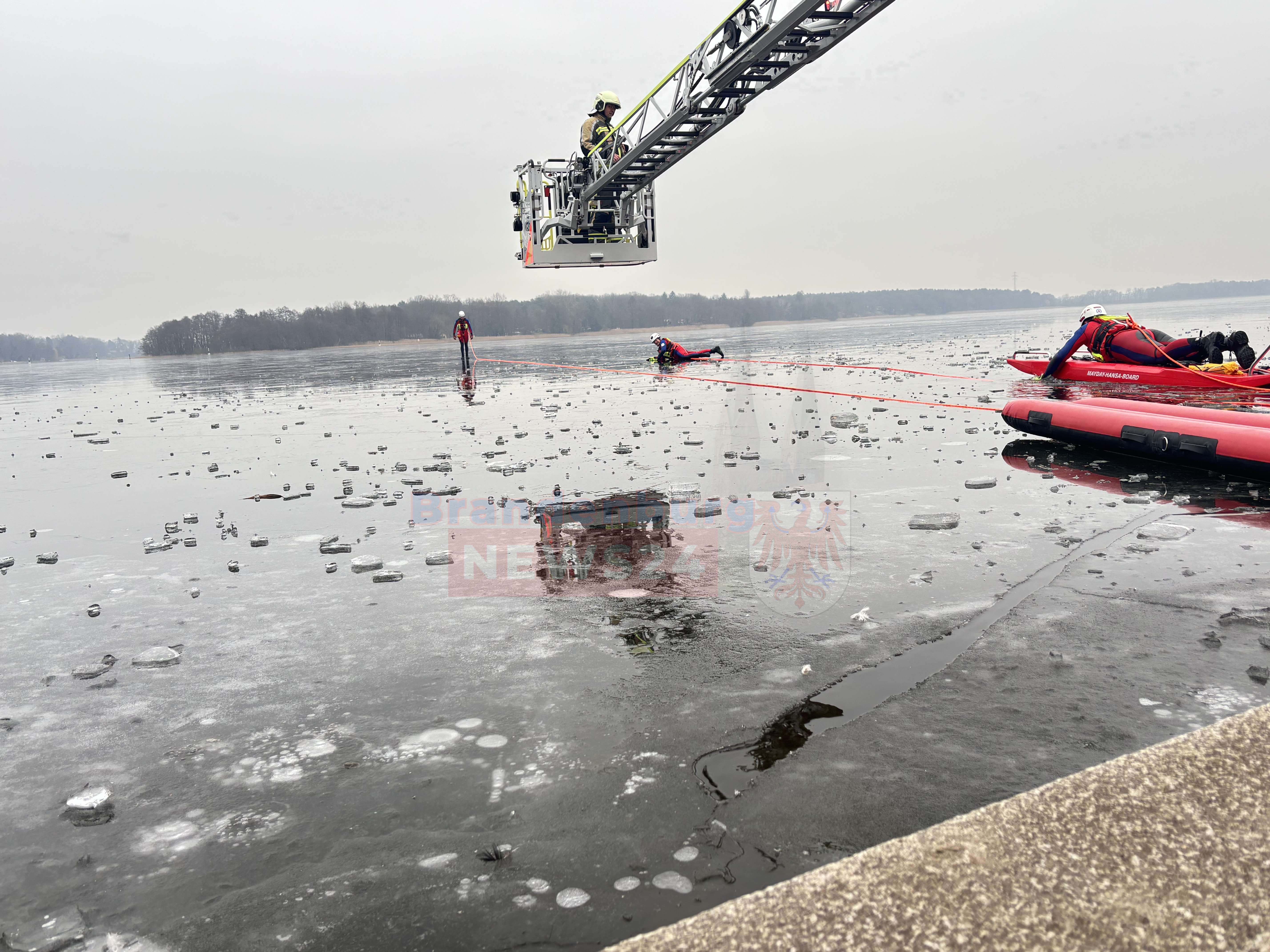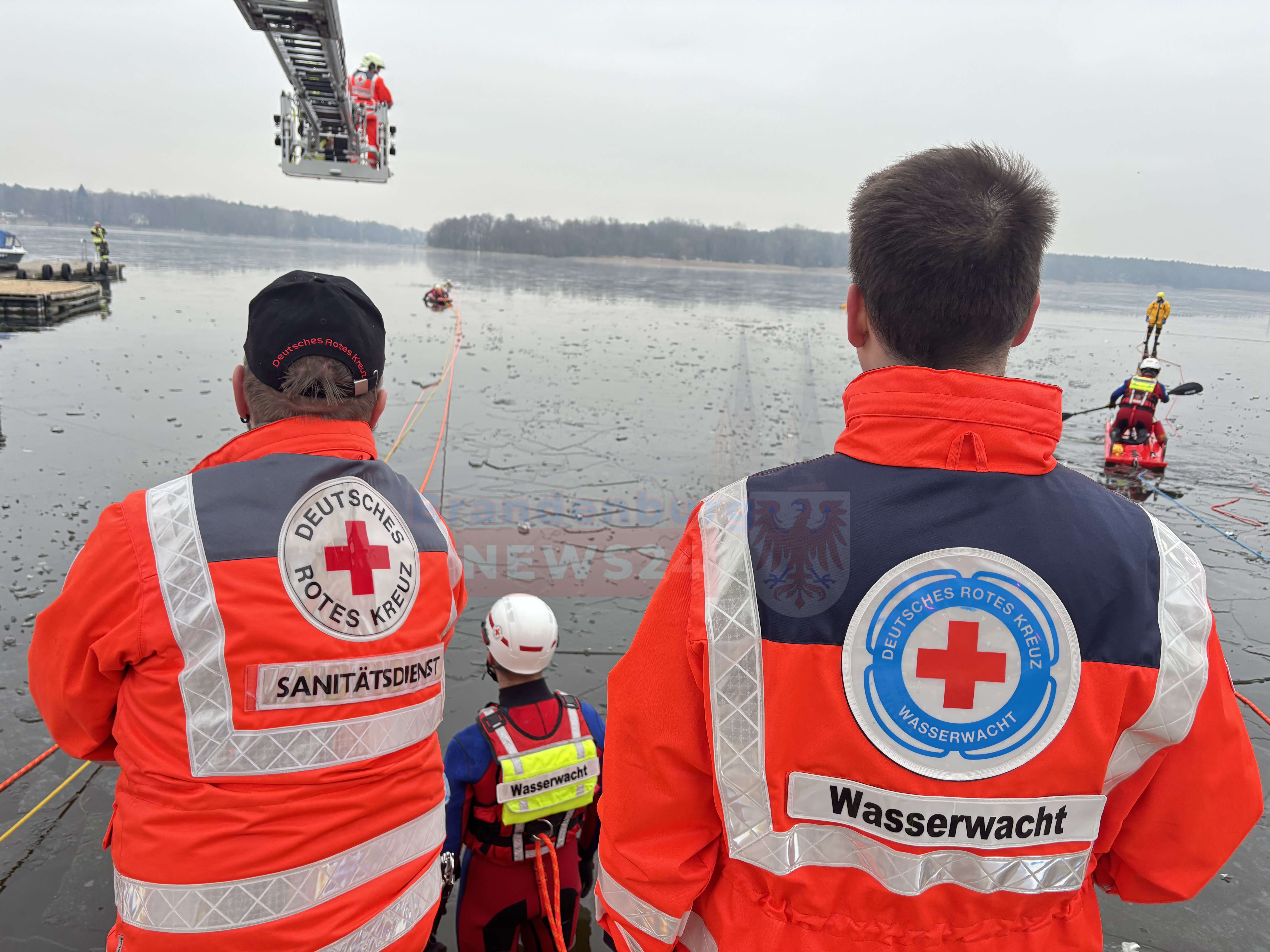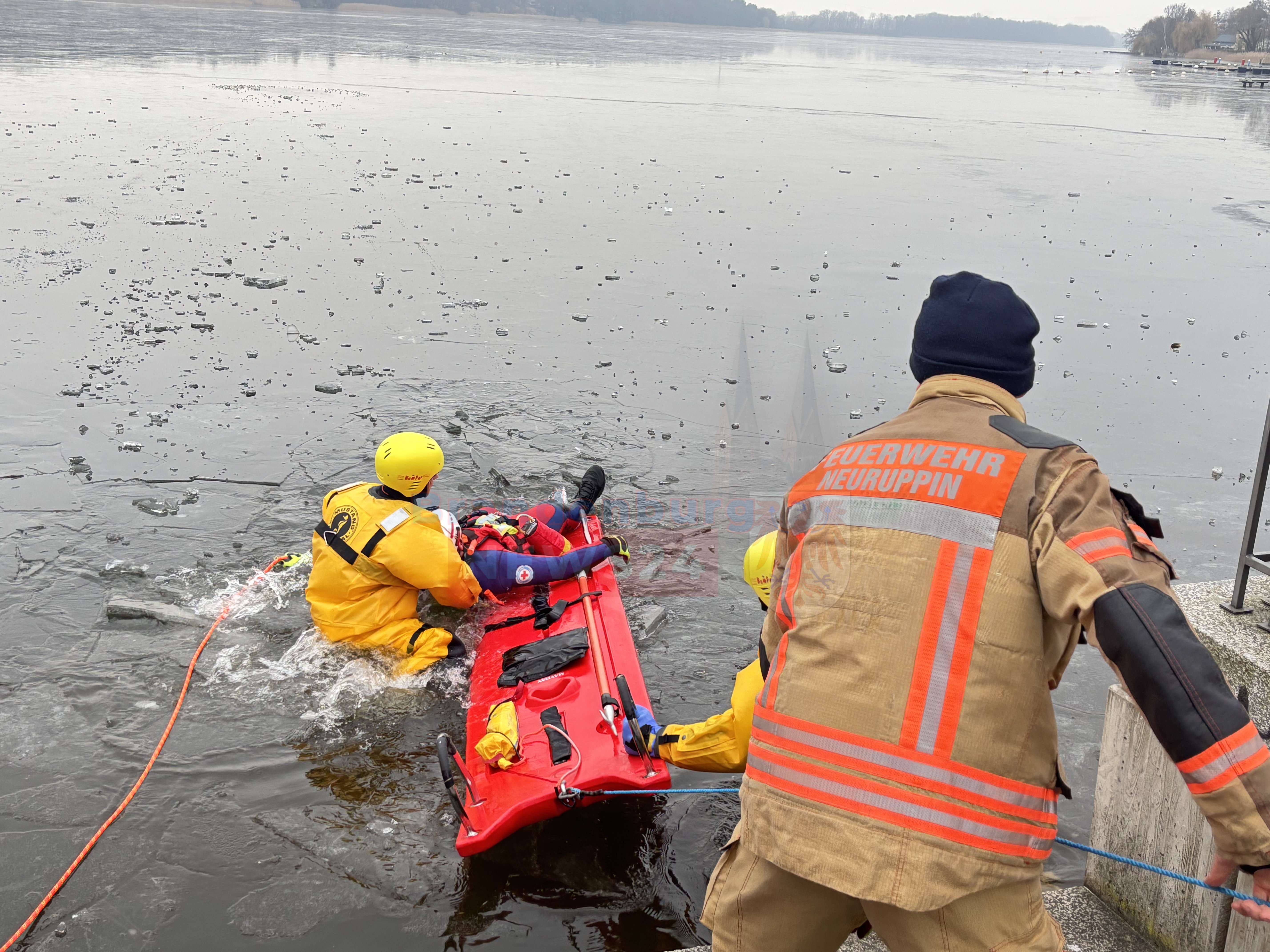 Gemeinsame Übung am Ruppiner See: Feuerwehr und Wasserwacht trainieren Eisrettung