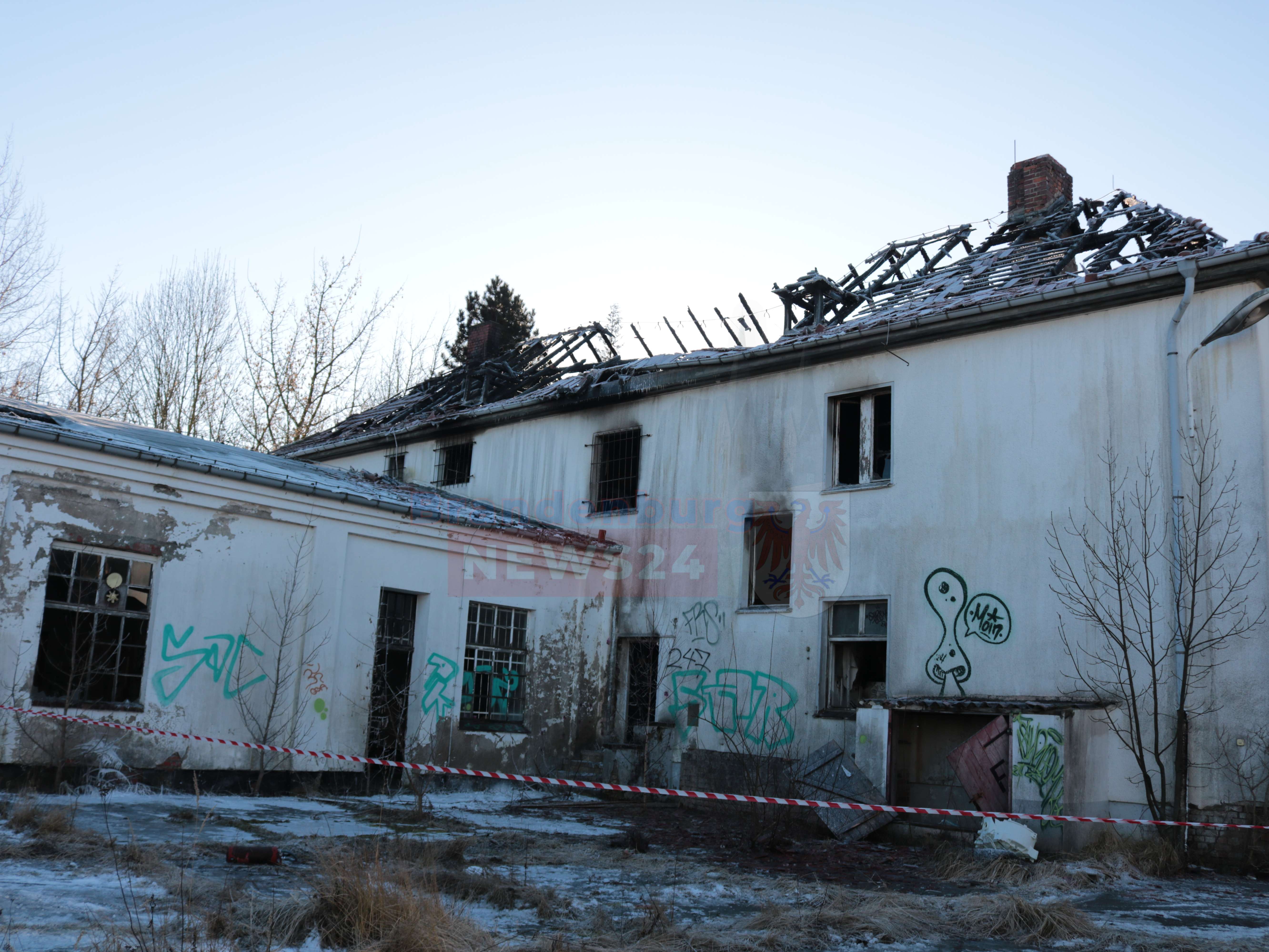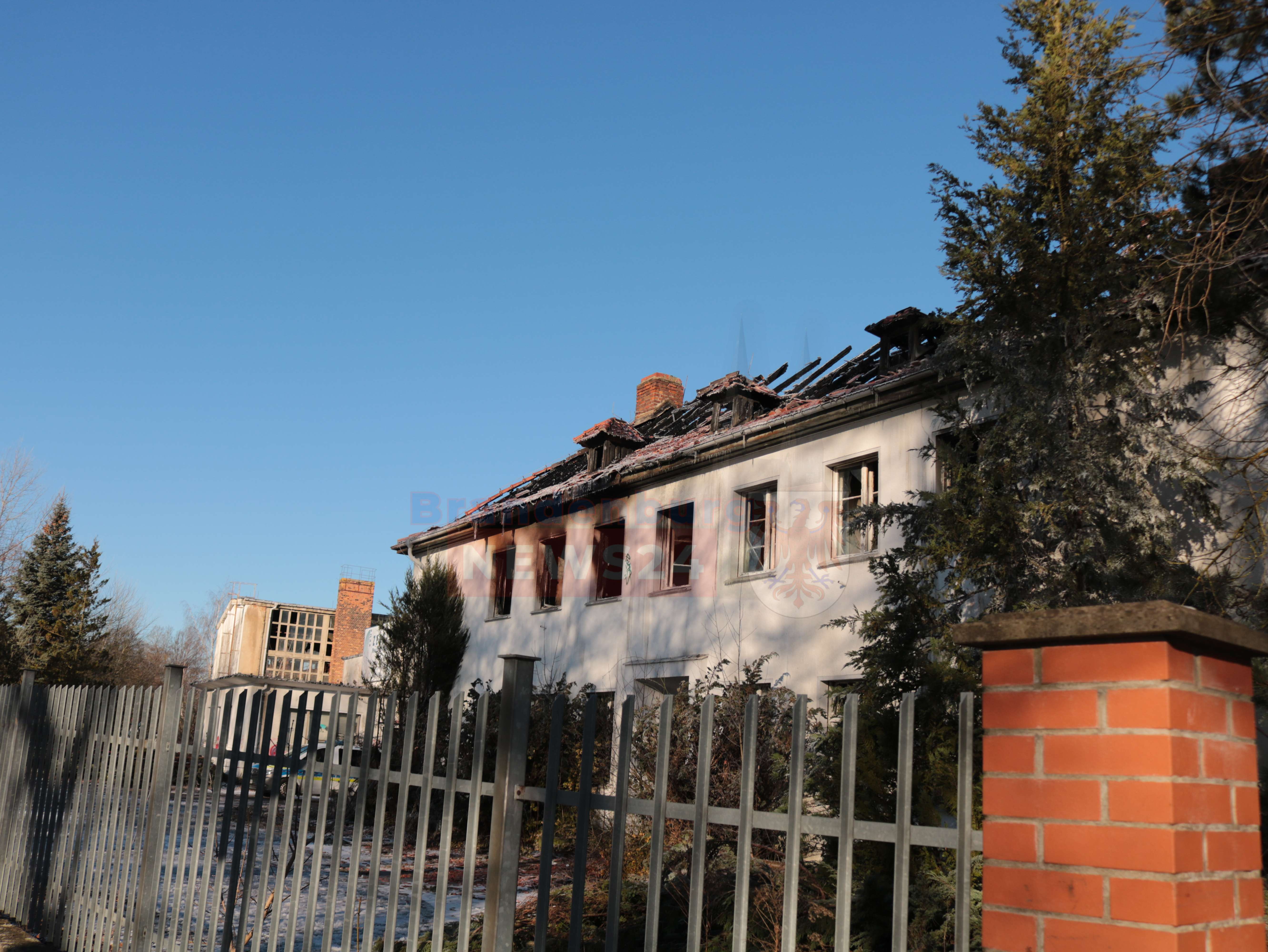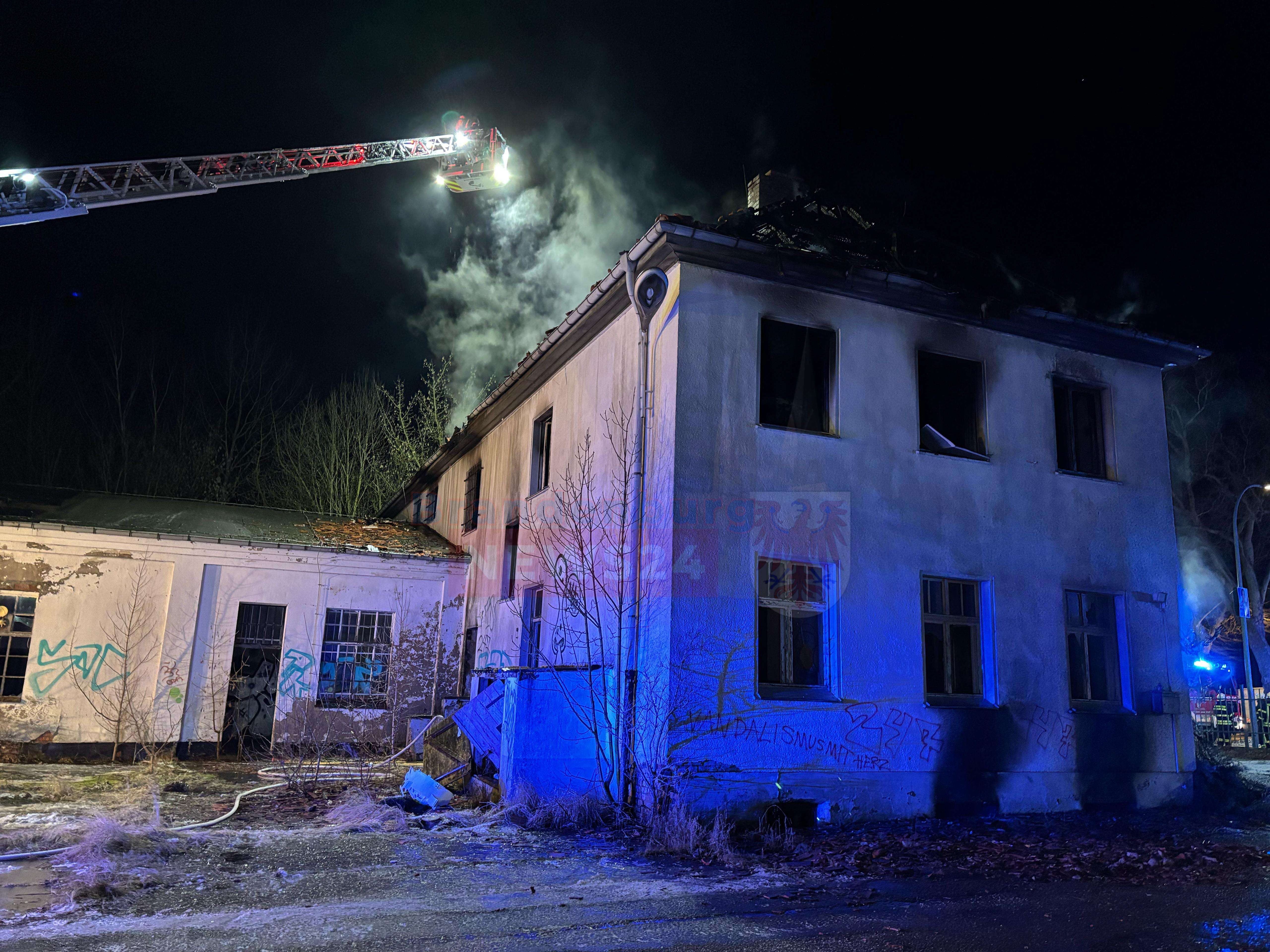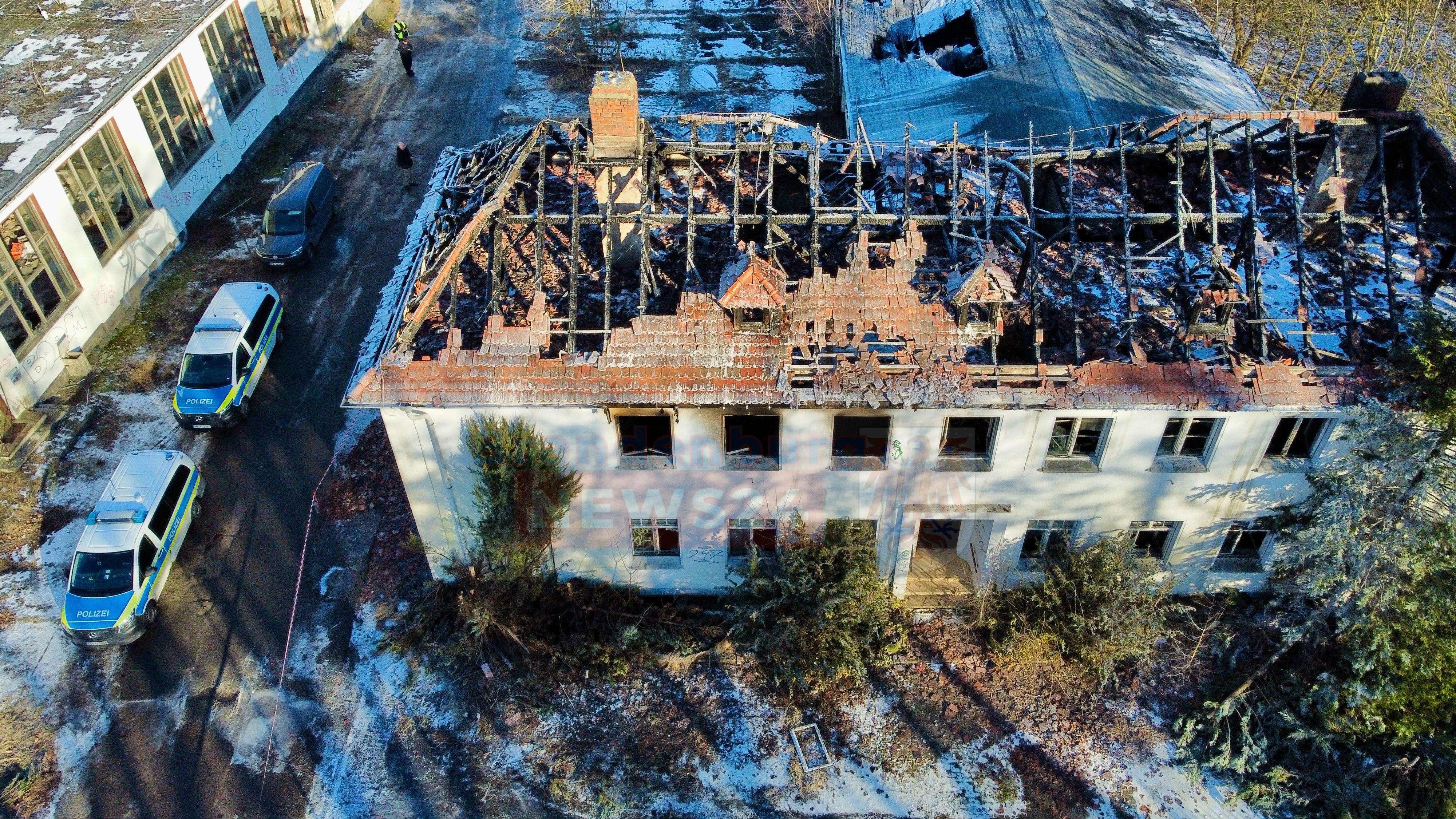 Nach dem Brand in einem Verwaltungsgebäude in der Freyensteiner Chausee geht die Kriminalpolizei von vorsätzlicher Brandstiftung durch offenes Feuer aus. Am Mittwochvormittag kamen Kriminaltechniker zum Einsatz, um den Brandort zu untersuchen. Die Feuerwehr unterstützte die Beamten mit ihrer Drehleiter und einer Drohne. Die Brandausbruchsstelle konnte im Keller des leerstehenden Objektes lokalisiert werden.
