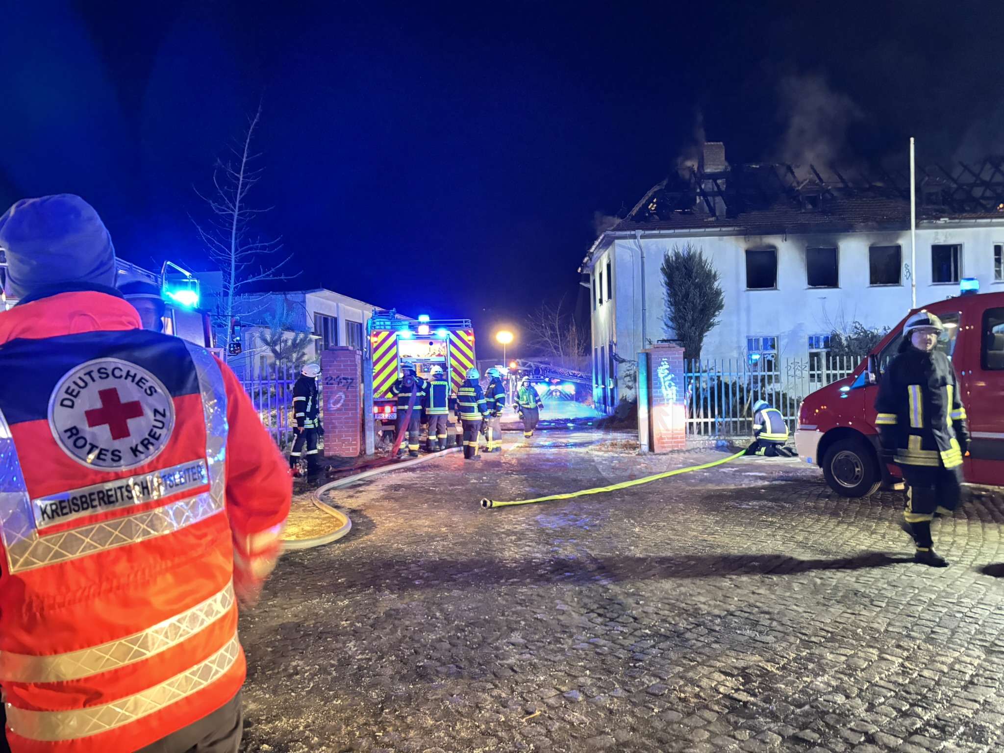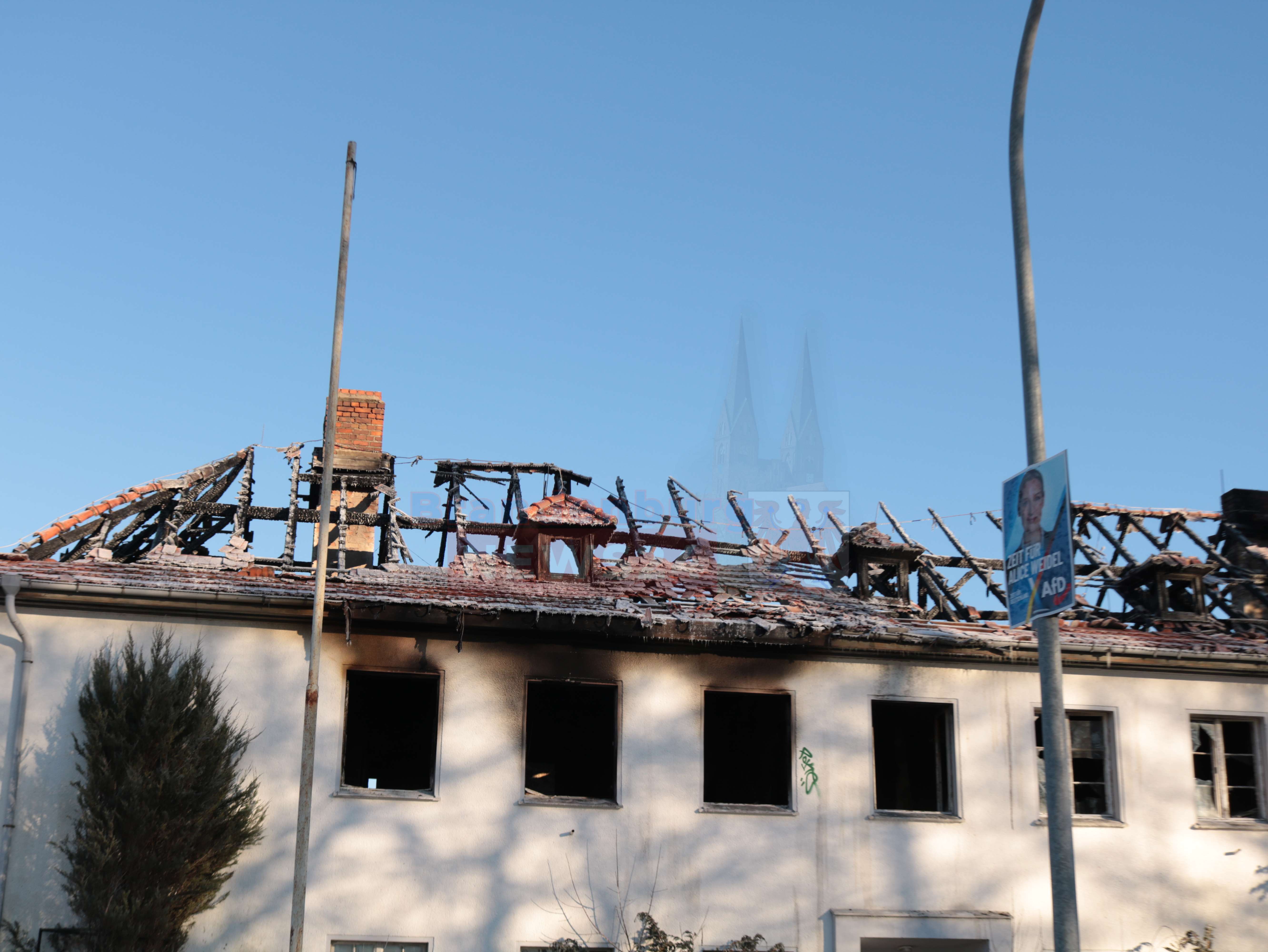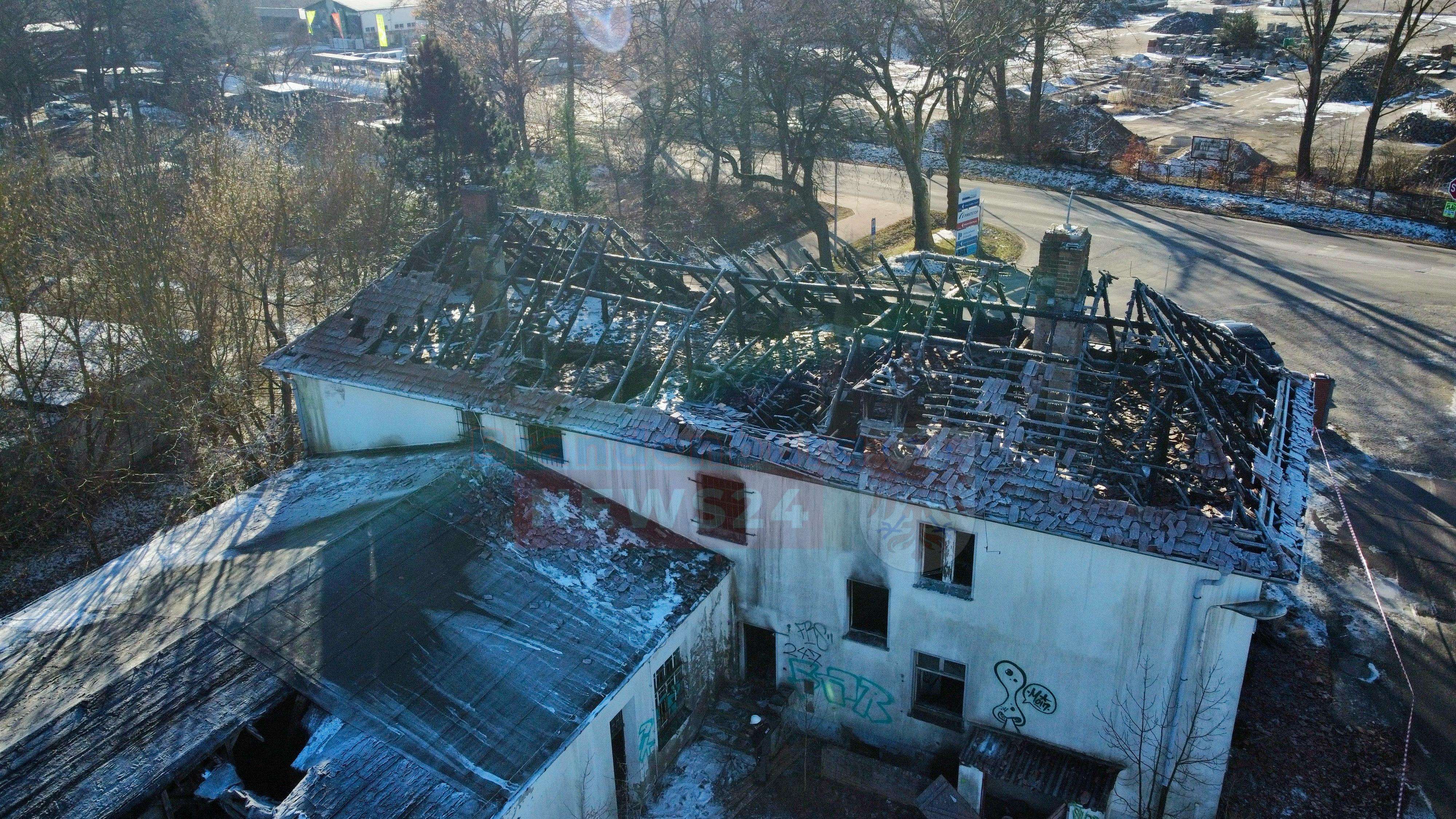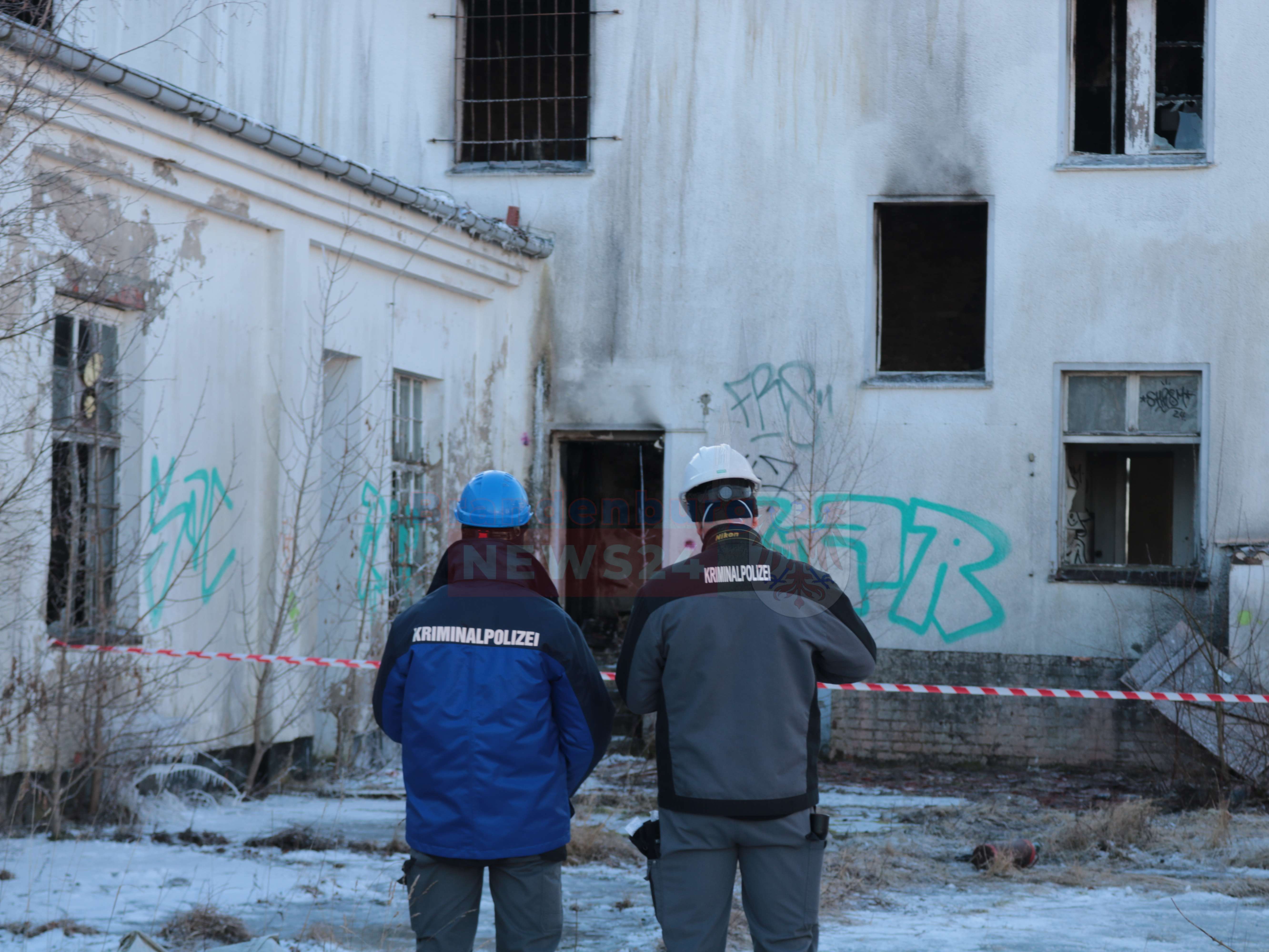 Nach dem Brand in einem Verwaltungsgebäude in der Freyensteiner Chausee geht die Kriminalpolizei von vorsätzlicher Brandstiftung durch offenes Feuer aus. Am Mittwochvormittag kamen Kriminaltechniker zum Einsatz, um den Brandort zu untersuchen. Die Feuerwehr unterstützte die Beamten mit ihrer Drehleiter und einer Drohne. Die Brandausbruchsstelle konnte im Keller des leerstehenden Objektes lokalisiert werden.