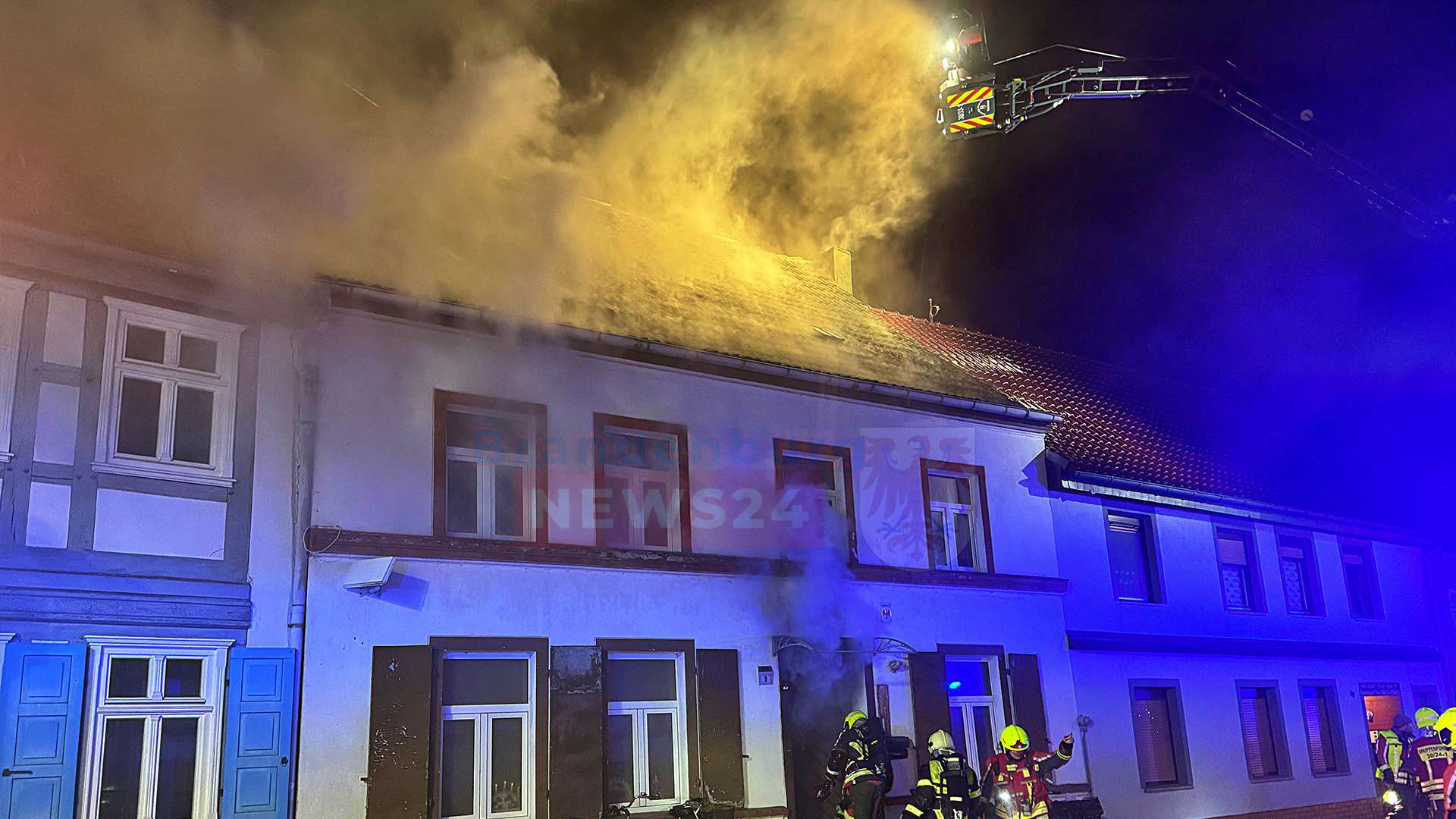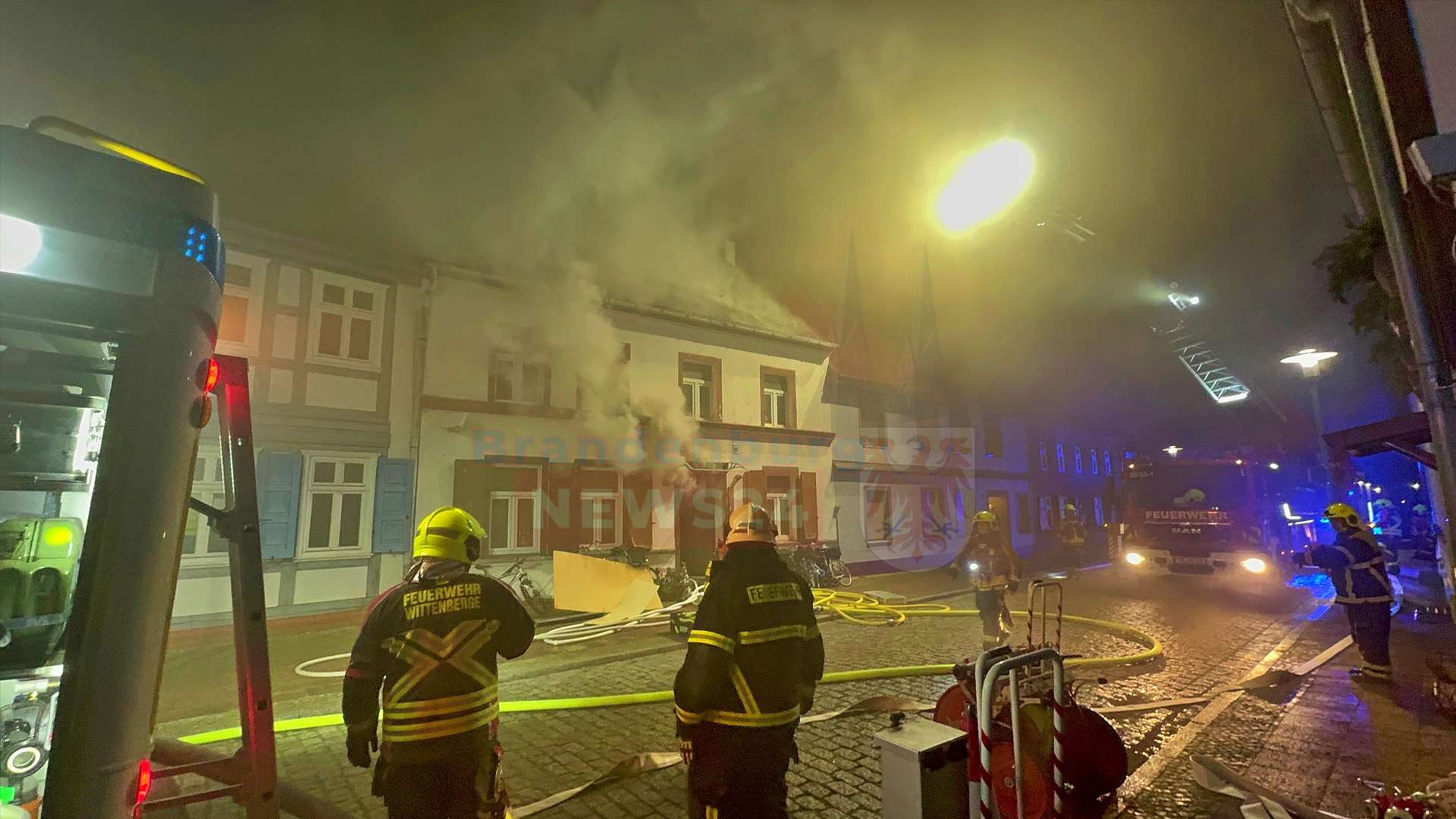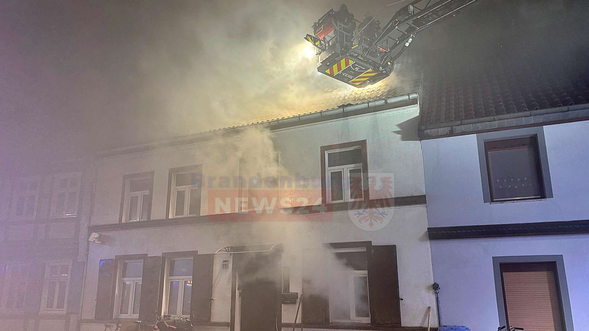 Weitere Feuerwehren aus der Umgebung sind angefordert worden. Die Drehleiter der Feuerwehr Wittenberge steht direkt vor dem Gebäude. Feuerwehrleute gehen mit Atemschutzgeräten in das Haus, um die Flammen zu löschen.
