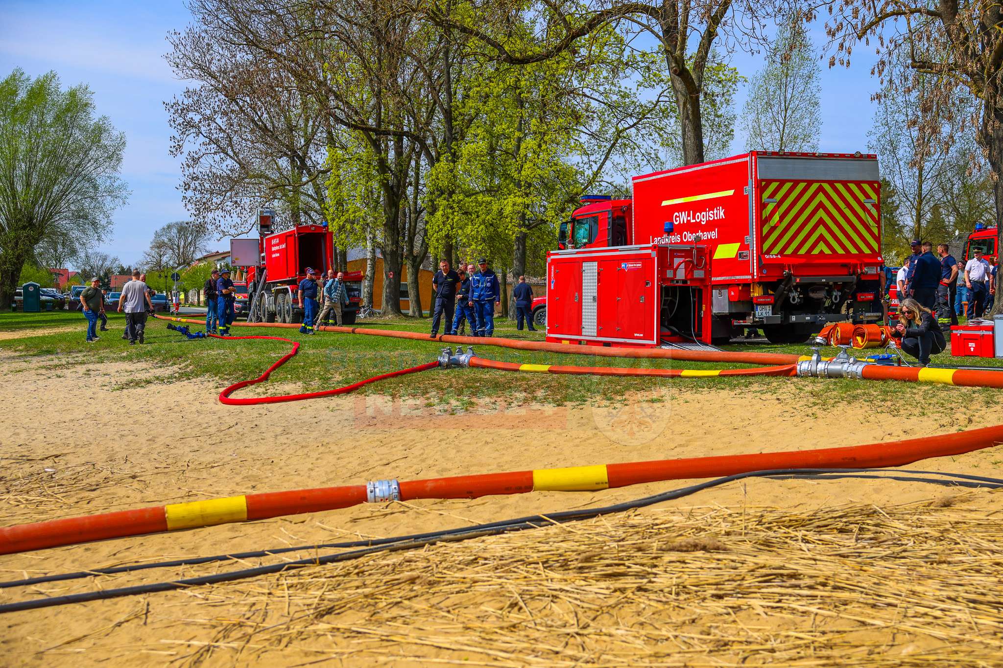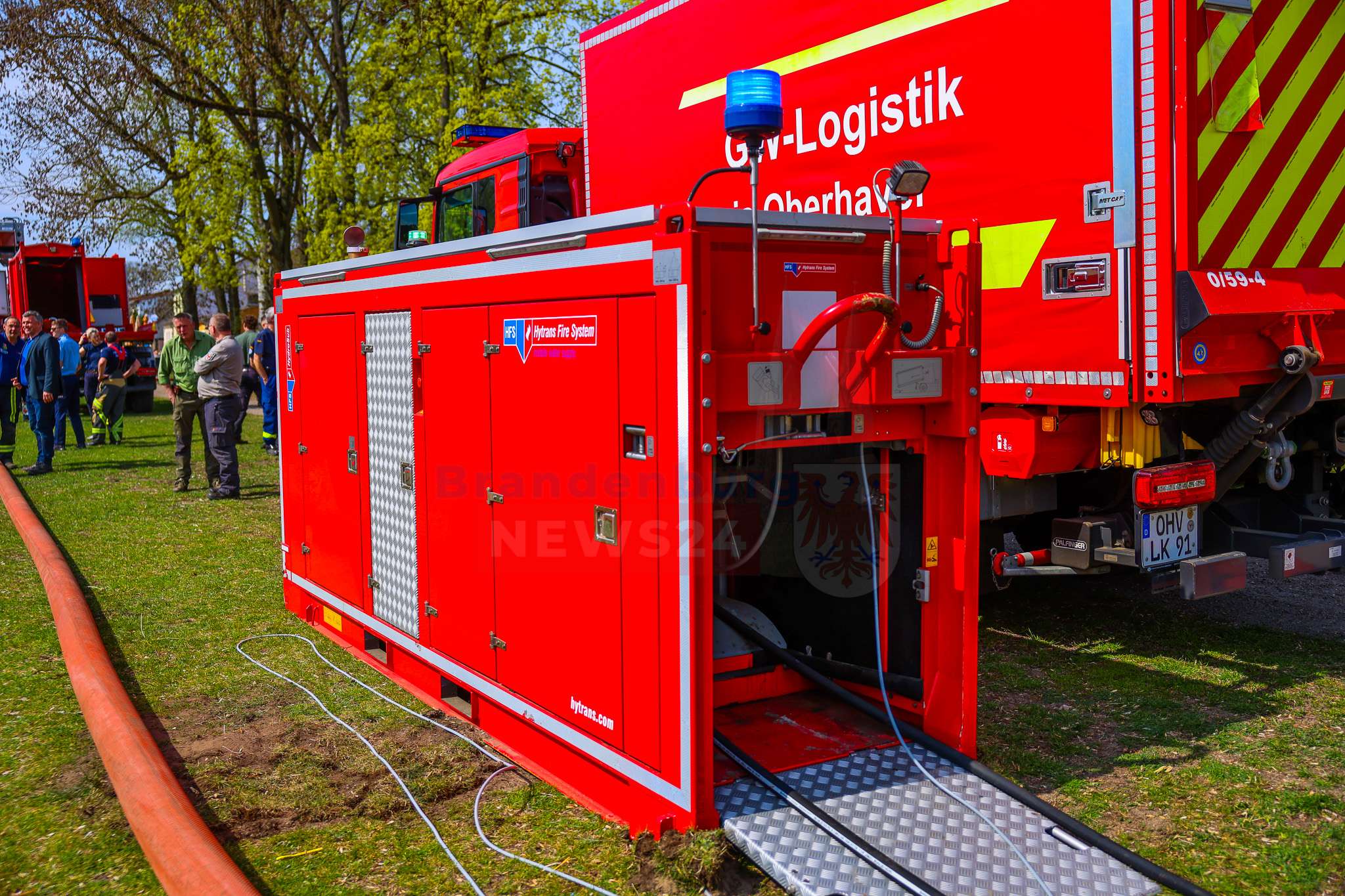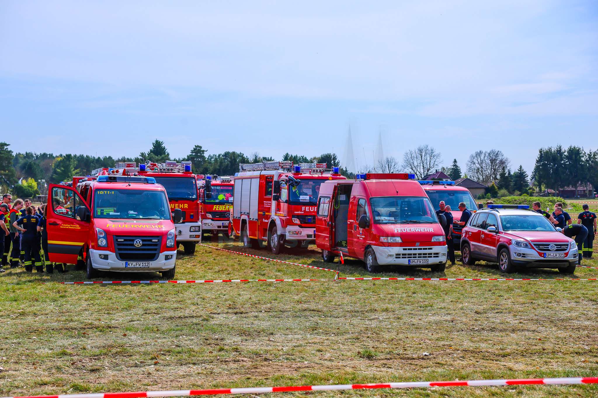 Am Samstagmorgen hatte die Beschaulichkeit der Aufbauphase dann ein Ende. Das Drehbuch der Übung unter der Leitung der Kreisbrandmeister Gerd Ritter aus Oberhavel und Olaf Lehmann aus OPR war gnadenlos: Angenommen wurde eine wochenlange Dürreperiode mit Temperaturen jenseits der 30-Grad-Marke. Bei Waldbrandgefahrenstufe 5 und ungünstigen Winden entzündete sich ein Feuer im Löwenberger Land, das sich rasend schnell ausbreitete und die Ortschaften Ludwigsaue sowie Neu Ludwigsaue zu verschlingen drohte. Die örtlichen Wehren waren schnell am Limit, woraufhin der Landrat den Großschadensfall auslöste.