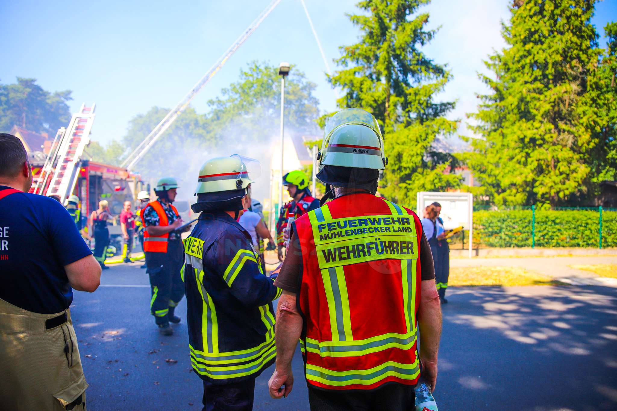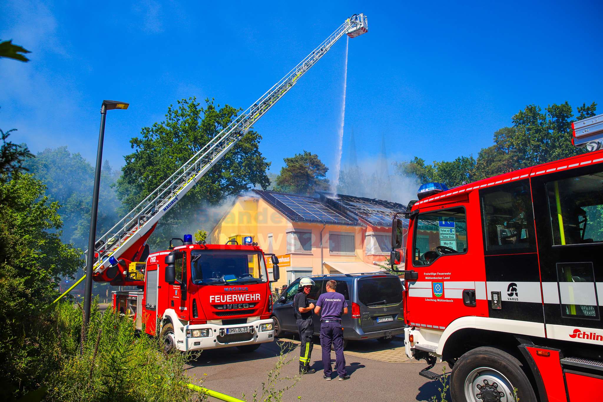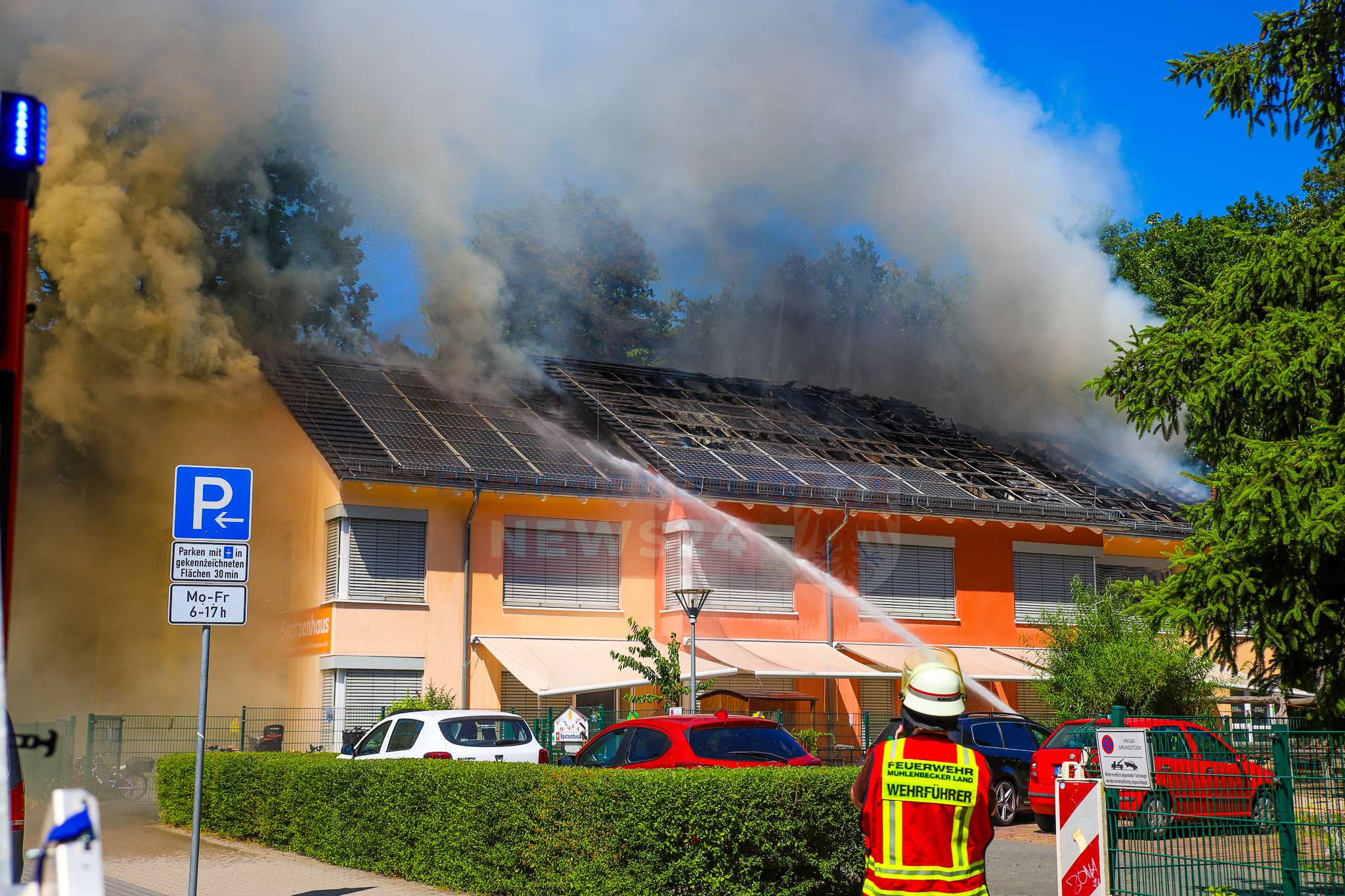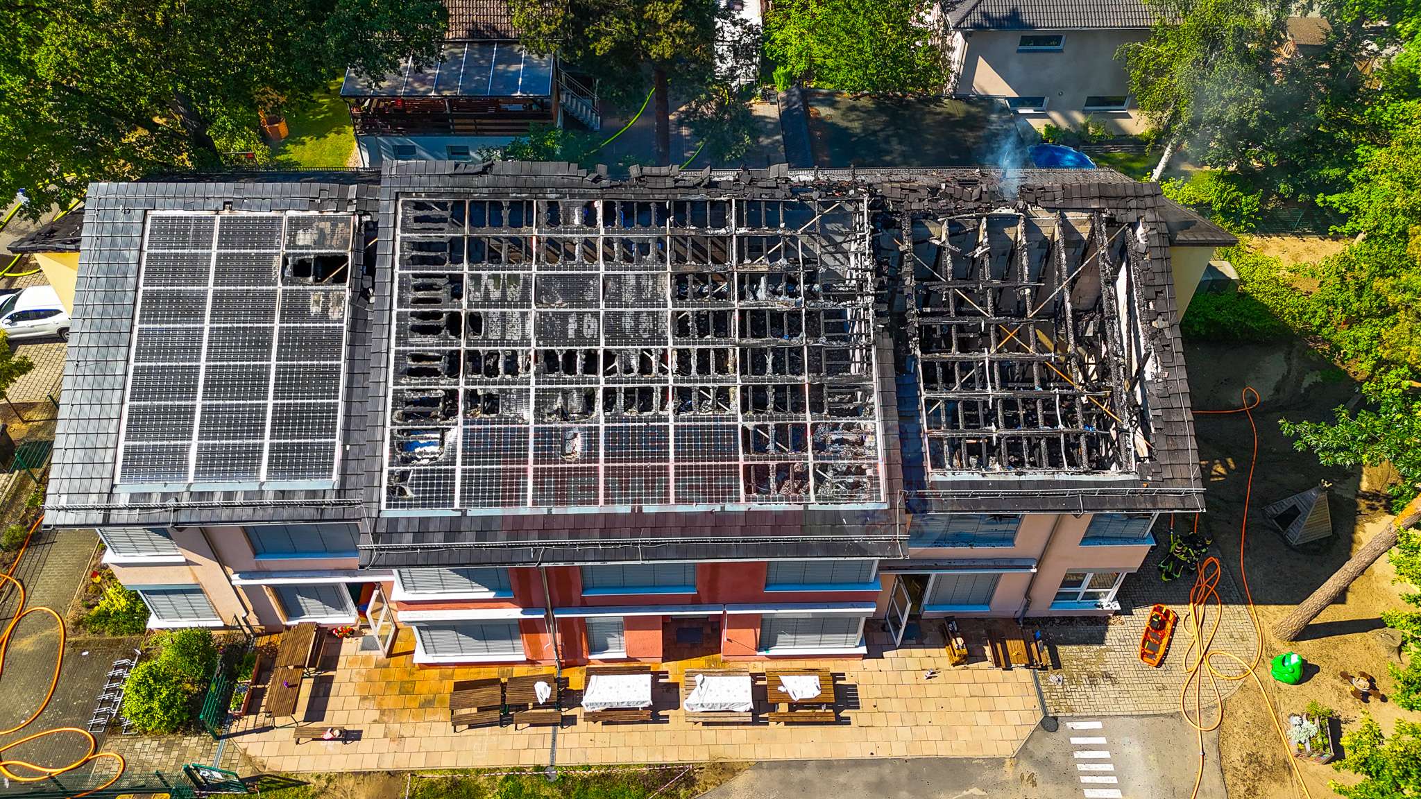 Die Brandbekämpfung gestaltete sich aufgrund der auf dem Dach installierten Photovoltaikanlage schwierig. „Der gesamte Dachstuhl war mit Solarpanels bedeckt, das erschwerte den Zugang und begünstigte die Brandausbreitung“, so Strausdat weiter. Auch die enorme Hitze – das Thermometer zeigte bis zu 38 Grad – stellte die Feuerwehrleute vor zusätzliche Herausforderungen. Die Einsatzkräfte setzten zunächst auf einen Außenangriff, später folgte ein Innenangriff zur Restablöschung.