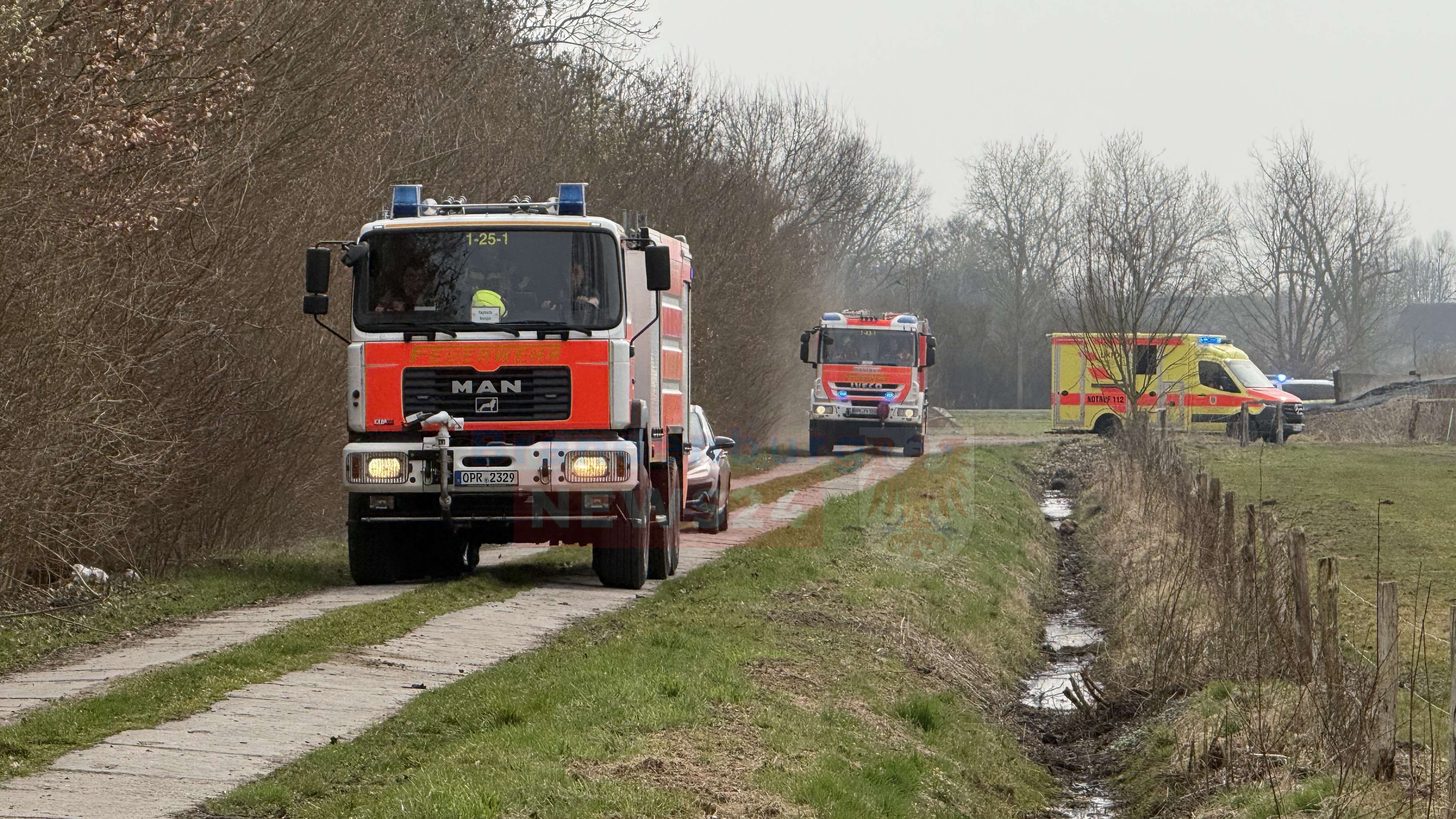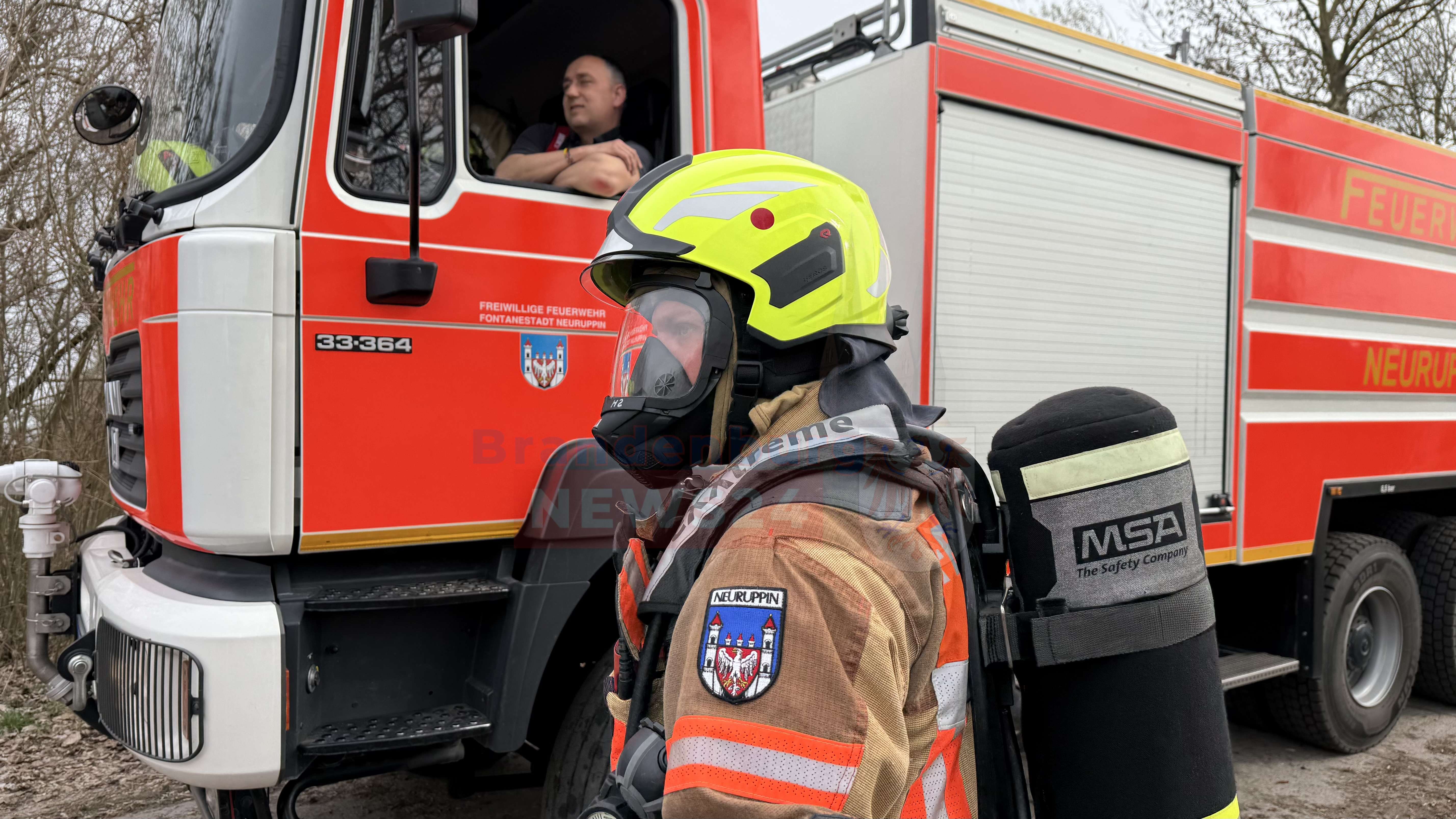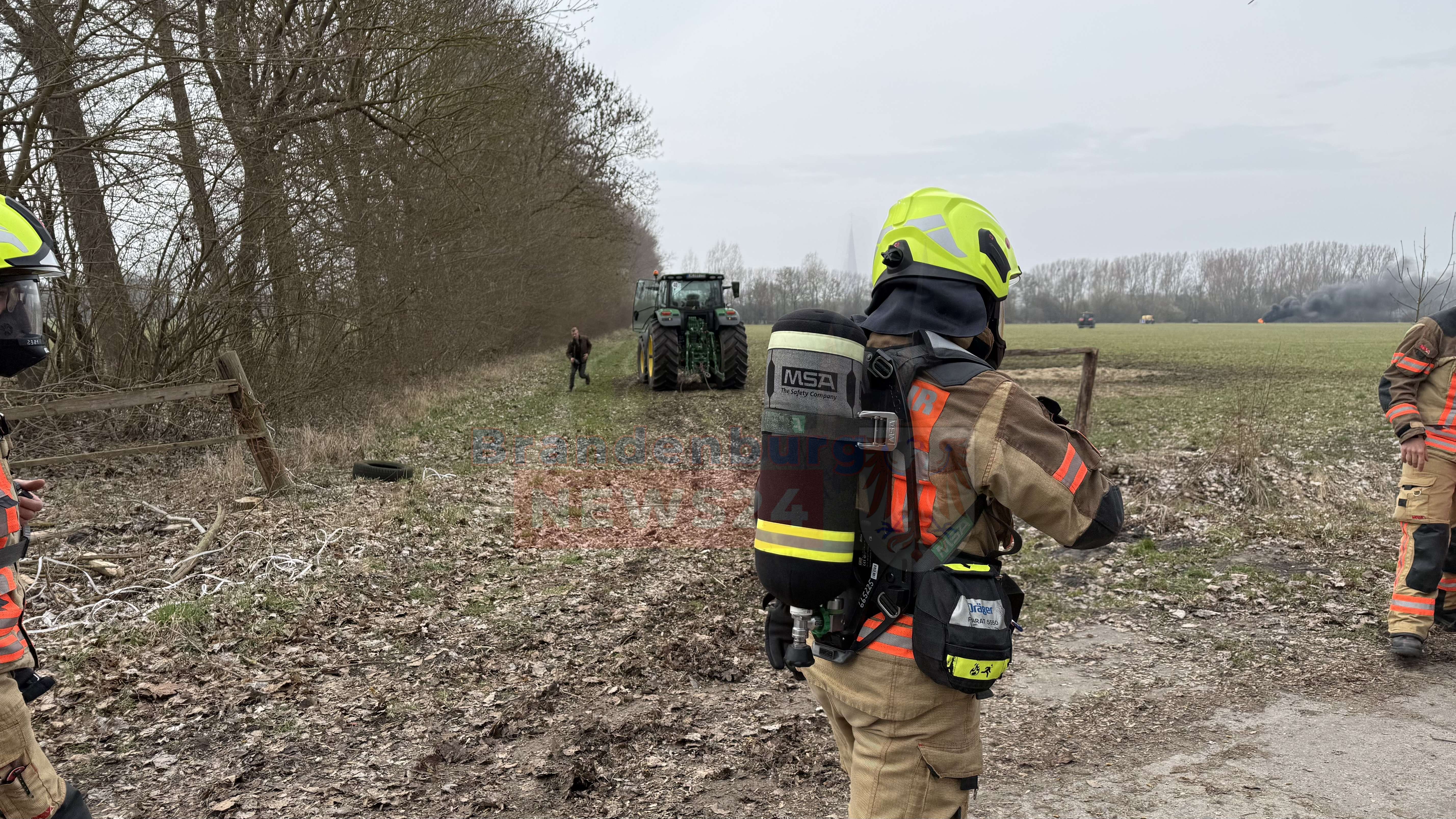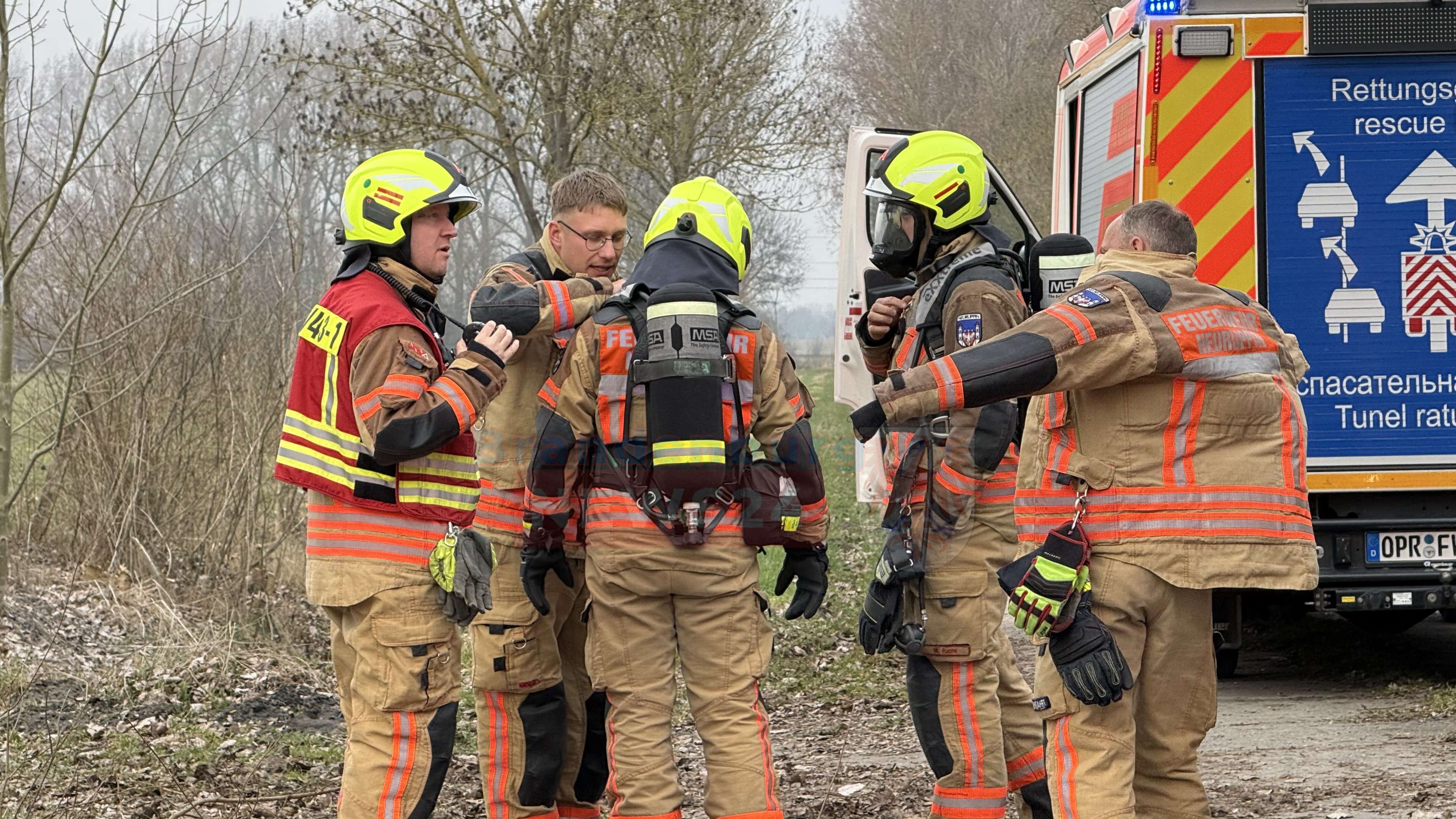 Auf einem schmalen Betonplattenweg am Rande des Feldes sammelte sich kurz darauf ein Aufgebot an Einsatzfahrzeugen. Die Freiwillige Feuerwehr Neuruppin rückte mit 19 Einsatzkräften und vier Fahrzeugen an. Begleitet wurden der Einsatz von einem Rettungswagen und Streifenwagen der Polizei. Bilder vom Einsatzort zeigen, wie sich Feuerwehrleute bereits mit schwerem Atemschutz für den Löschangriff ausrüsteten – doch dazu sollte es nicht kommen.
