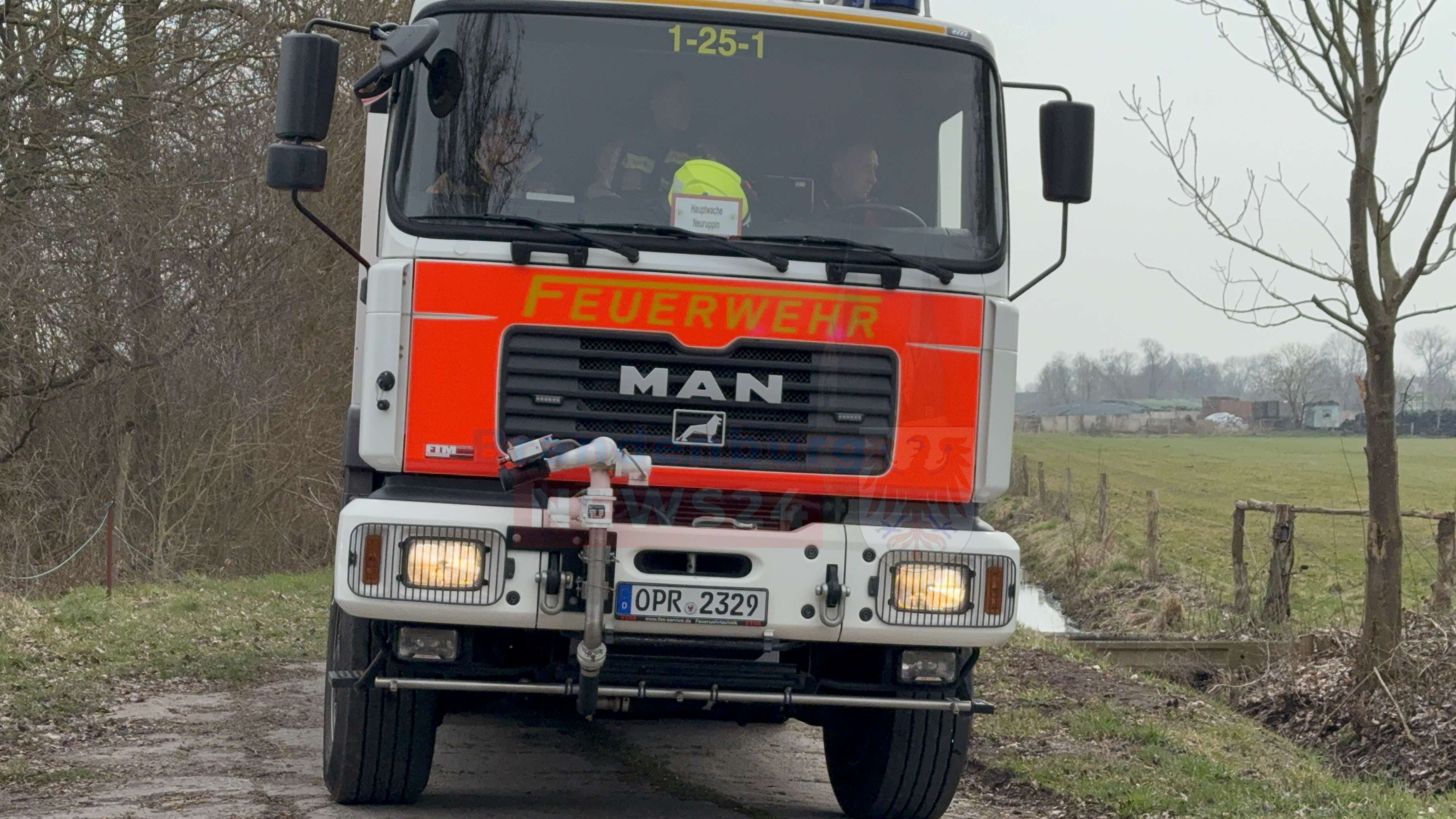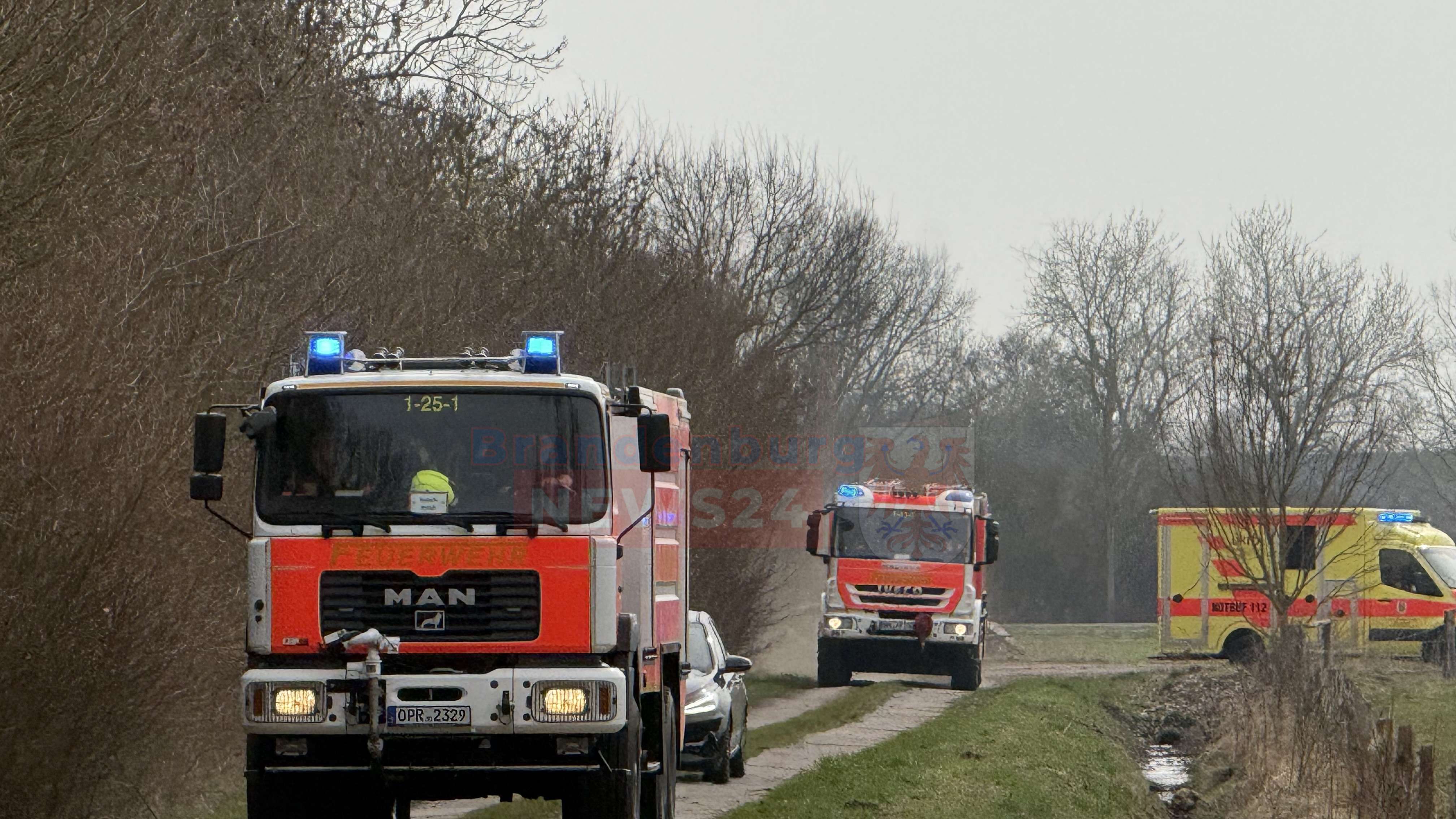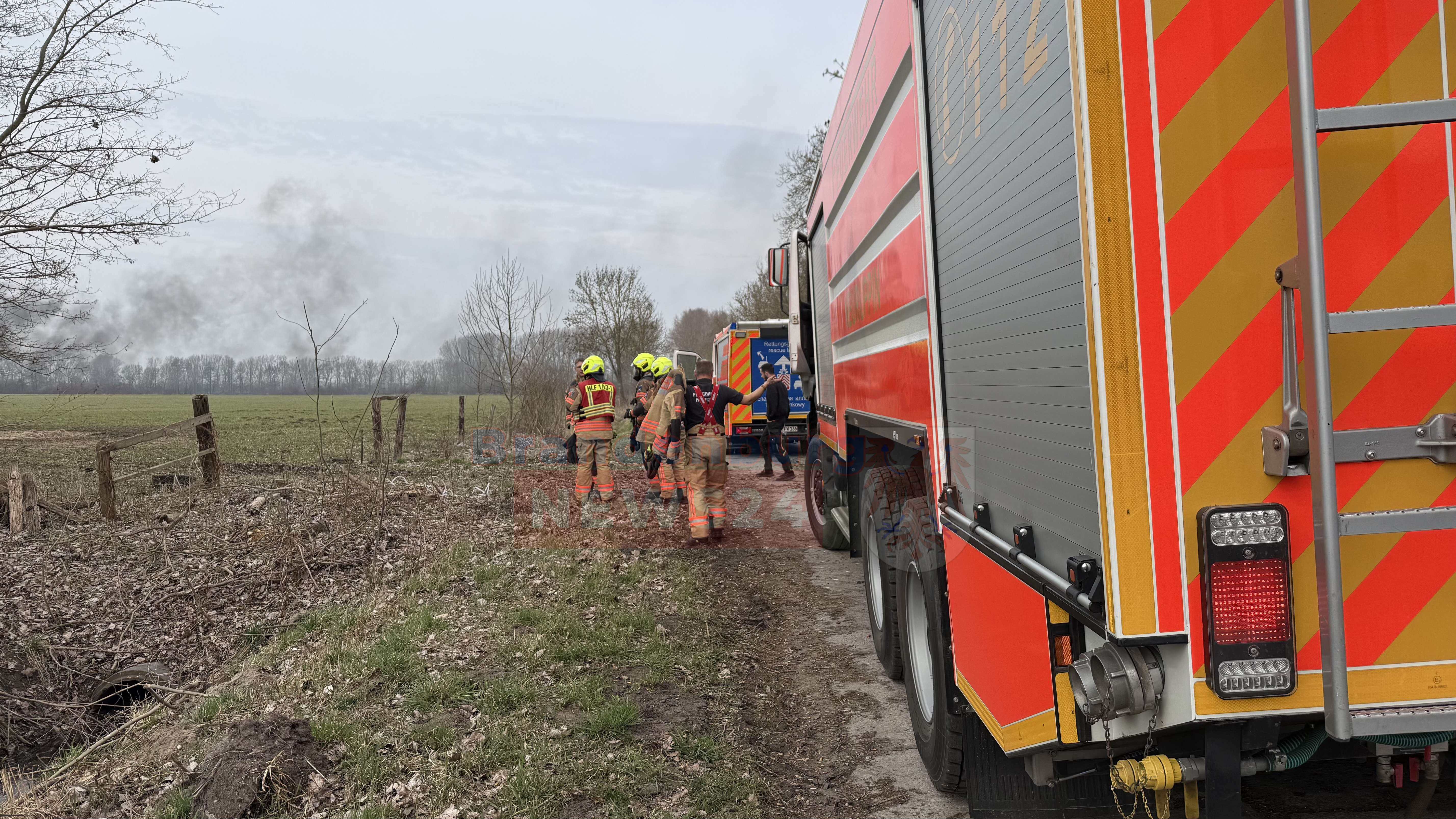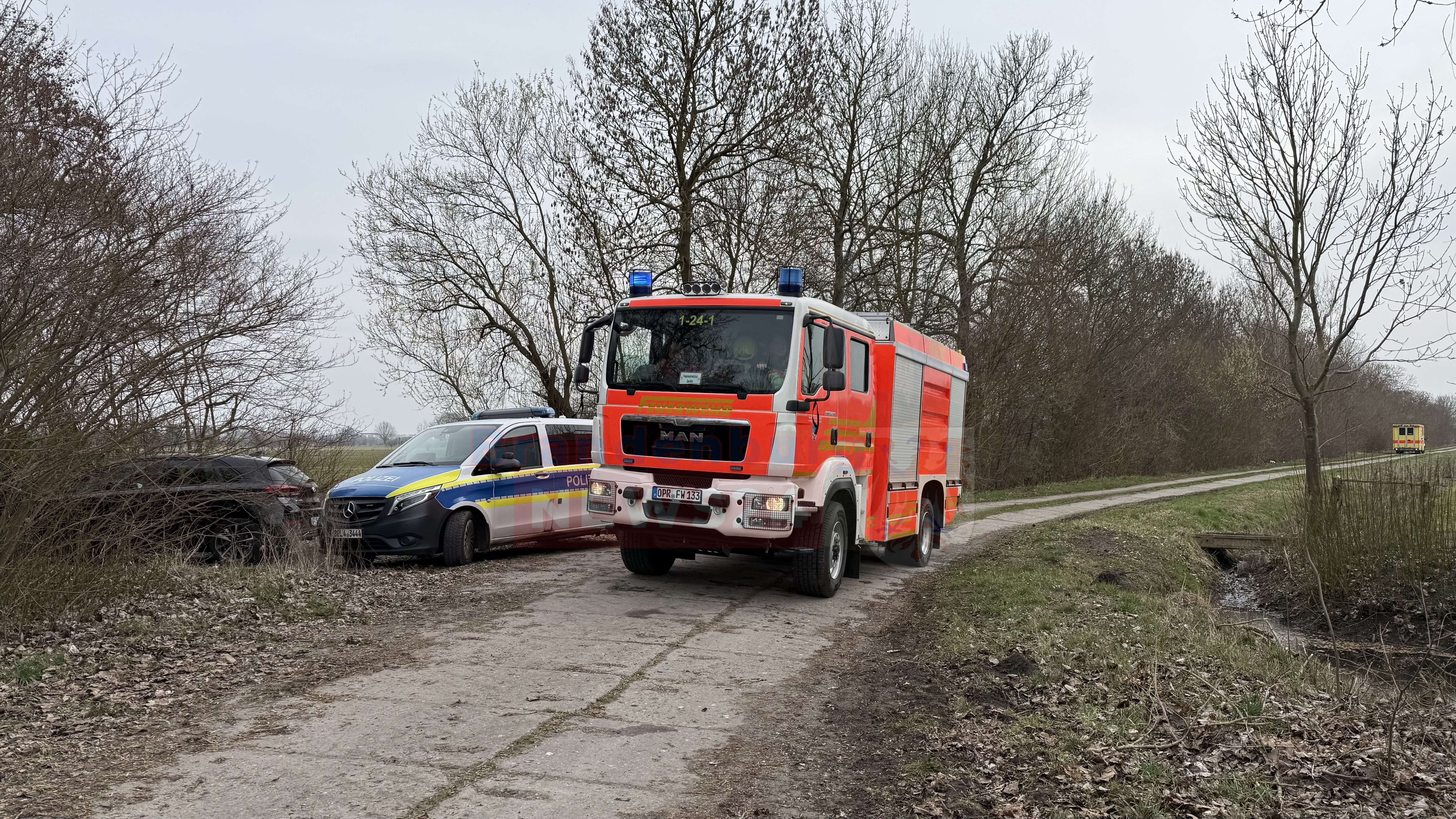 Auf einem schmalen Betonplattenweg am Rande des Feldes sammelte sich kurz darauf ein Aufgebot an Einsatzfahrzeugen. Die Freiwillige Feuerwehr Neuruppin rückte mit 19 Einsatzkräften und vier Fahrzeugen an. Begleitet wurden der Einsatz von einem Rettungswagen und Streifenwagen der Polizei. Bilder vom Einsatzort zeigen, wie sich Feuerwehrleute bereits mit schwerem Atemschutz für den Löschangriff ausrüsteten – doch dazu sollte es nicht kommen.
