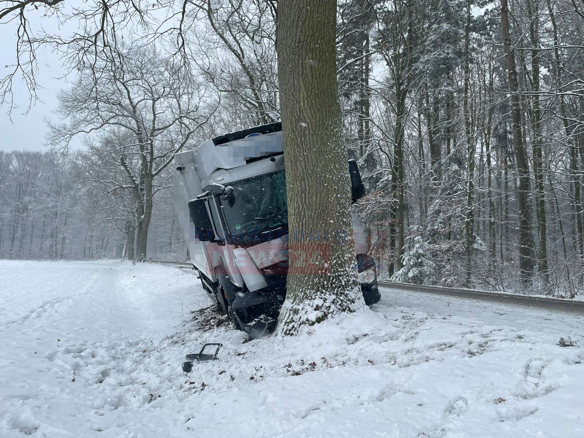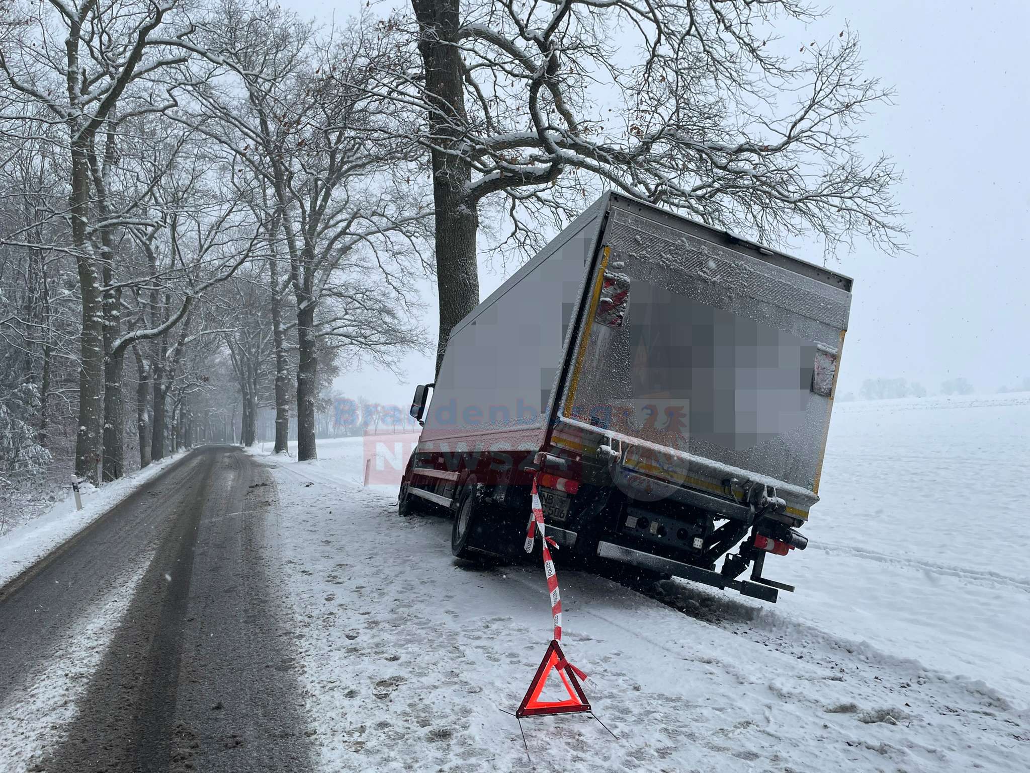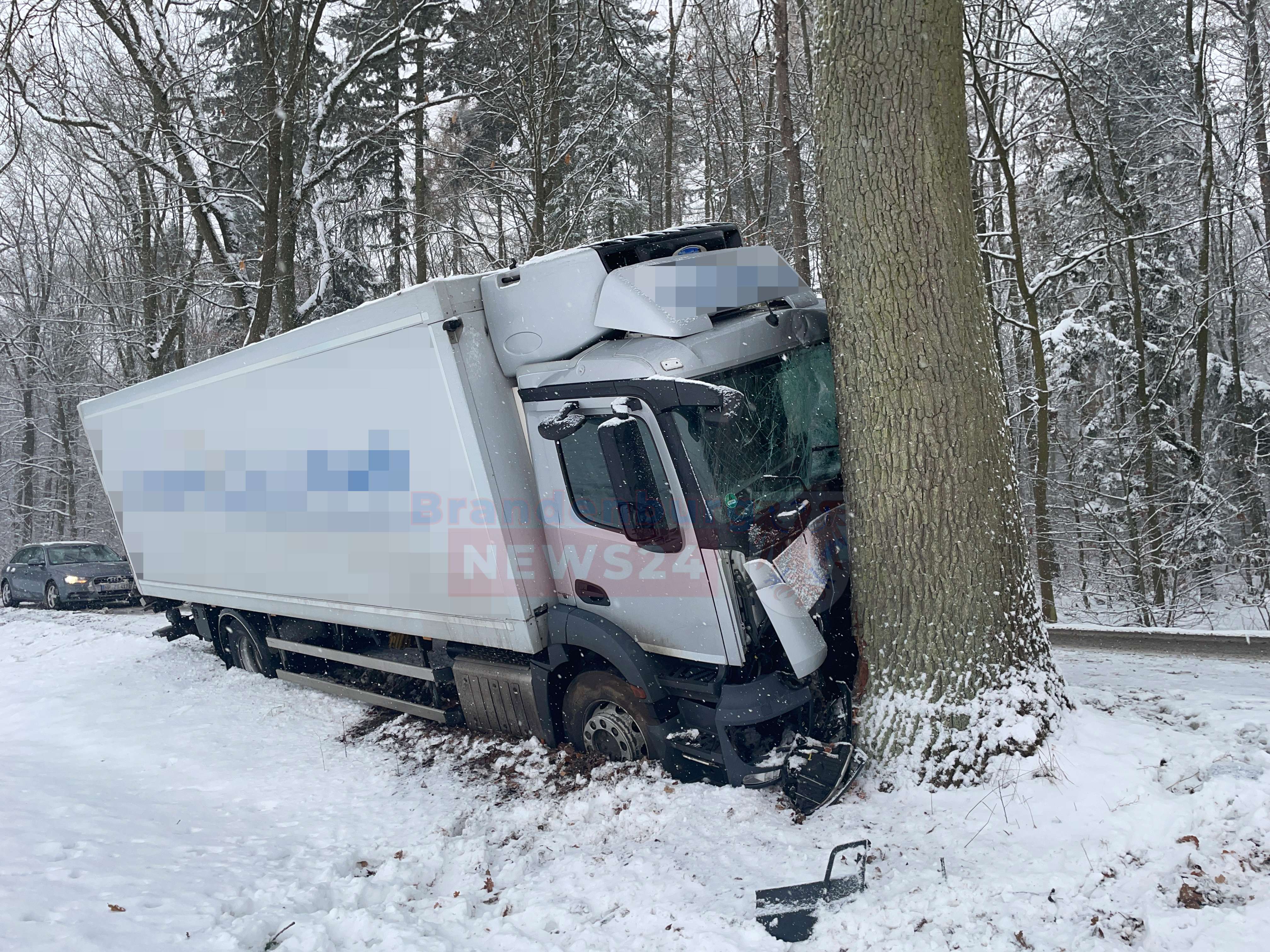 Aufgrund einer Glatten Fahrbahn kam ein 43-Jähriger LKW-Fahrer, der in Richtung Großwoltersdorf unterwegs war, nach rechts von der Fahrbahn ab und kollidierte mit einem Baum. Der Fahrer wurde leicht verletzt mit einem Rettungswagen in ein Krankenhaus verbracht. Es entstand ein Sachschaden von circa 10.000 Euro.