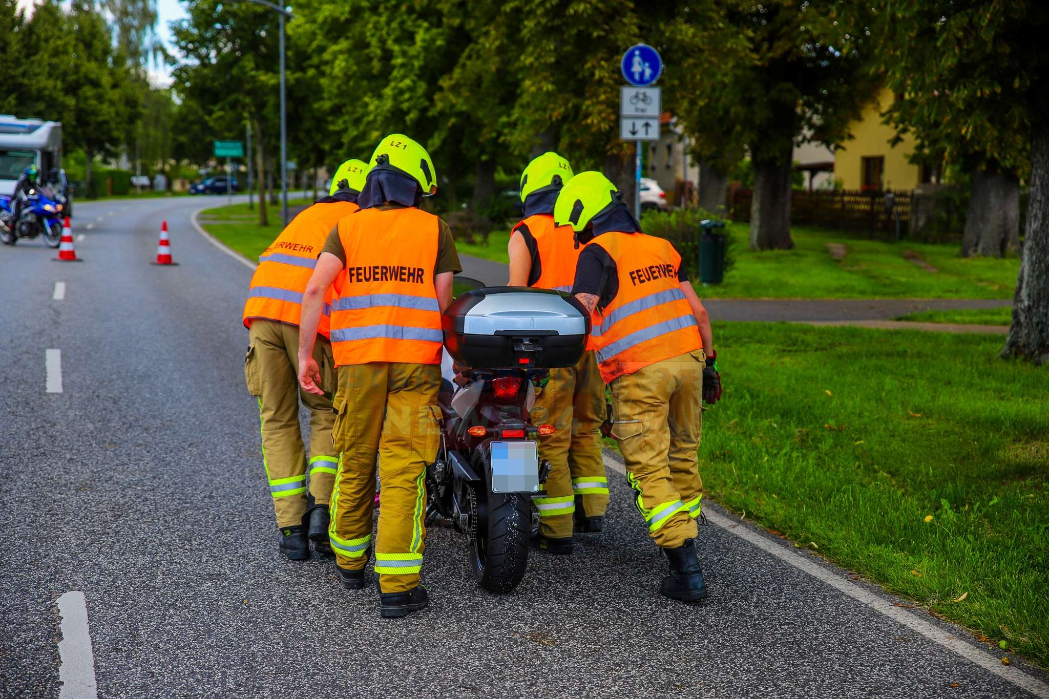Der Motorradfahrer wurde bei dem Zusammenstoß verletzt und nach einer Erstversorgung vor Ort in ein Krankenhaus gebracht. Die Feuerwehr der Stadt Kremmen sicherte die Einsatzstelle ab, stellte den Brandschutz sicher und band auslaufende Betriebsstoffe, ab.