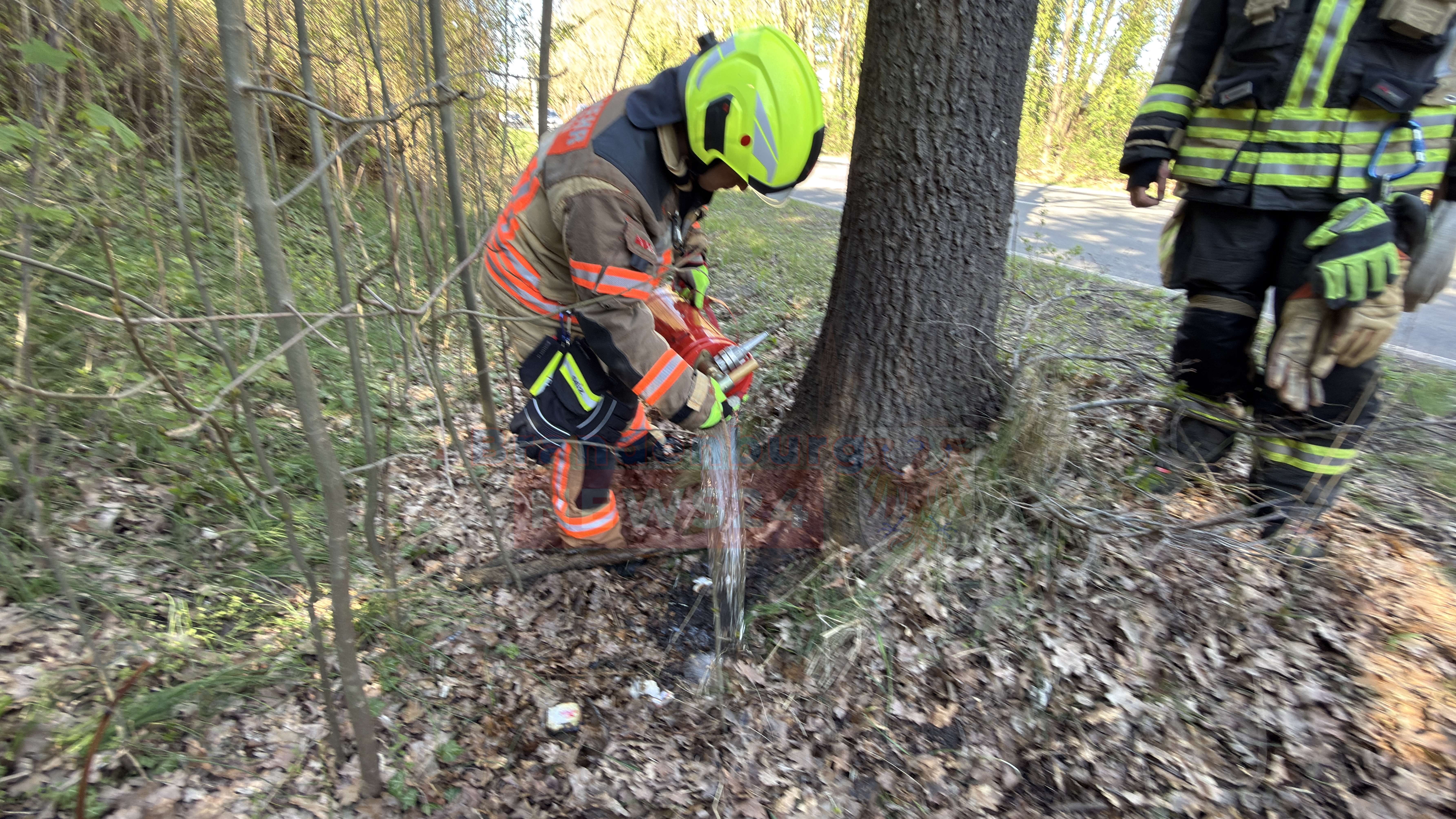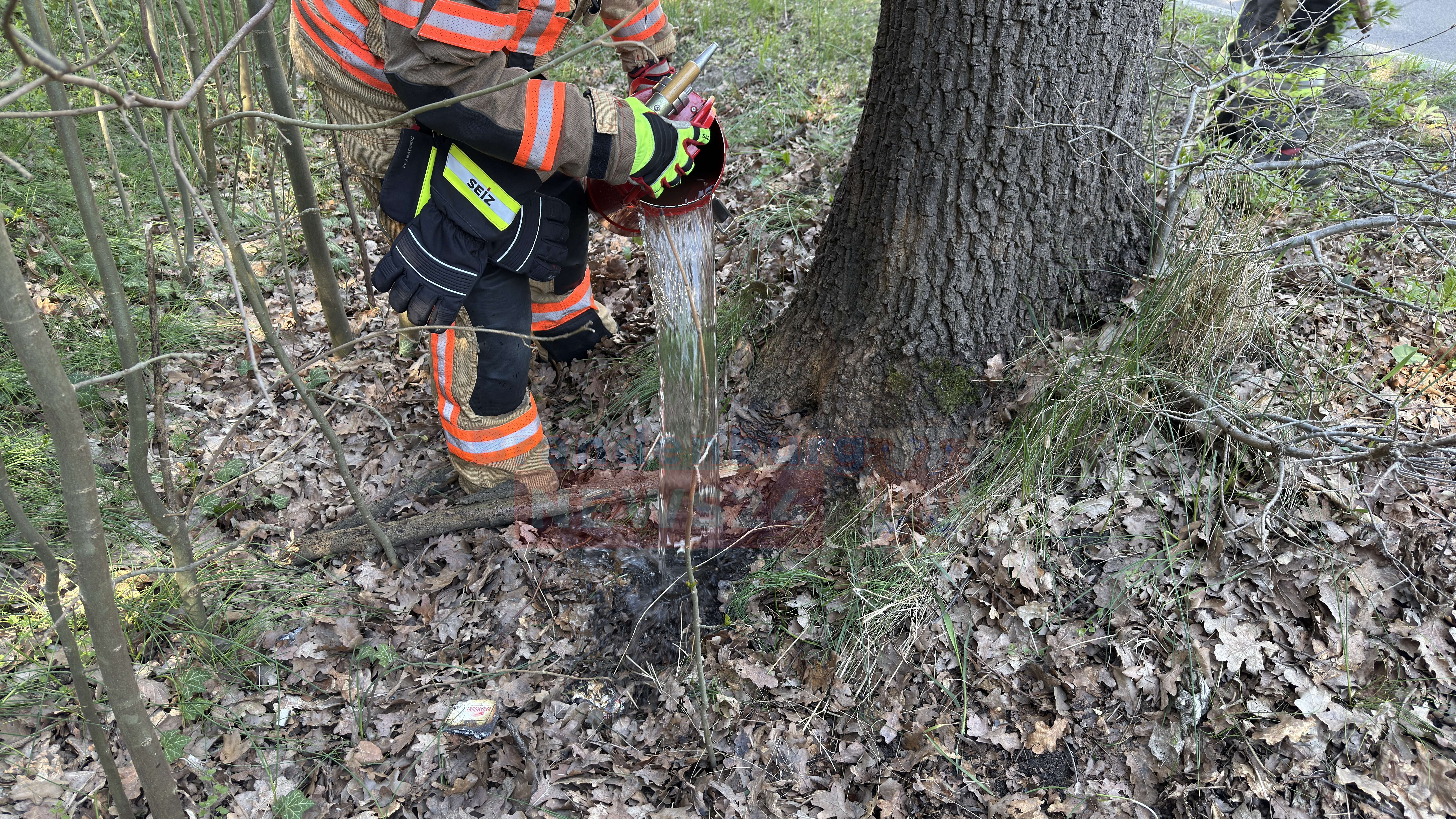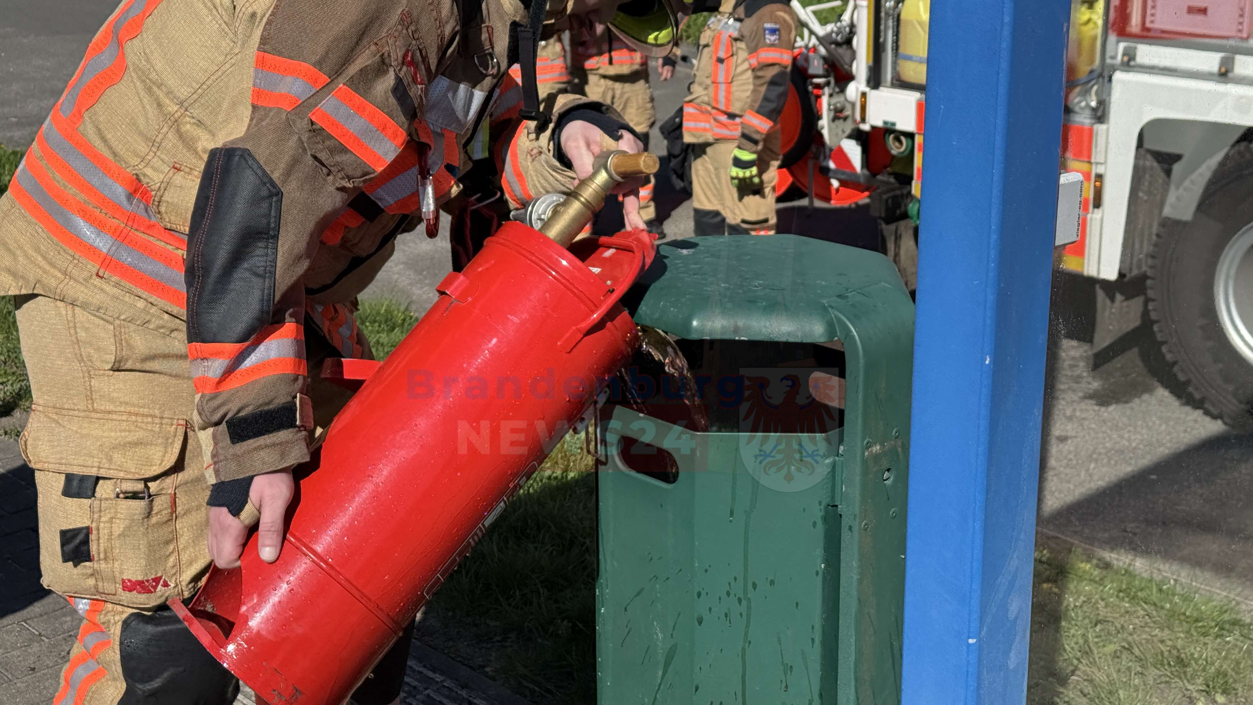 Als die Einsatzkräfte der Feuerwehr Neuruppin kurz darauf am Ort des Geschehens eintrafen, war die größte Gefahr bereits gebannt. Die Feuerwehrleute löschten den qualmenden Mülleimer mit einer Kübelspritze ab und wässerten den Bereich des kleinen Flächenbrandes zur Sicherheit noch einmal gründlich nach.