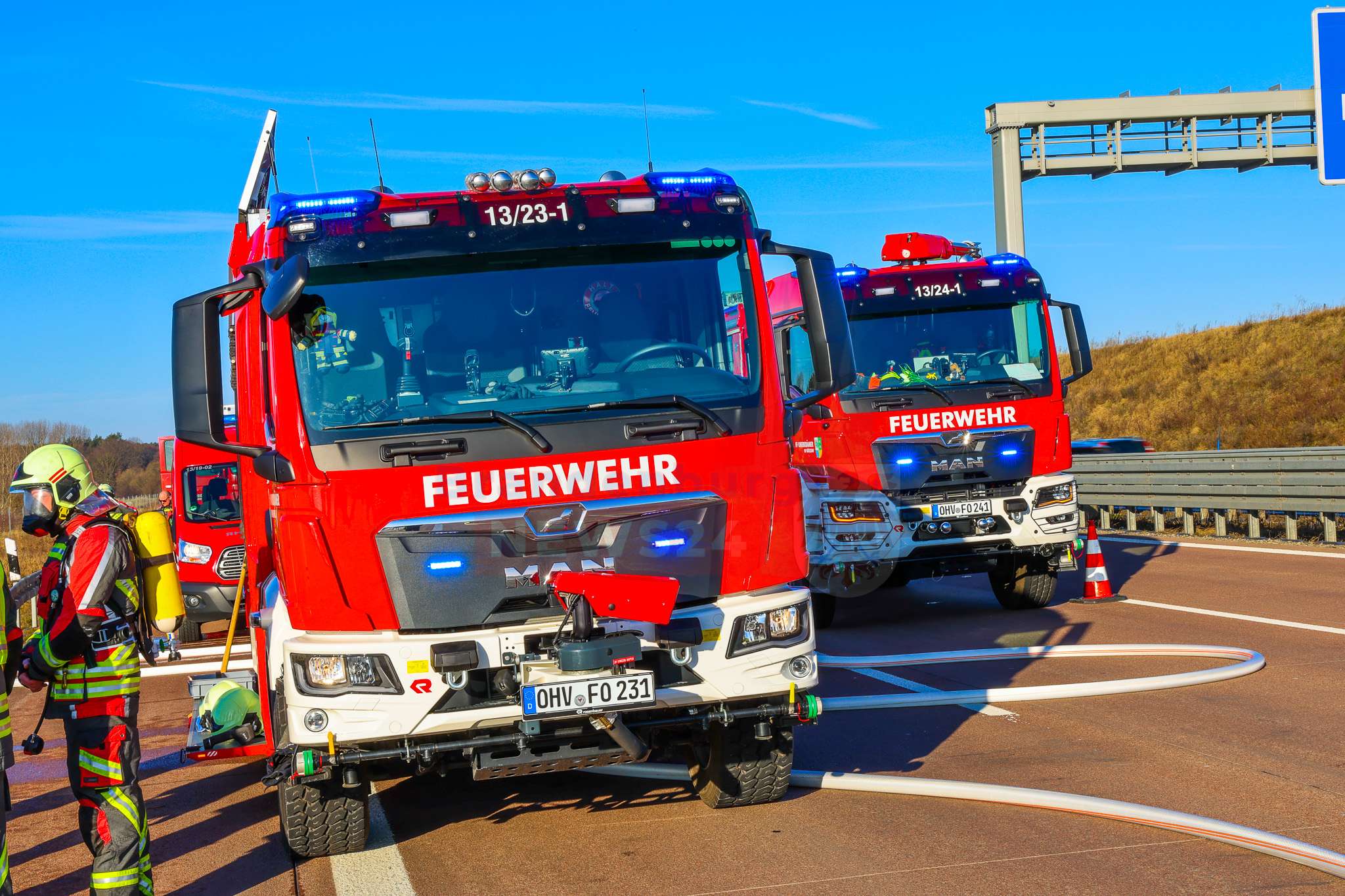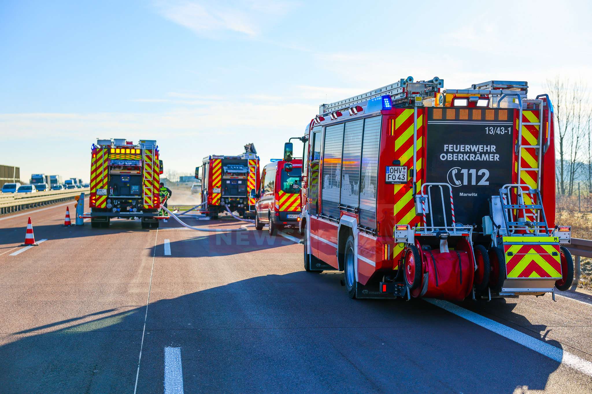 Umgehend leitete ein Trupp unter Atemschutz die Brandbekämpfung mit einem C-Rohr ein. Aufgrund der starken Rauchentwicklung musste die A10 zunächst kurzzeitig in beide Fahrtrichtungen voll gesperrt werden. In der Folge kam es zu einem langen Rückstau im morgendlichen Berufsverkehr. Nachdem sich die Rauchentwicklung deutlich verringert hatte, konnte der Verkehr schrittweise wieder freigegeben werden.