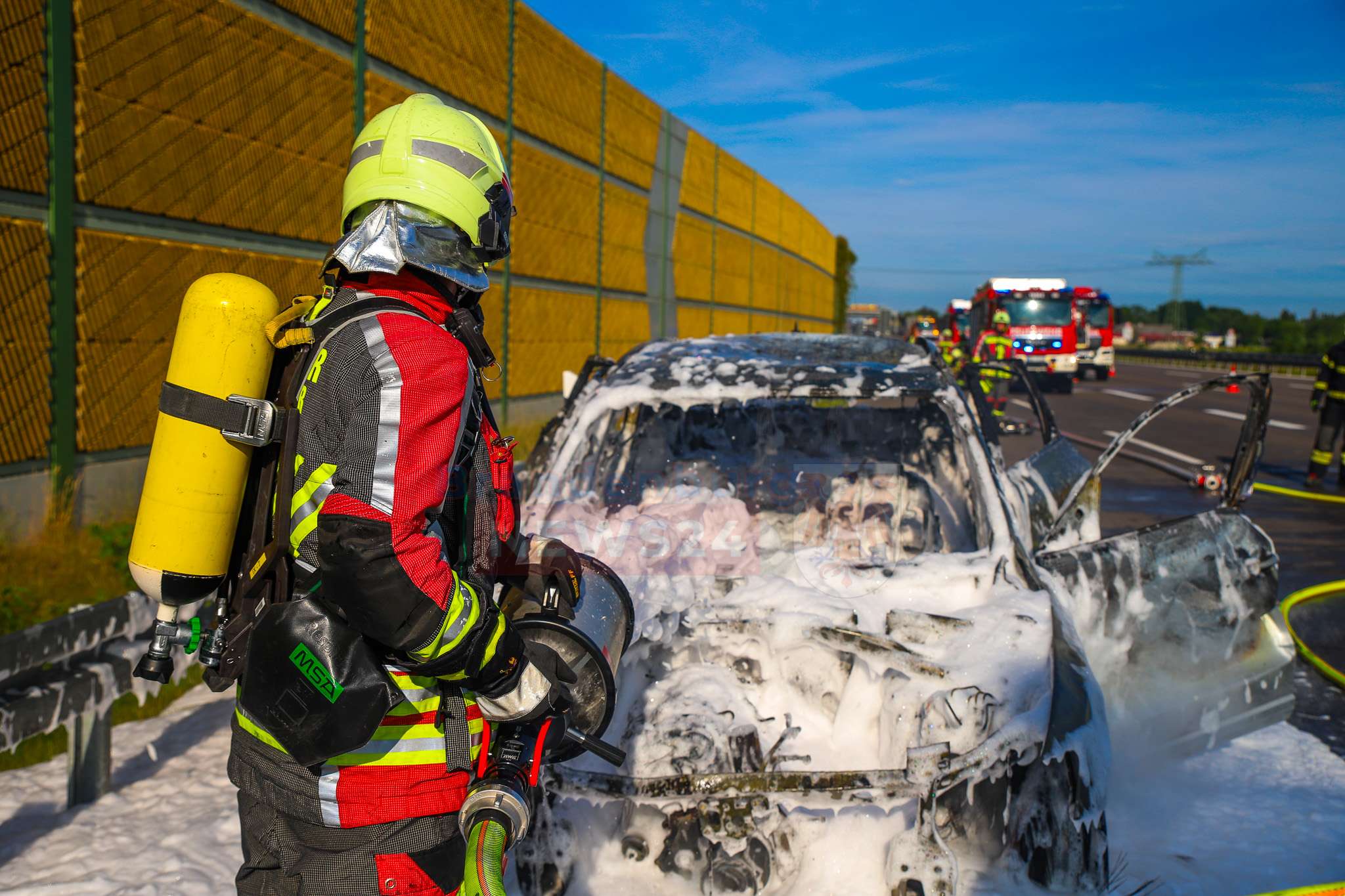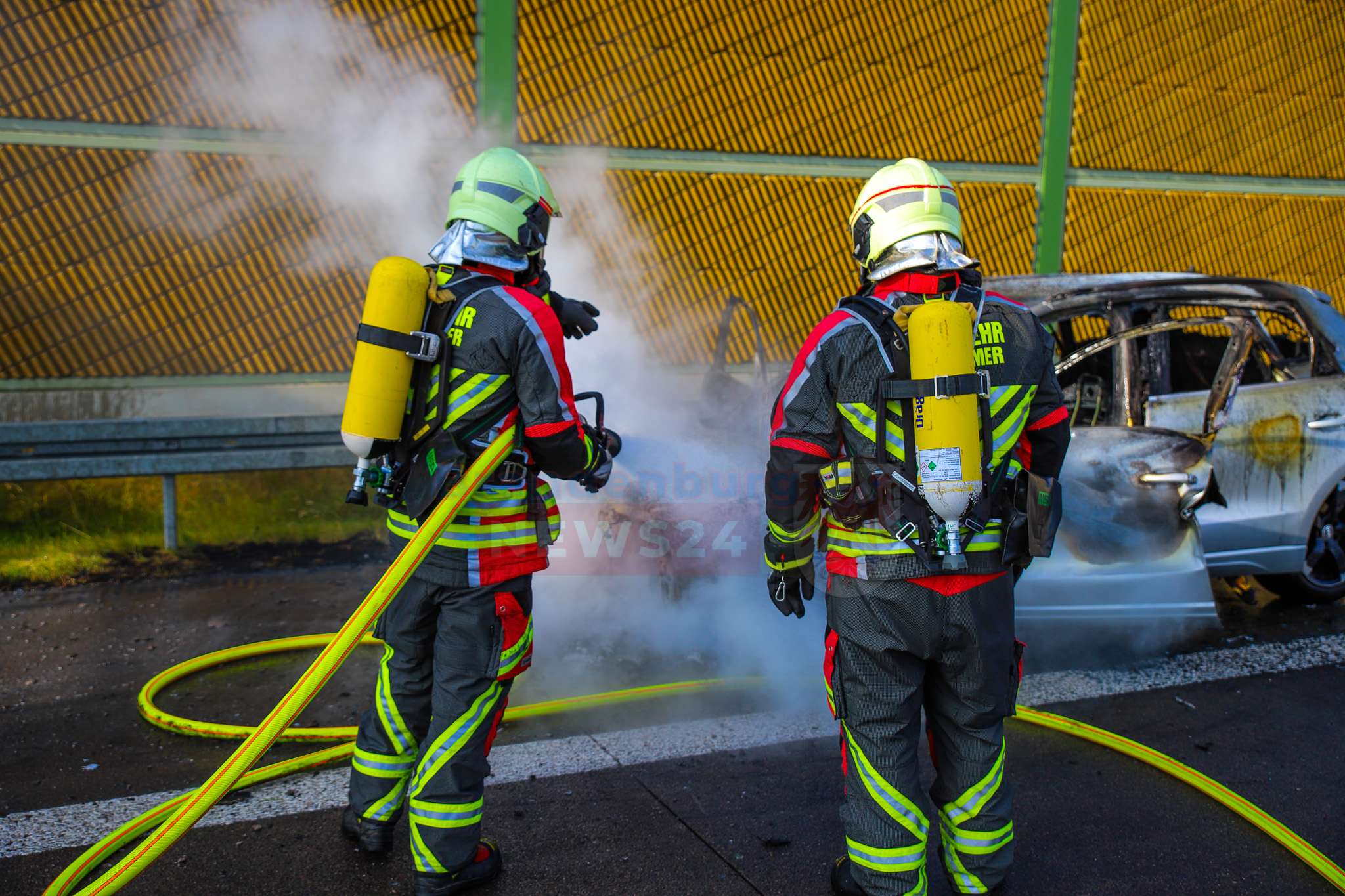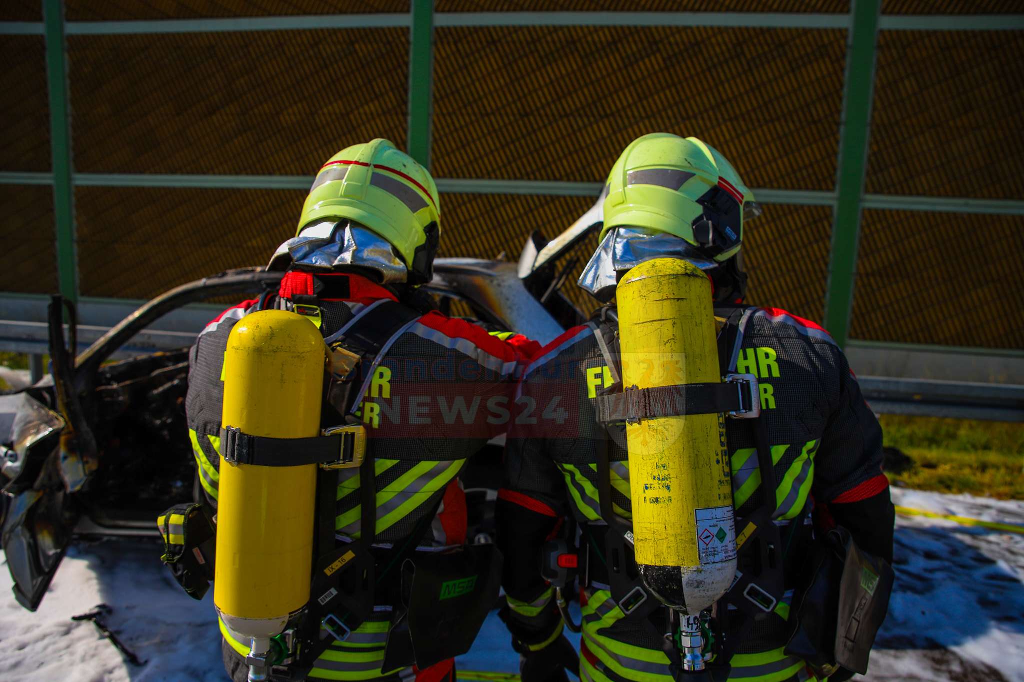 Bereits auf der Anfahrt war eine starke Rauchentwicklung sichtbar. Die Feuerwehren aus Bötzow und Vehlefanz rückten umgehend zur Einsatzstelle aus. Beim Eintreffen der ersten Kräfte stand der PKW auf dem Seitenstreifen in Vollbrand. Sofort ging ein Trupp unter schwerem Atemschutz zur Brandbekämpfung vor.