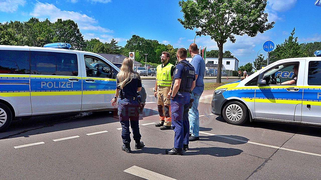 „Wir sind heute um 8.37 Uhr zur Unterstützung der Polizei hier in den Barbimost-Ring alarmiert worden. Hier ist ein Sprengkörper auf dem Parkplatz gefunden worden, Weltkriegsmunition aus dem Zweiten Weltkrieg. Die Polizei hat ein Absperr- und Evakuierungsradius von 50 Metern um das Objekt festgelegt, sodass wir die Polizei dabei unterstützt haben – in den Straßen Heinrich-von-Gleis-Straße und An den Teichwiesen.“
