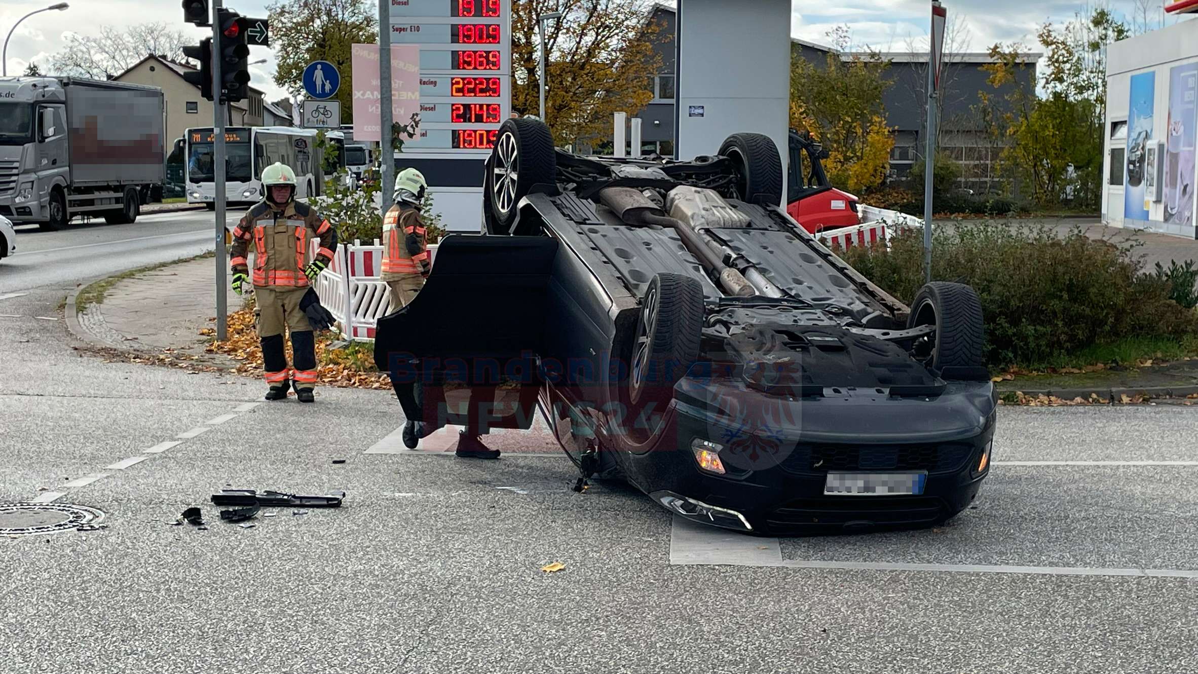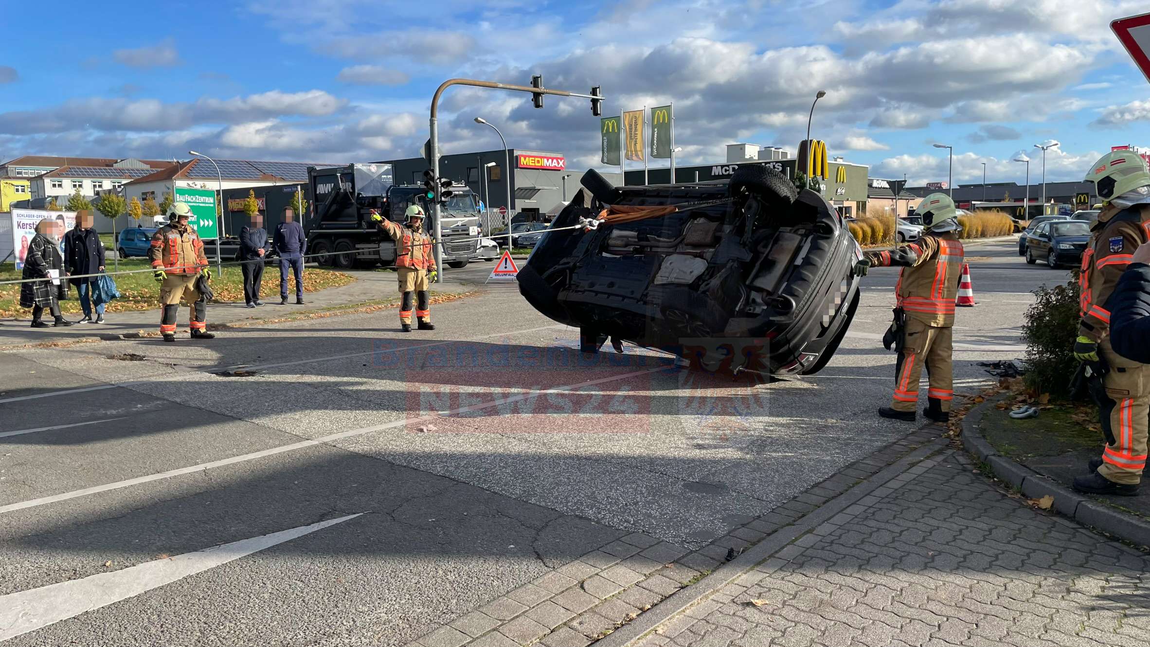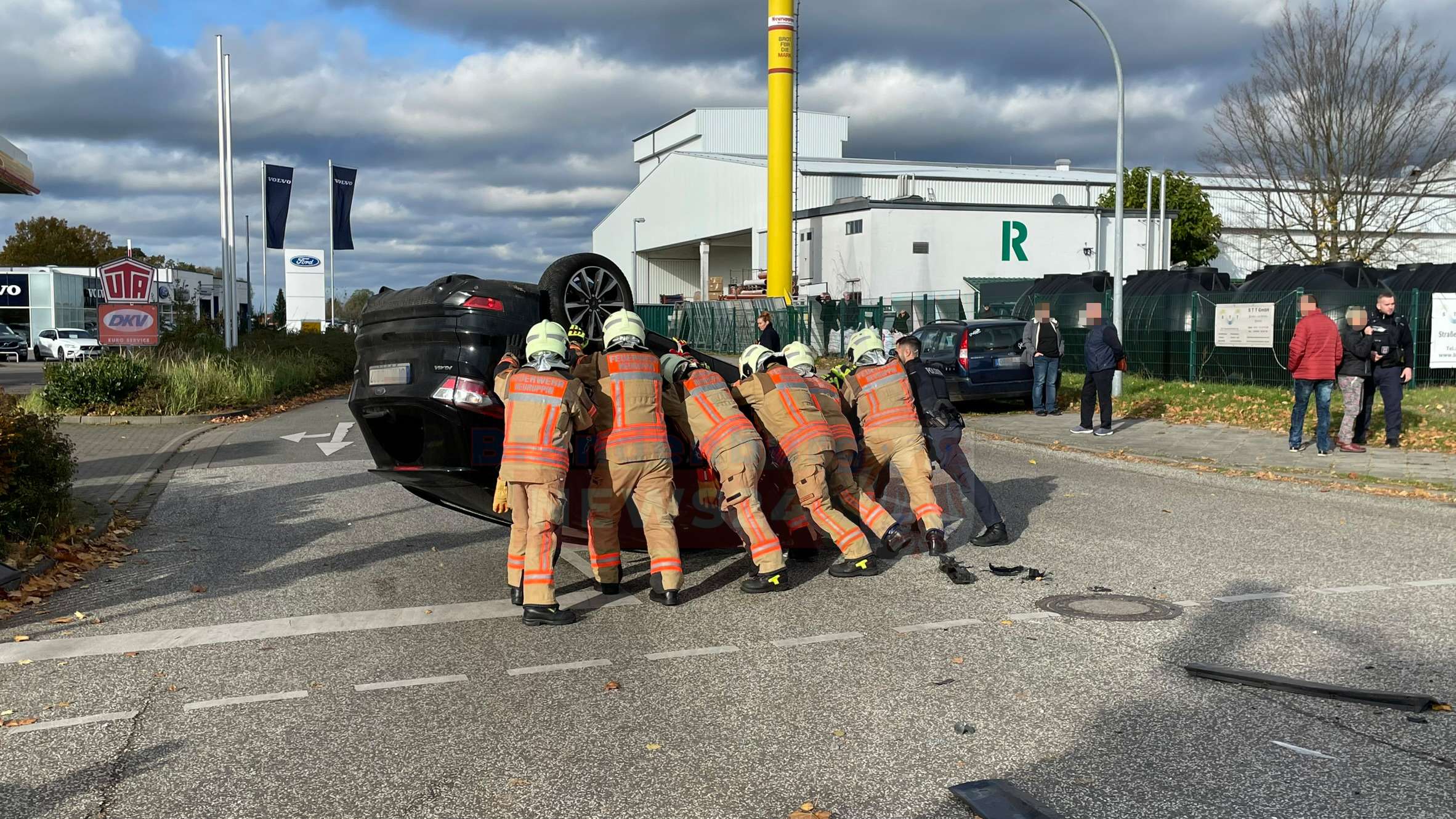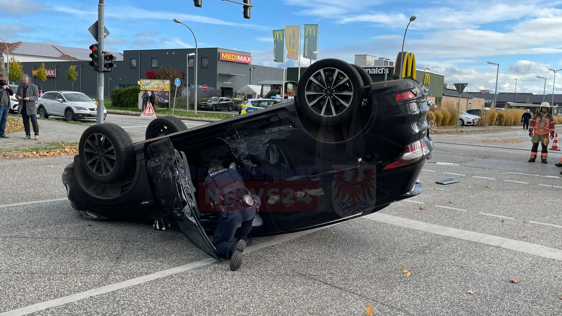 Die Kollision war so heftig, dass der 86-jährige Ford Fahrer mit seinem Personenkraftwagen sich überschlug. Bei Eintreffen der Feuerwehr war bereits die Polizei sowie der Rettungsdienst vor Ort.