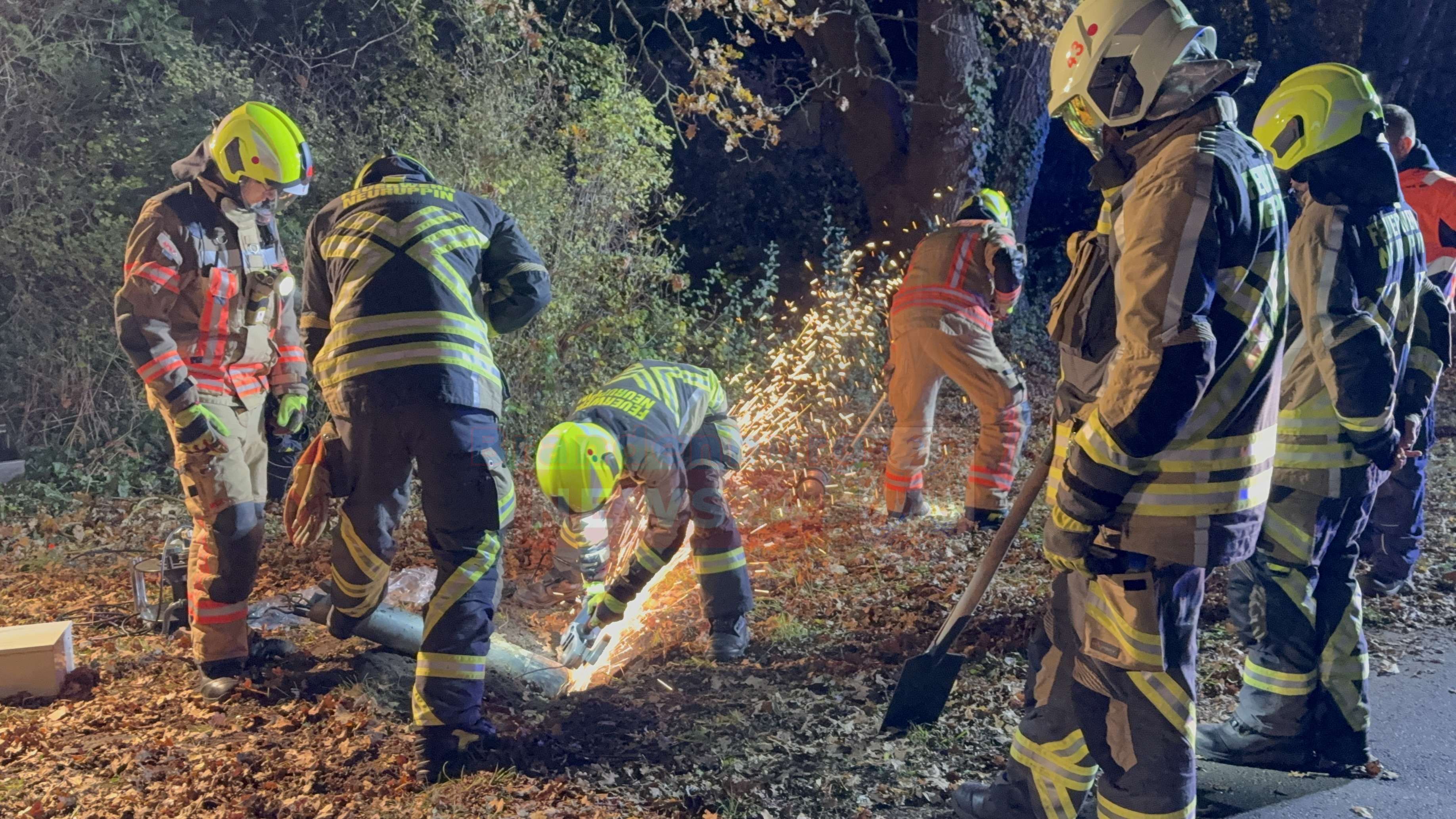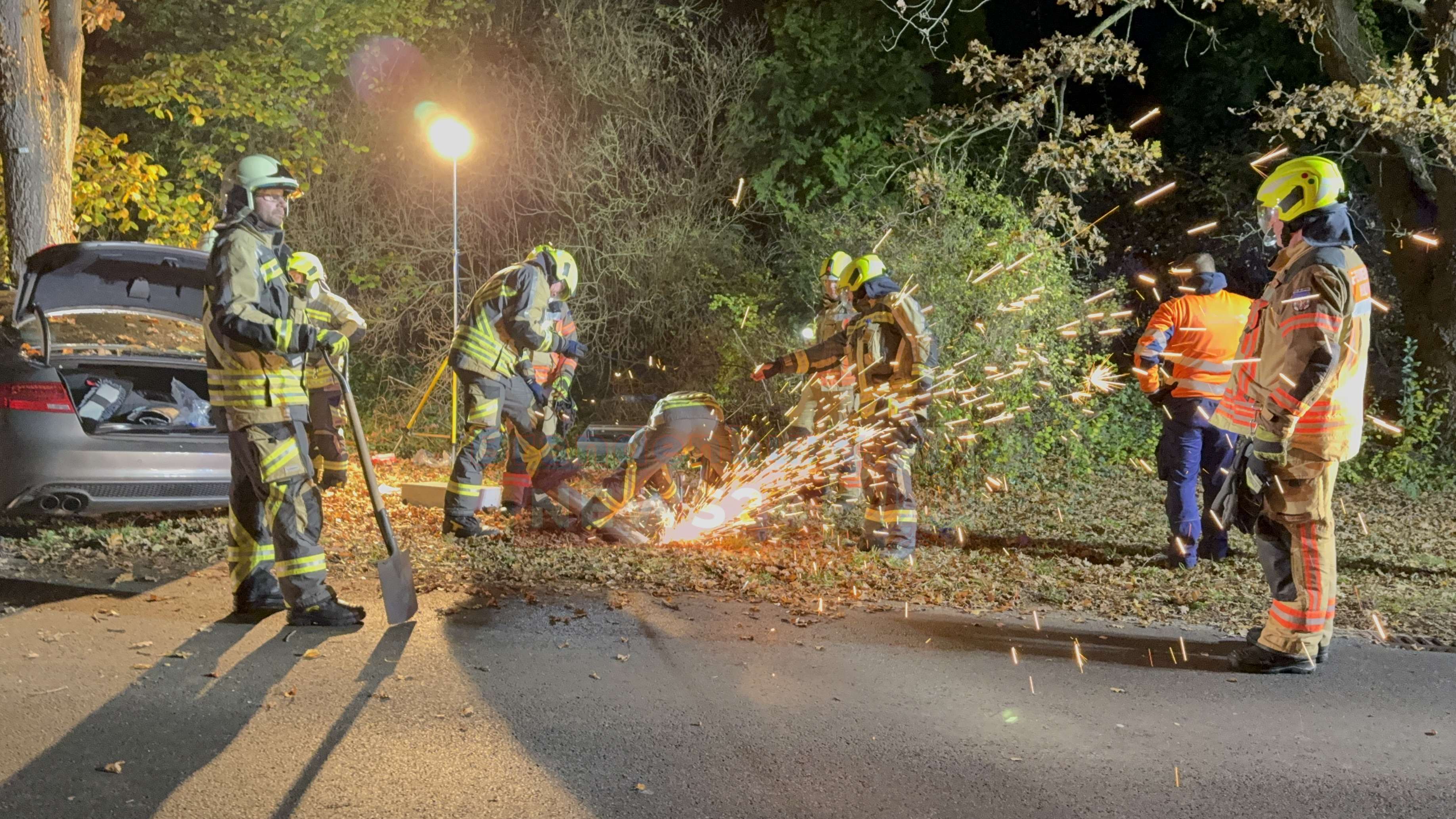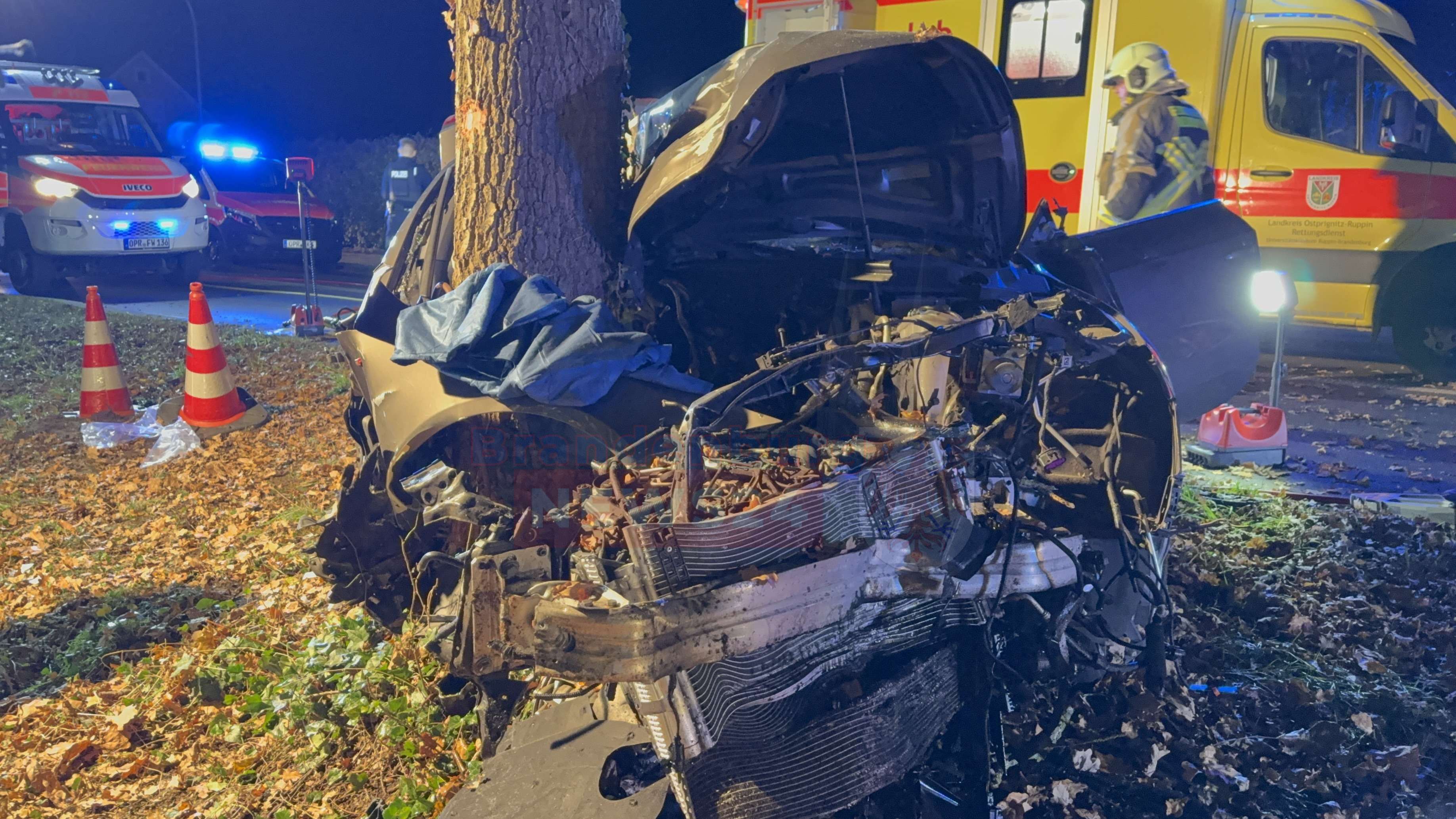Um 22:13 Uhr wurde die Feuerwehr Neuruppin mit dem Stichwort "Verkehrsunfall, eingeklemmte Person" alarmiert. "Vor Ort haben wir vorgefunden, dass sich das Einsatzbild bestätigt hat", berichtete Einsatzleiter Kevin Grigorian. Die Wucht des Aufpralls war so enorm, dass der Baum den Beifahrersitz tief in die Fahrgastzelle drückte.