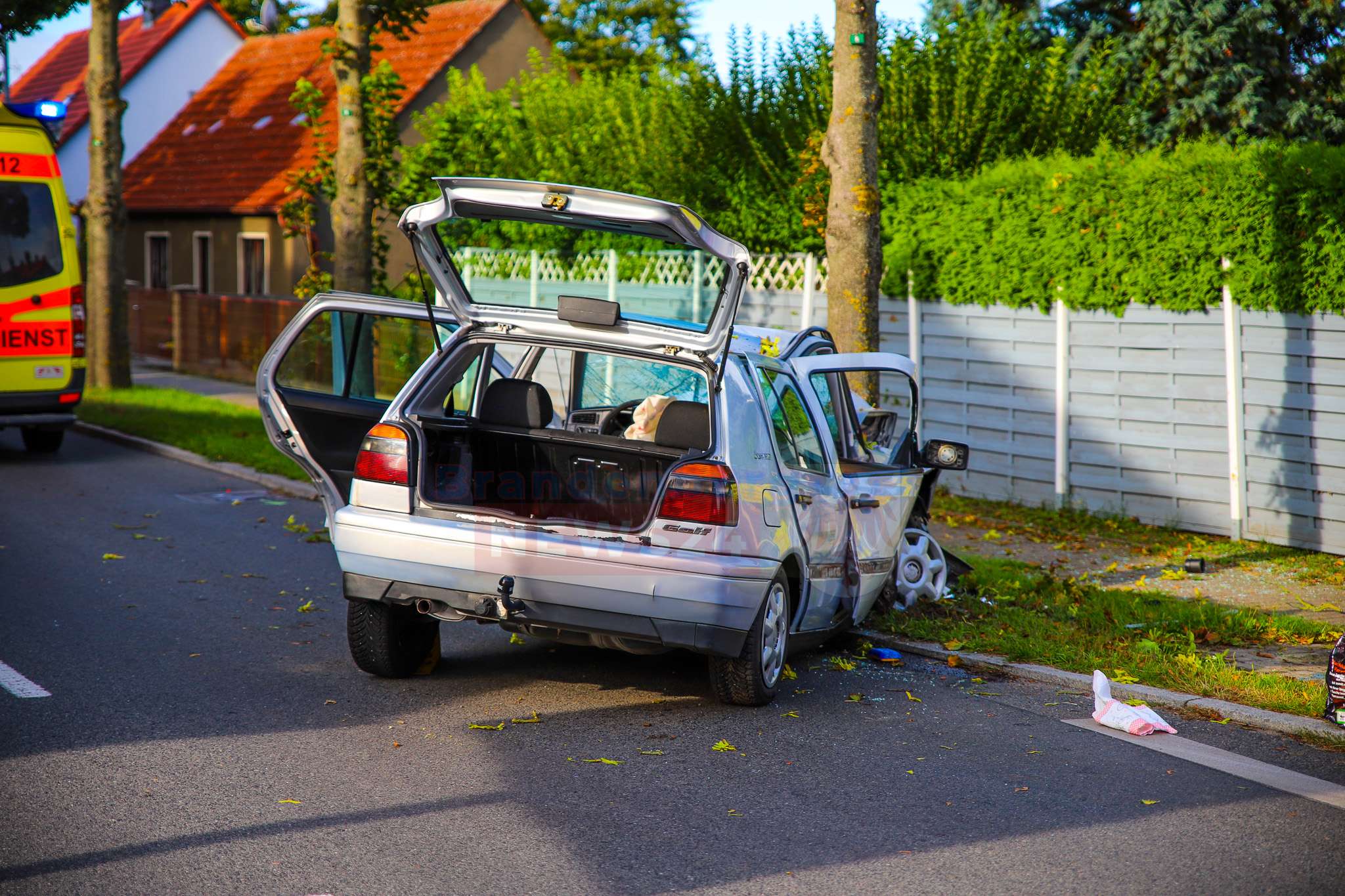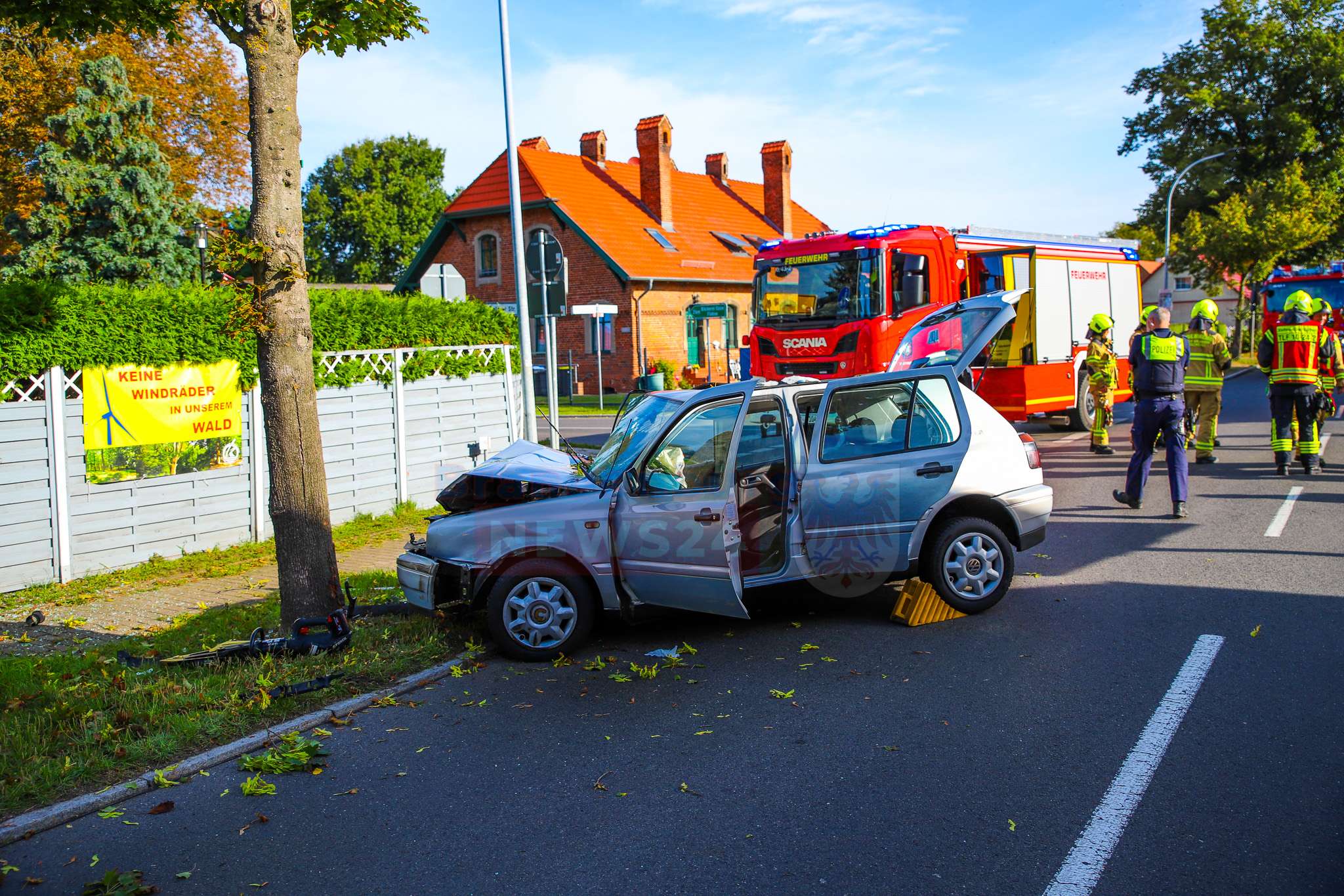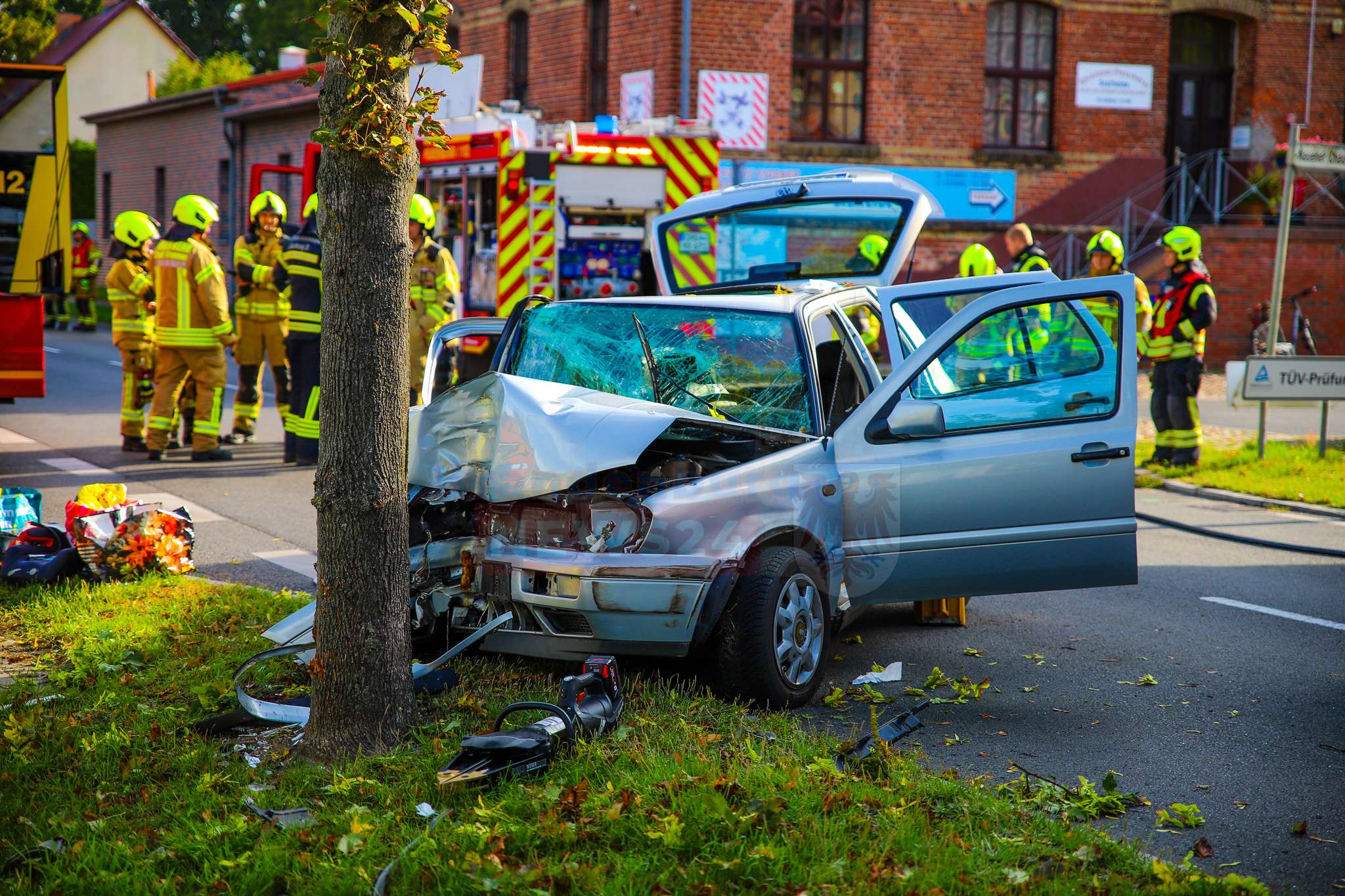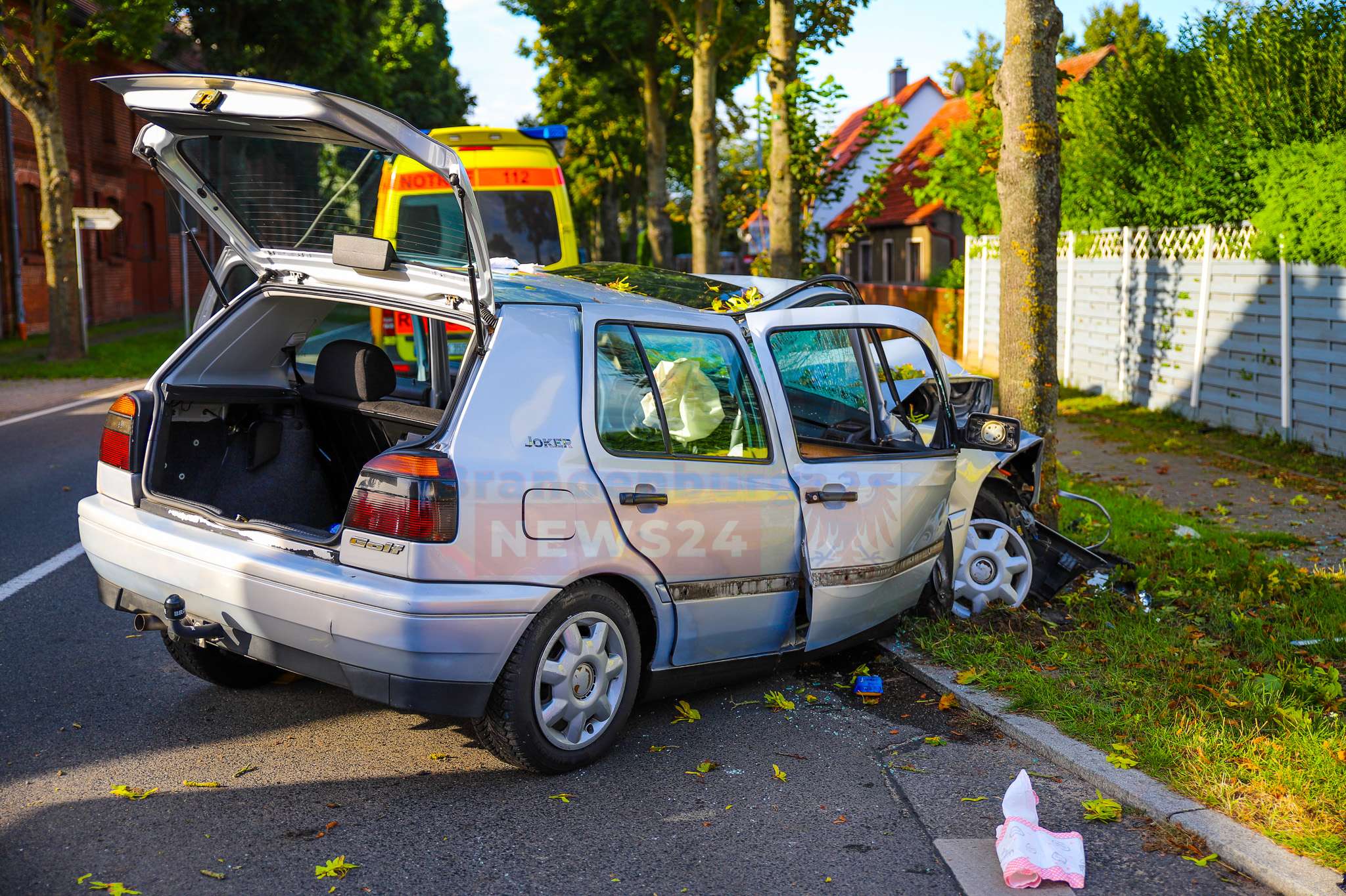 Ein VW Golf versuchte dem fehlerhaften Abbiegen eines anderen Fahrzeugs auszuweichen und prallte dabei frontal gegen einen Straßenbaum. Dabei wurde eine Person schwer verletzt, eine weitere leicht verletzt. Beide wurden durch den Rettungsdienst in ein Krankenhaus gebracht.