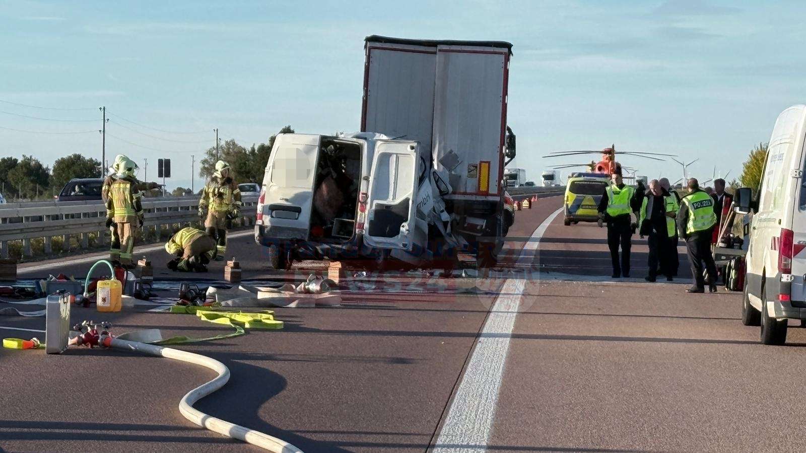 Der Fahrer des Transporters erlitt dabei tödliche Verletzungen und verstarb noch an der Unfallstelle. Der Lkw-Fahrer wurde verletzt und nach erster medizinischer Versorgung in ein Krankenhaus eingeliefert.