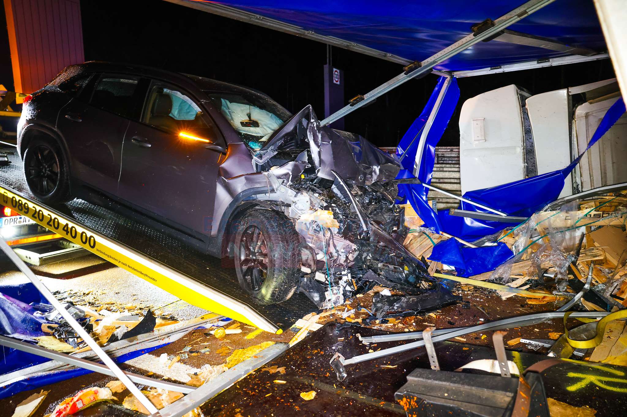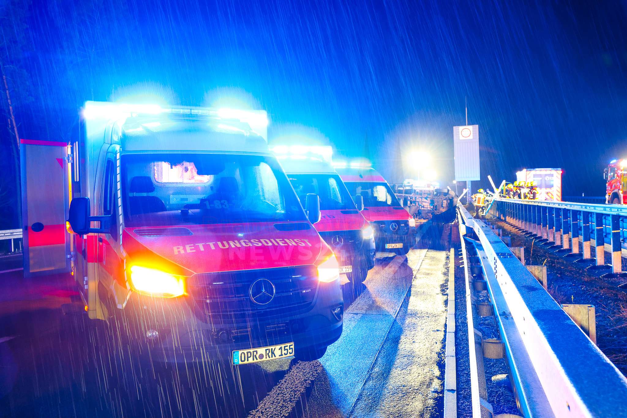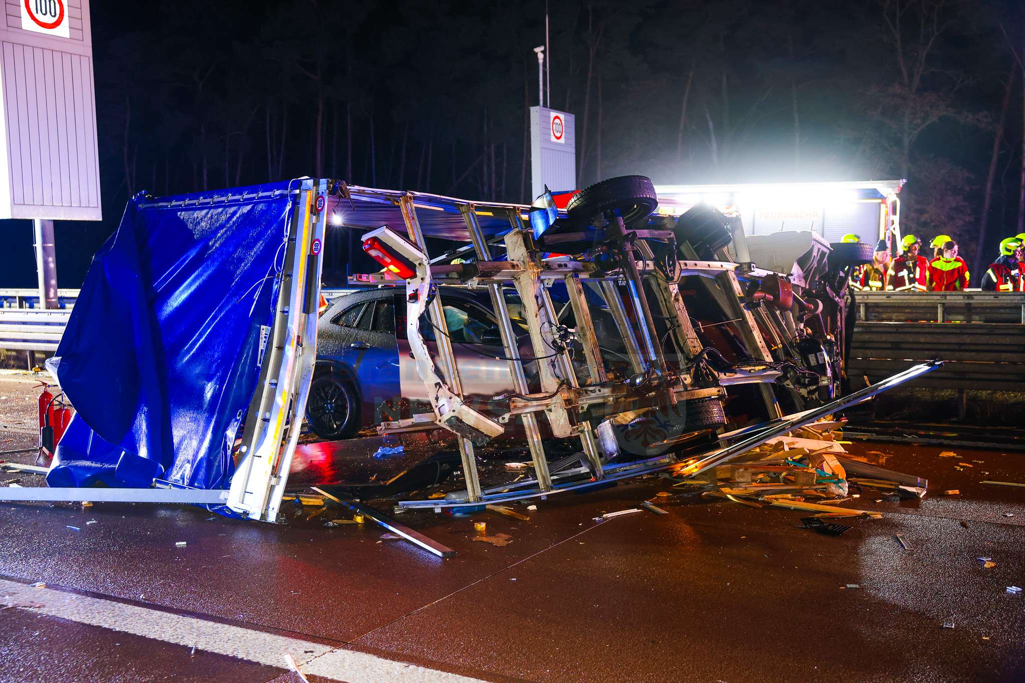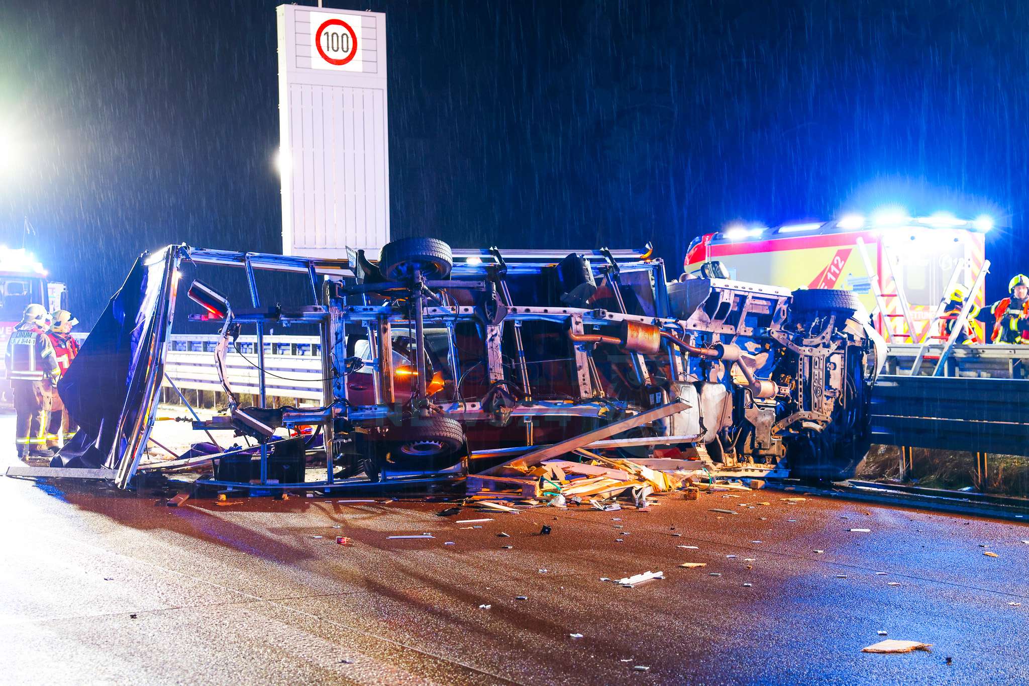 Nach ersten Erkenntnissen war der Kleintransporter in die Leitplanke gefahren, kippte um und blieb quer über die Fahrbahn liegen. Ein nachfolgender Pkw prallte frontal in das umgestürzte Fahrzeug. Ein drittes Auto kam etwa 100 Meter hinter der eigentlichen Unfallstelle auf dem Seitenstreifen zum Stehen.