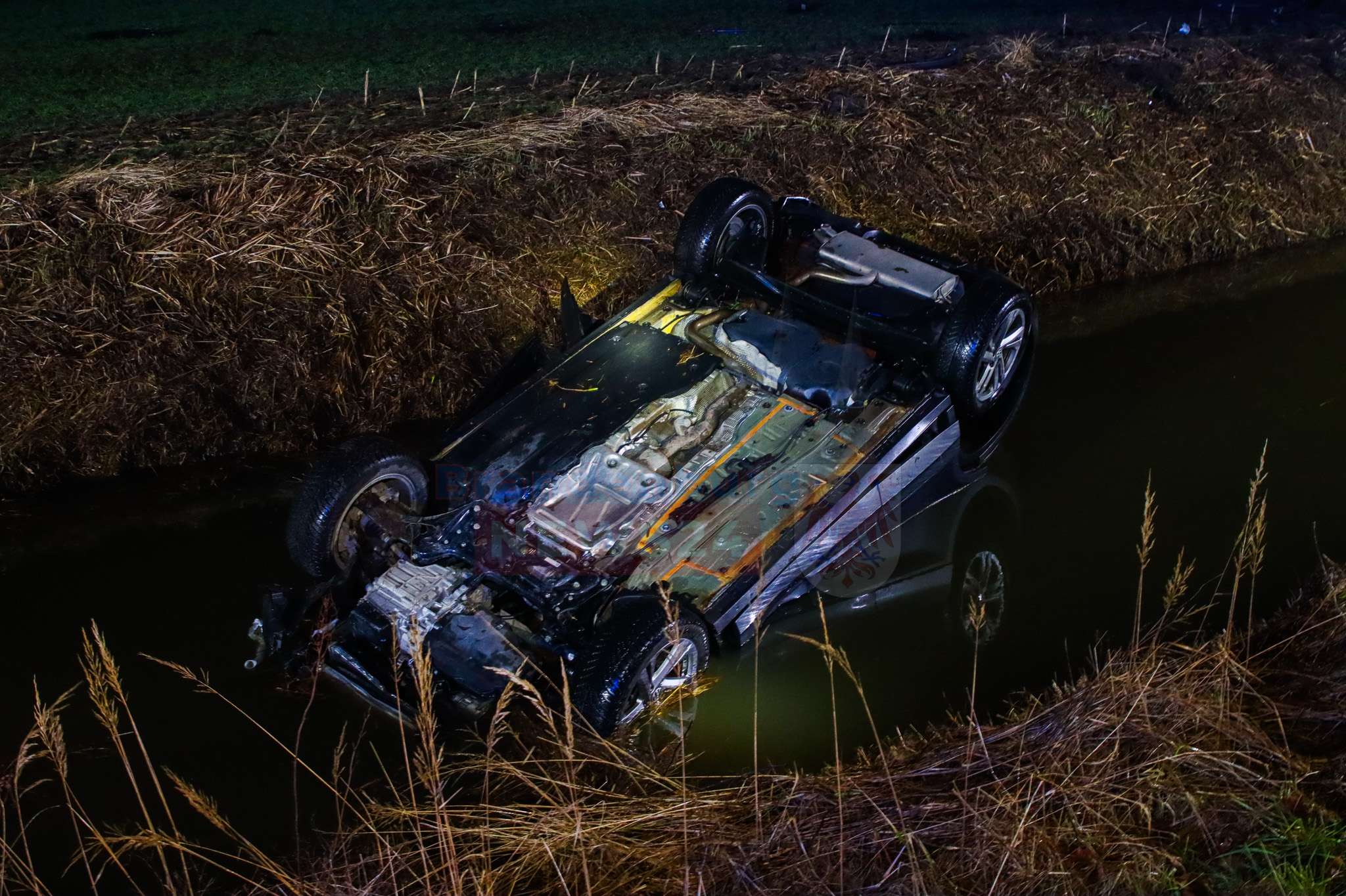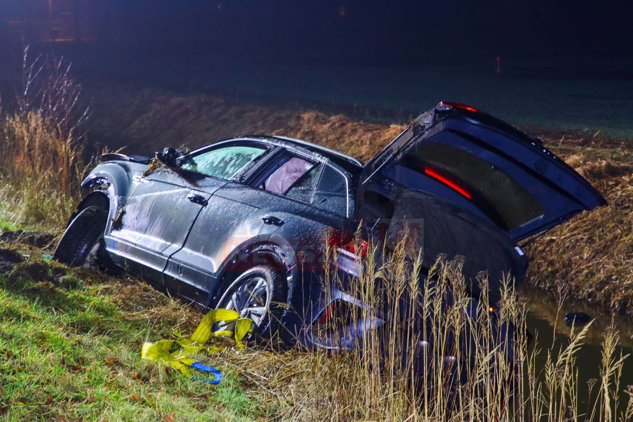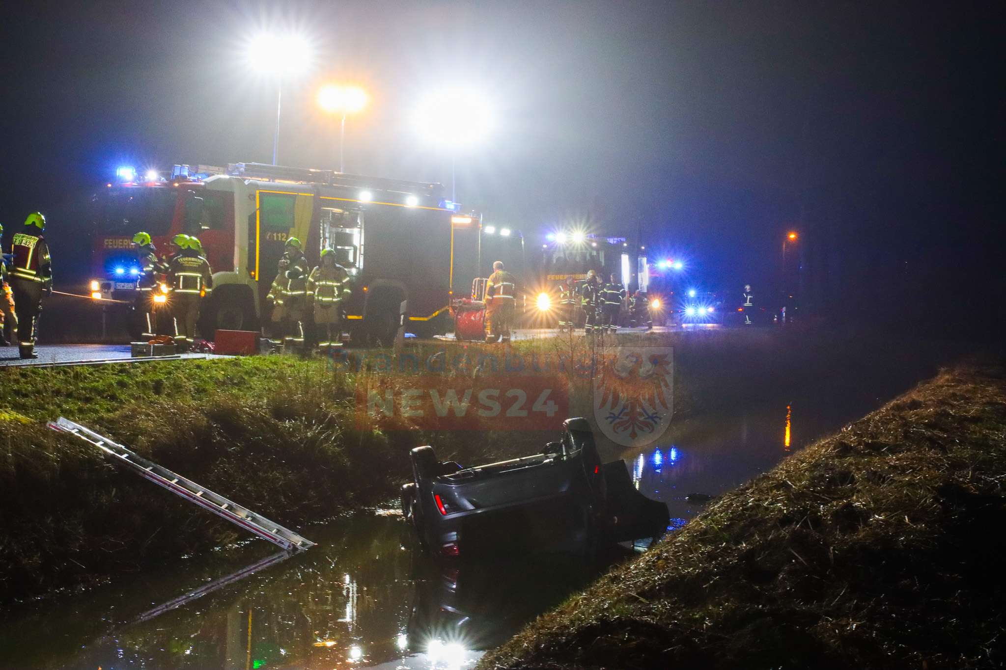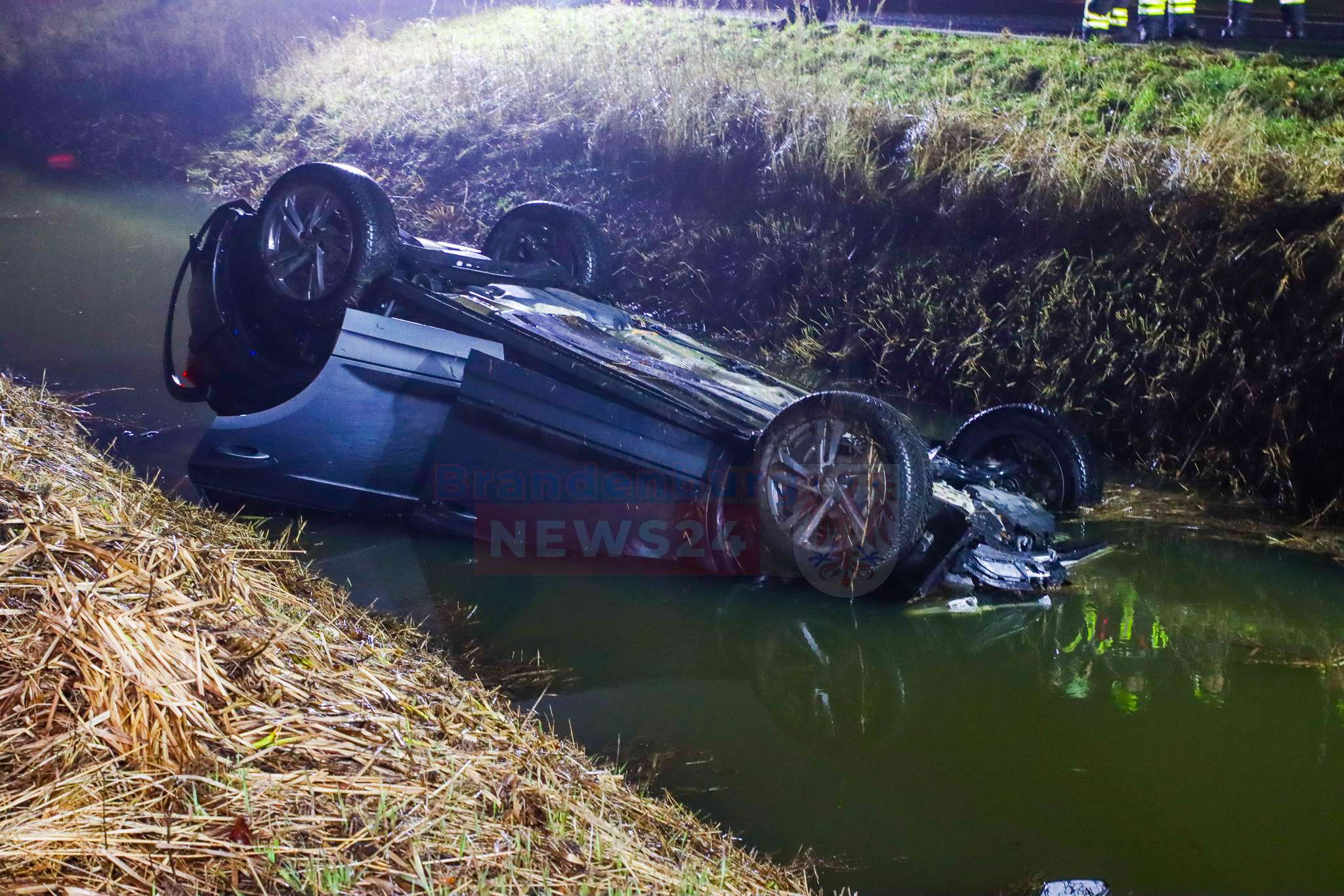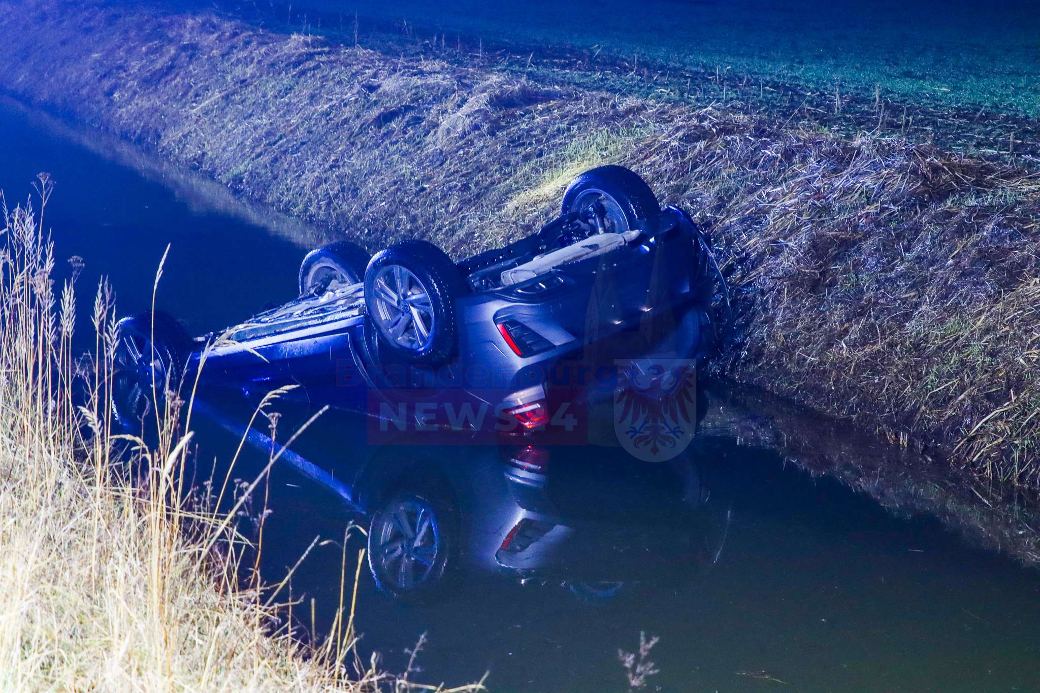 Als der PKW kopfüber in einem überfluteten Straßengraben zum liegen kam, befreiten sich die drei Insassen des Fahrzeugs selbständig, bevor der Fahrgastraum komplett mit Wasser gefüllt war. Anschließend informierten sie die Rettungskräfte der Polizei und Rettungsdienst.