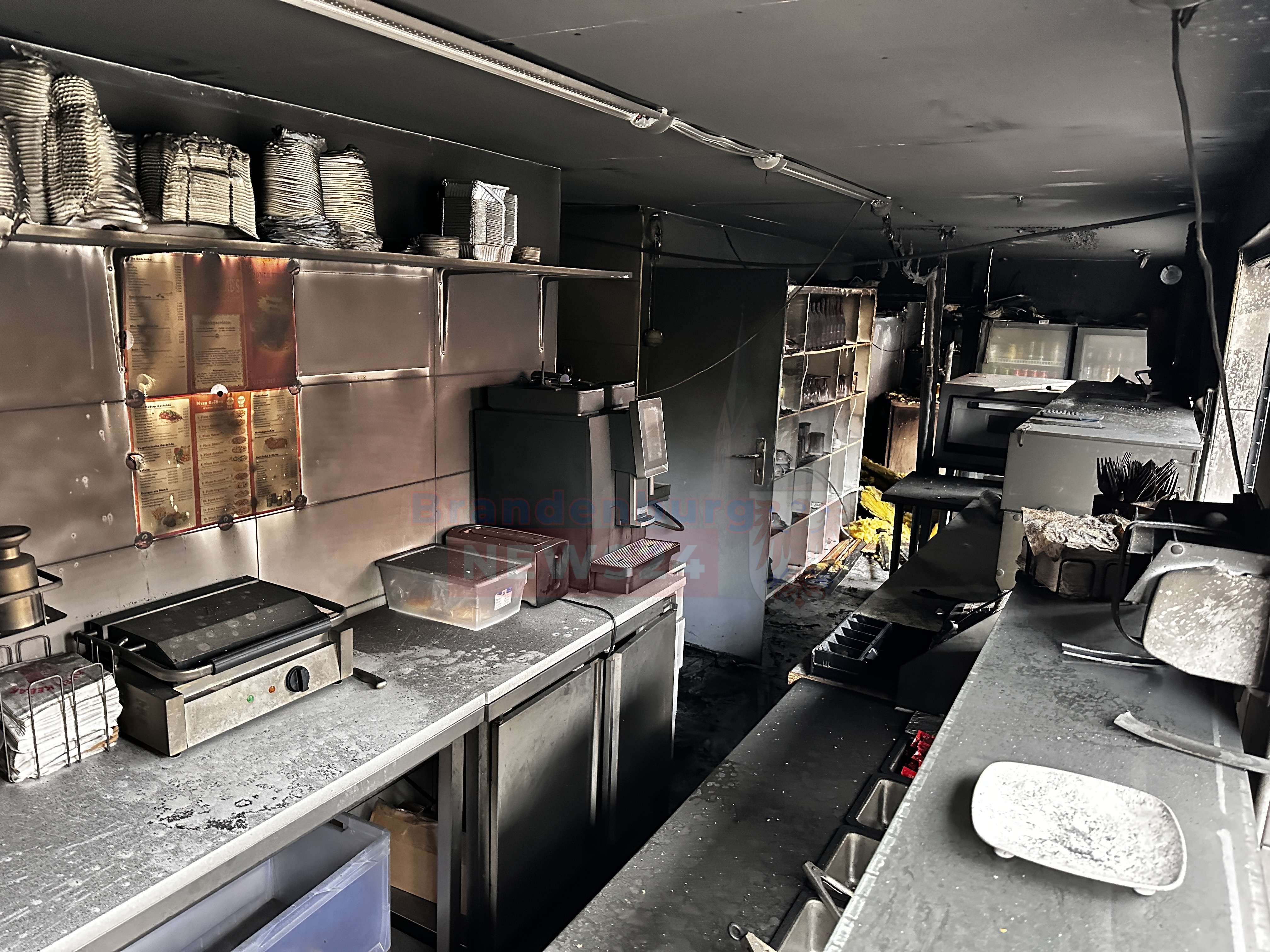 Bilder aus dem Inneren zeigen ein Bild der Verwüstung: schwarzer Ruß bedeckt die Wände, Küchengeräte sind geschmolzen. Ein Überwachungsvideo zeigt eindeutig, wie die Täter in den Imbiss eindrangen, randalierten und letztendlich Benzin im vorraum verteilen.