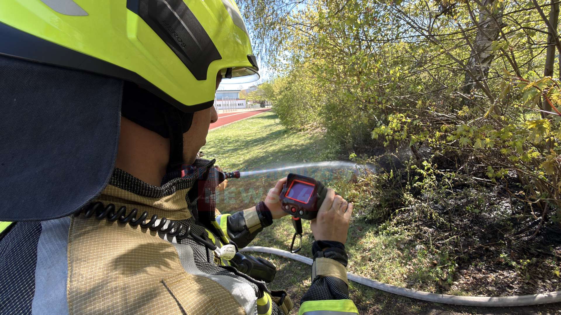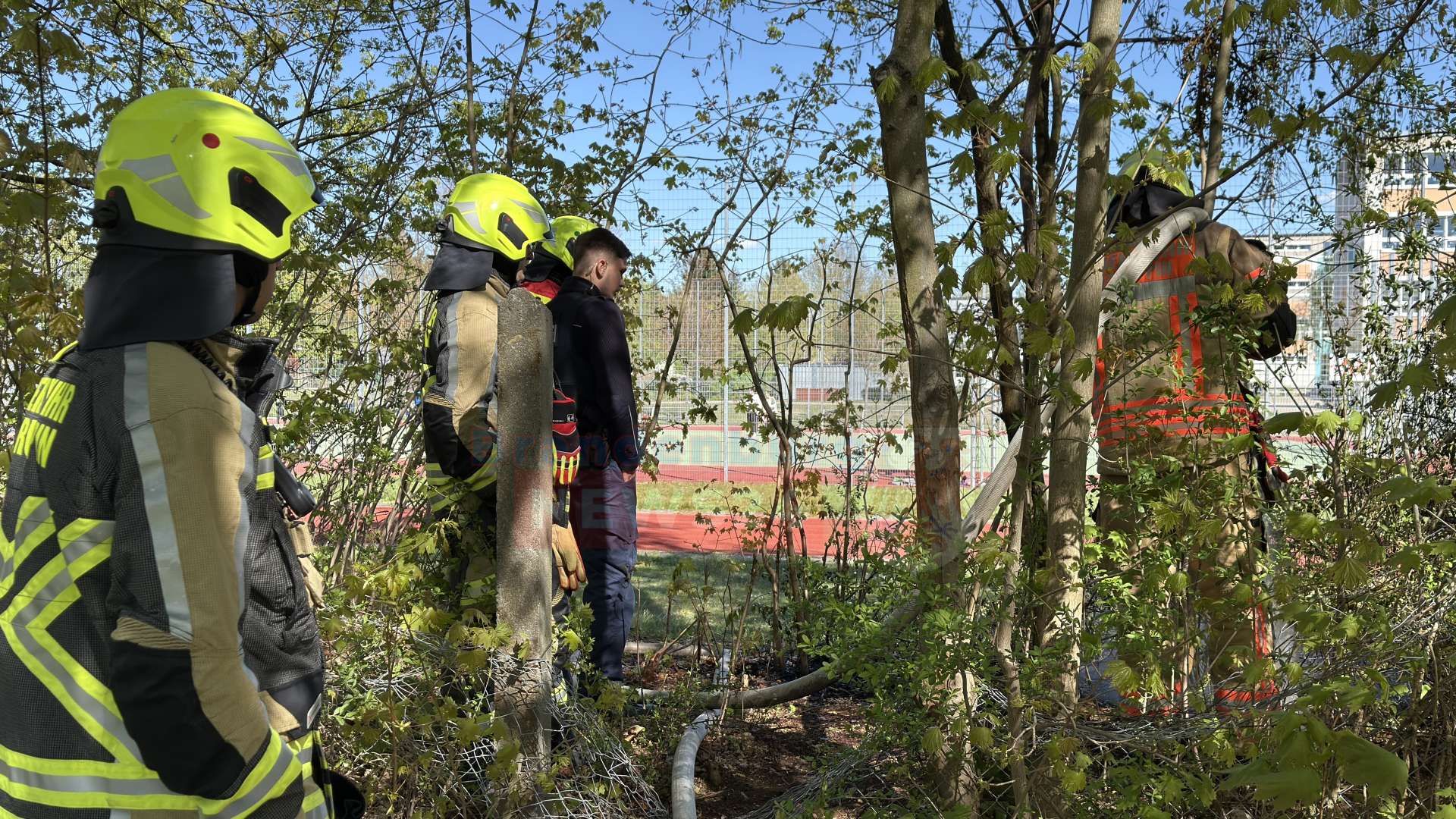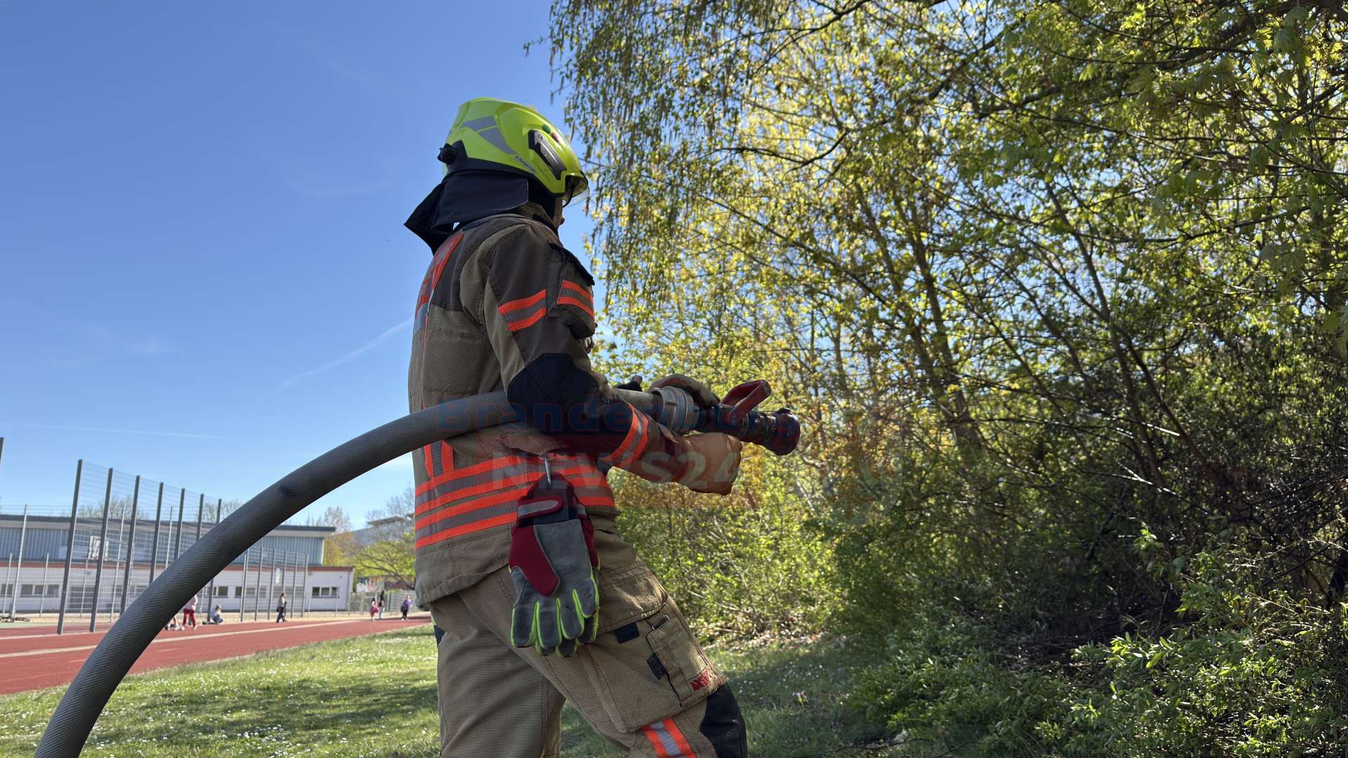 Gegen 15:00 Uhr wurden die Einsatzkräfte zunächst mit dem Alarmstichwort „Brand Klein“ verständigt. Als die Feuerwehrleute am Einsatzort eintrafen, zeigte sich jedoch, dass sich das Feuer bereits auf einer Fläche von rund zehn Quadratmetern im dichten Gebüsch und Unterholz direkt neben einem Fußweg am Sportplatz ausgebreitet hatte.