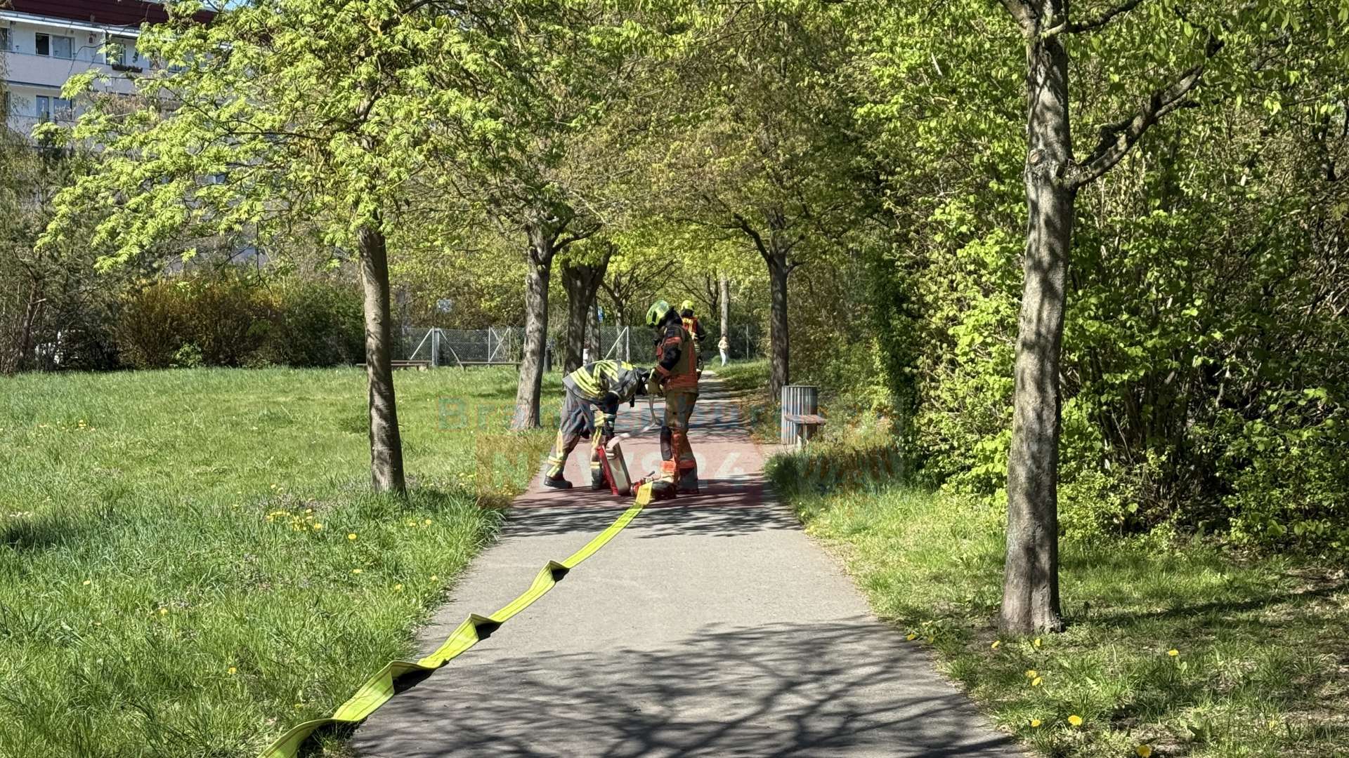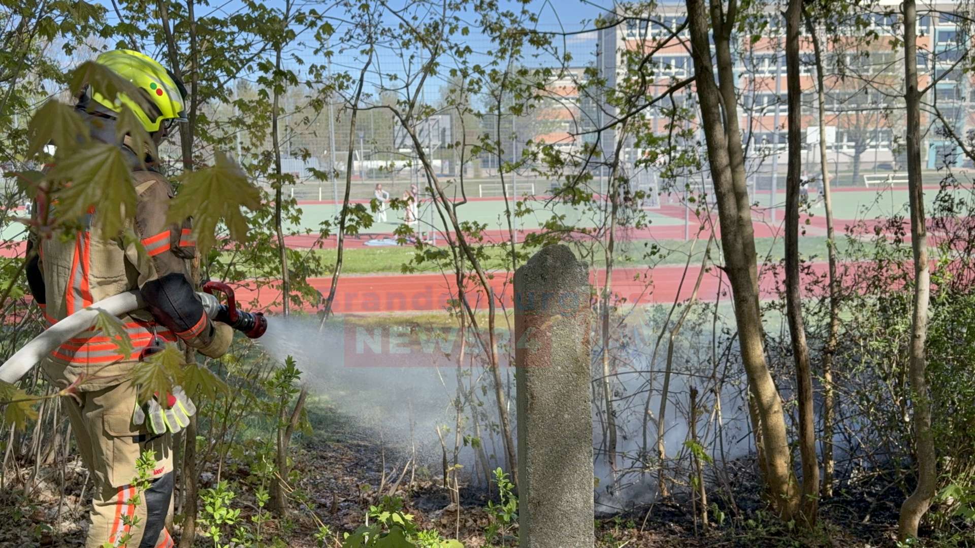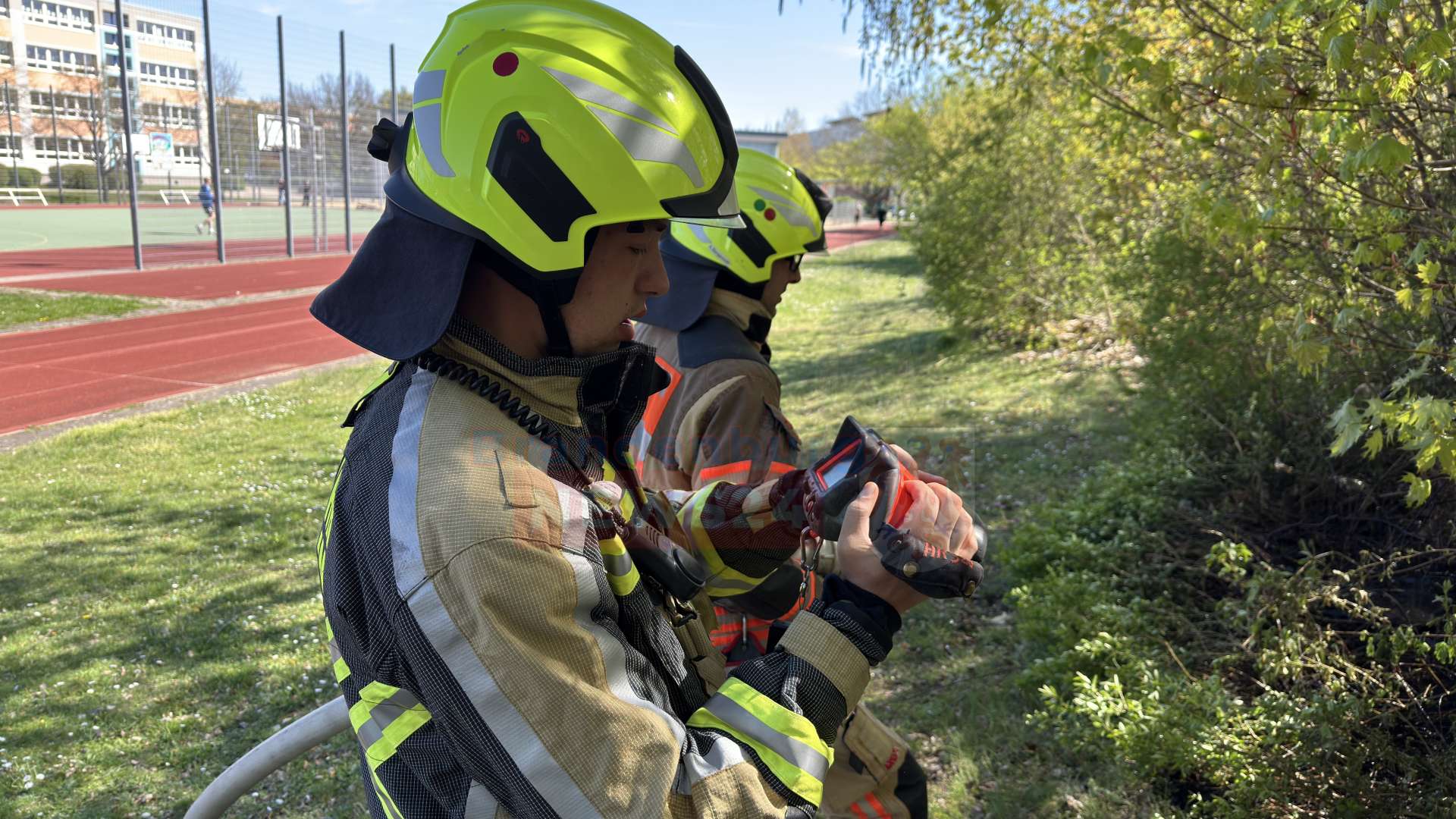 Gegen 15:00 Uhr wurden die Einsatzkräfte zunächst mit dem Alarmstichwort „Brand Klein“ verständigt. Als die Feuerwehrleute am Einsatzort eintrafen, zeigte sich jedoch, dass sich das Feuer bereits auf einer Fläche von rund zehn Quadratmetern im dichten Gebüsch und Unterholz direkt neben einem Fußweg am Sportplatz ausgebreitet hatte.