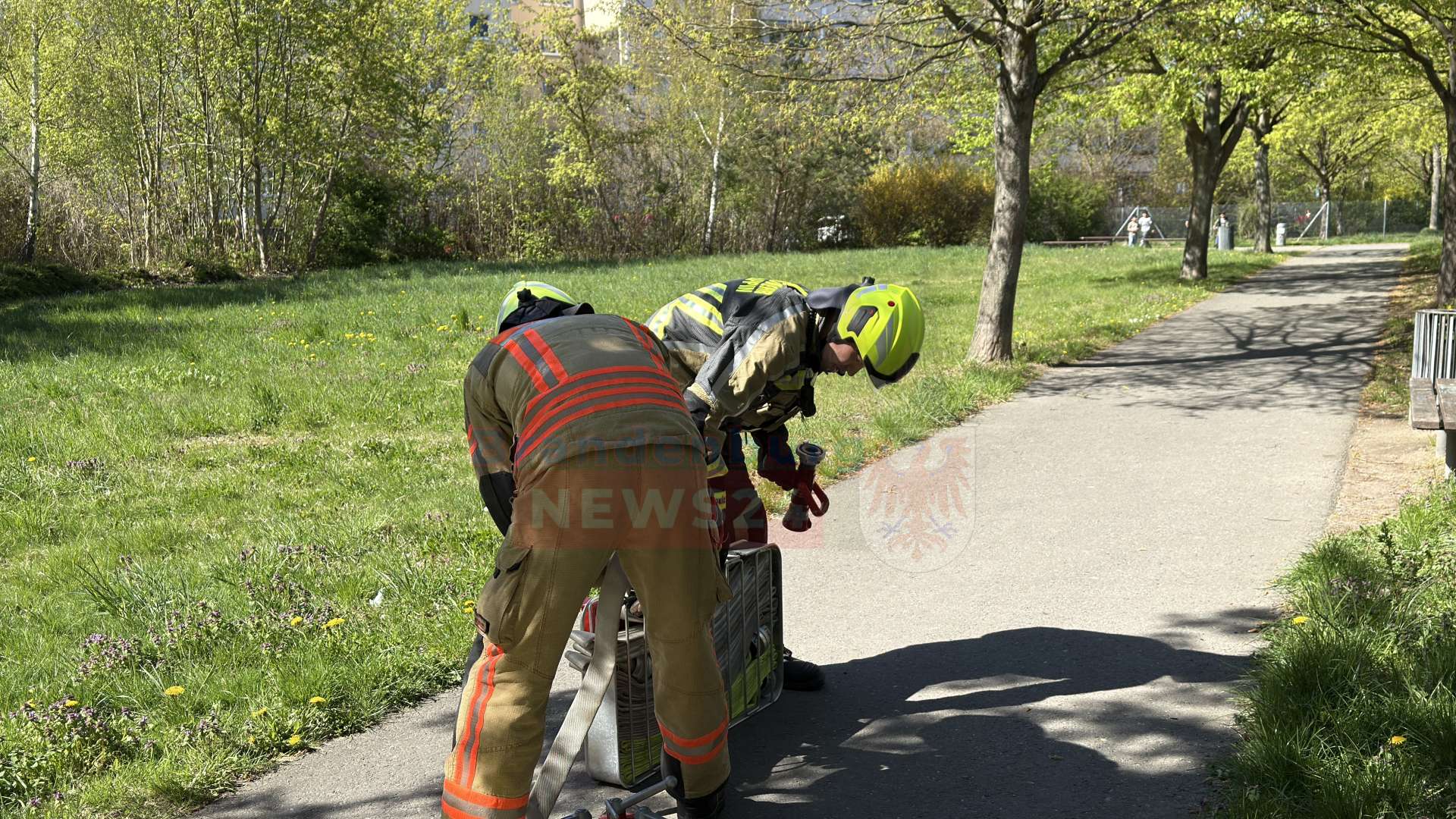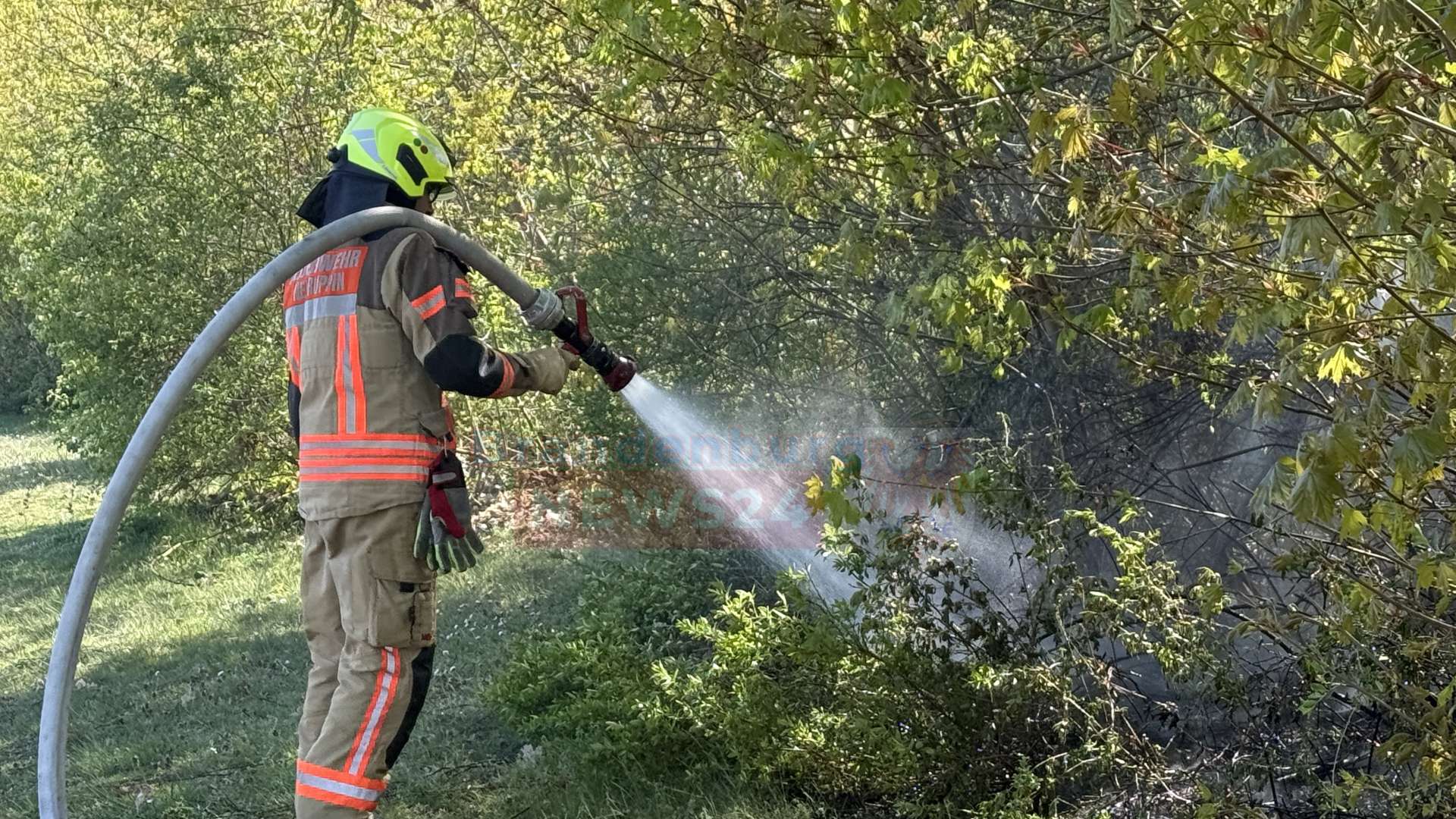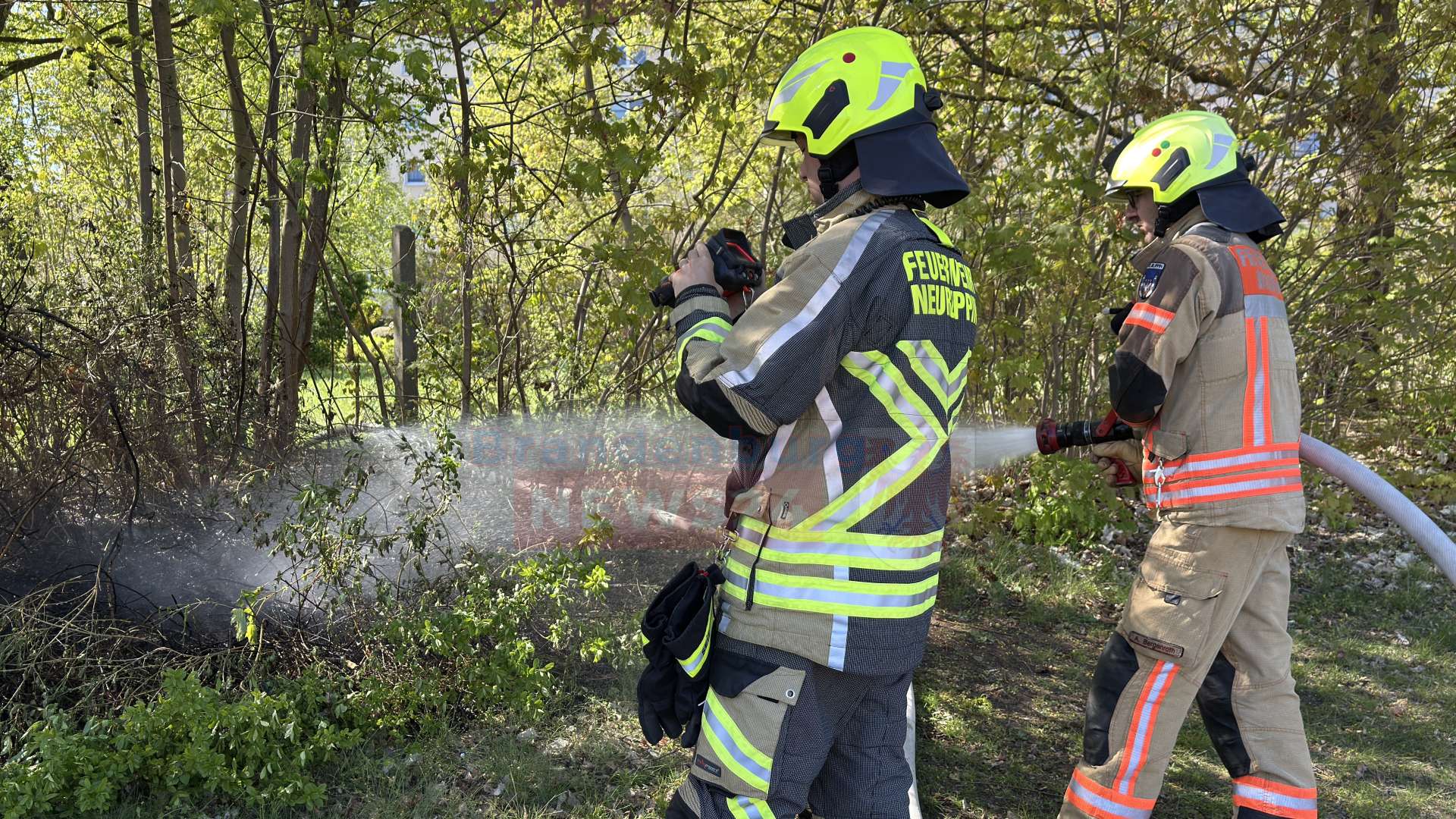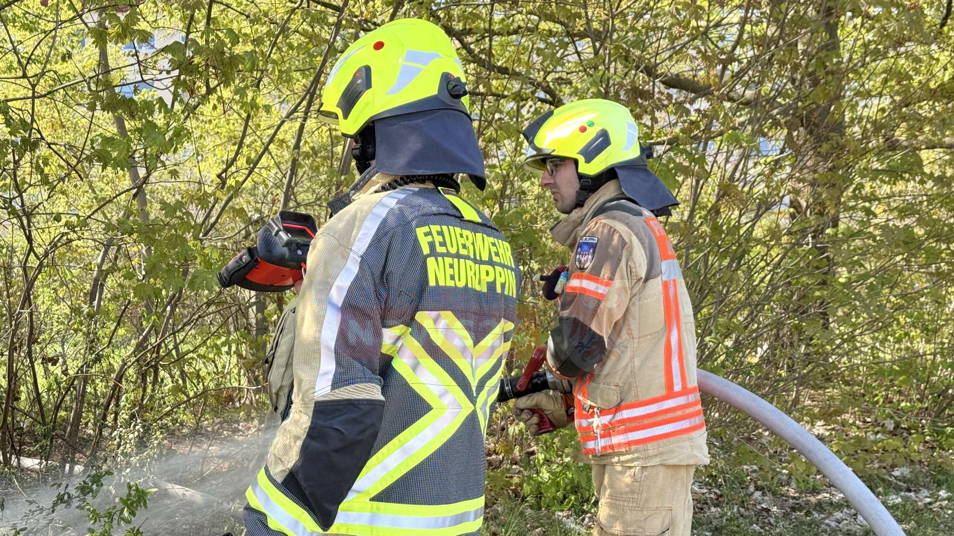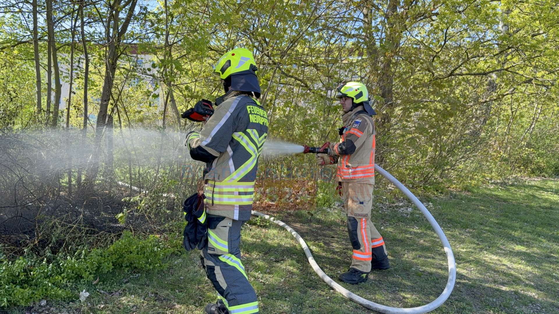 Die Freiwillige Feuerwehr war mit elf Einsatzkräften und zwei Fahrzeugen, darunter ein schweres Iveco-Löschfahrzeug, angerückt. Die Kameraden in schwerer Schutzausrüstung rollten umgehend ihre Schläuche aus. Mit dem Kommando „Erstes Rohr Wasser marsch!“ wurde direkt mit den Löscharbeiten begonnen. Durch das schnelle Eingreifen konnte ein weiteres Ausbreiten der Flammen auf die umliegenden Bäume verhindert und die brennende Fläche rasch abgelöscht werden.