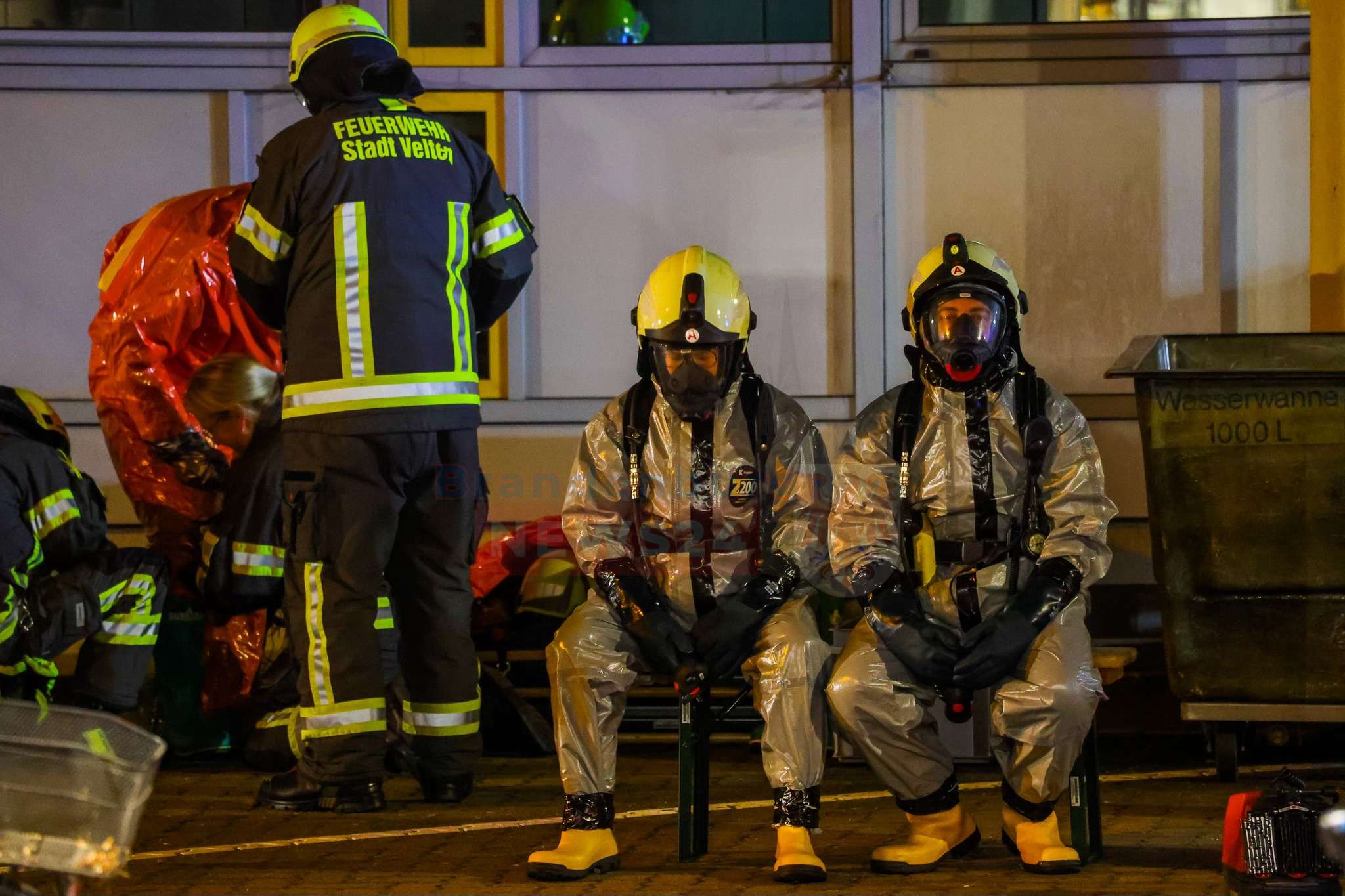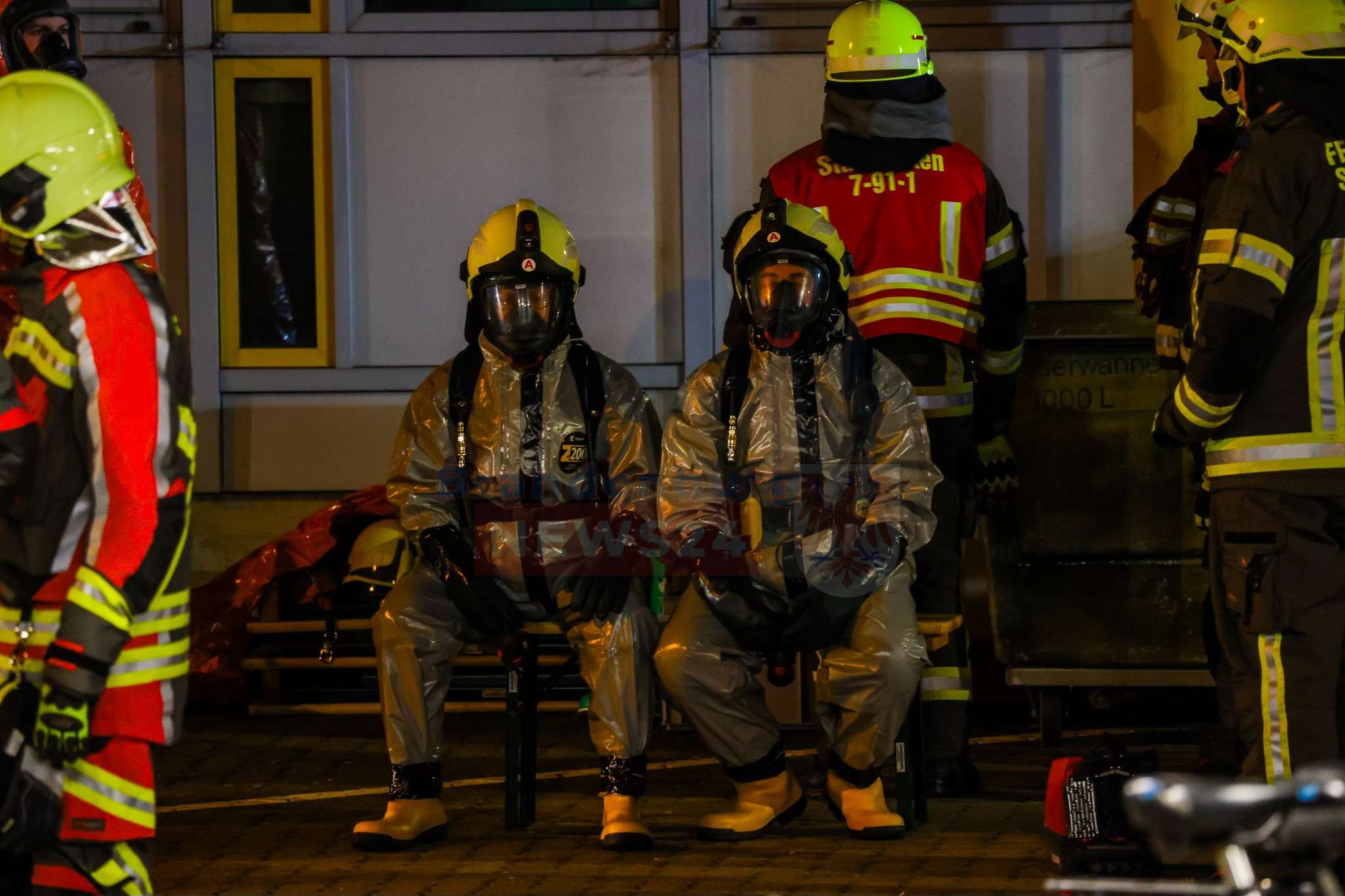 Parallel dazu begann die Feuerwehr mit der strukturierten Lageerkundung. Ein speziell ausgerüsteter Trupp rückte unter leichtem Chemikalienschutzanzug (CSA) in den betroffenen Bereich vor. Seine Aufgabe bestand darin, die Lage vor Ort genauer zu untersuchen und Proben des unbekannten Stoffes zu sichern. Dieses Vorgehen gehört zum Standard bei Einsätzen mit unklaren CBRN-Stoffen, da so Risiken für Einsatzkräfte und Betroffene minimiert werden können.