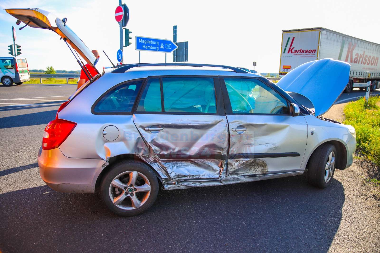 Eine 74-jährige Frau befuhr mit ihrem Opel die L17 aus Richtung Vehlefanz in Richtung Eichstädt. Nach ersten Erkenntnissen der Polizei missachtete sie dabei das Rotlicht für die Geradeausspur. Zeitgleich wollte ein 65-jähriger Skoda-Fahrer aus Richtung Eichstädt kommend nach links auf die BAB A10 in Fahrtrichtung Vehlefanz auffahren. Für seine Linksabbiegerspur zeigte die Ampel Grün.