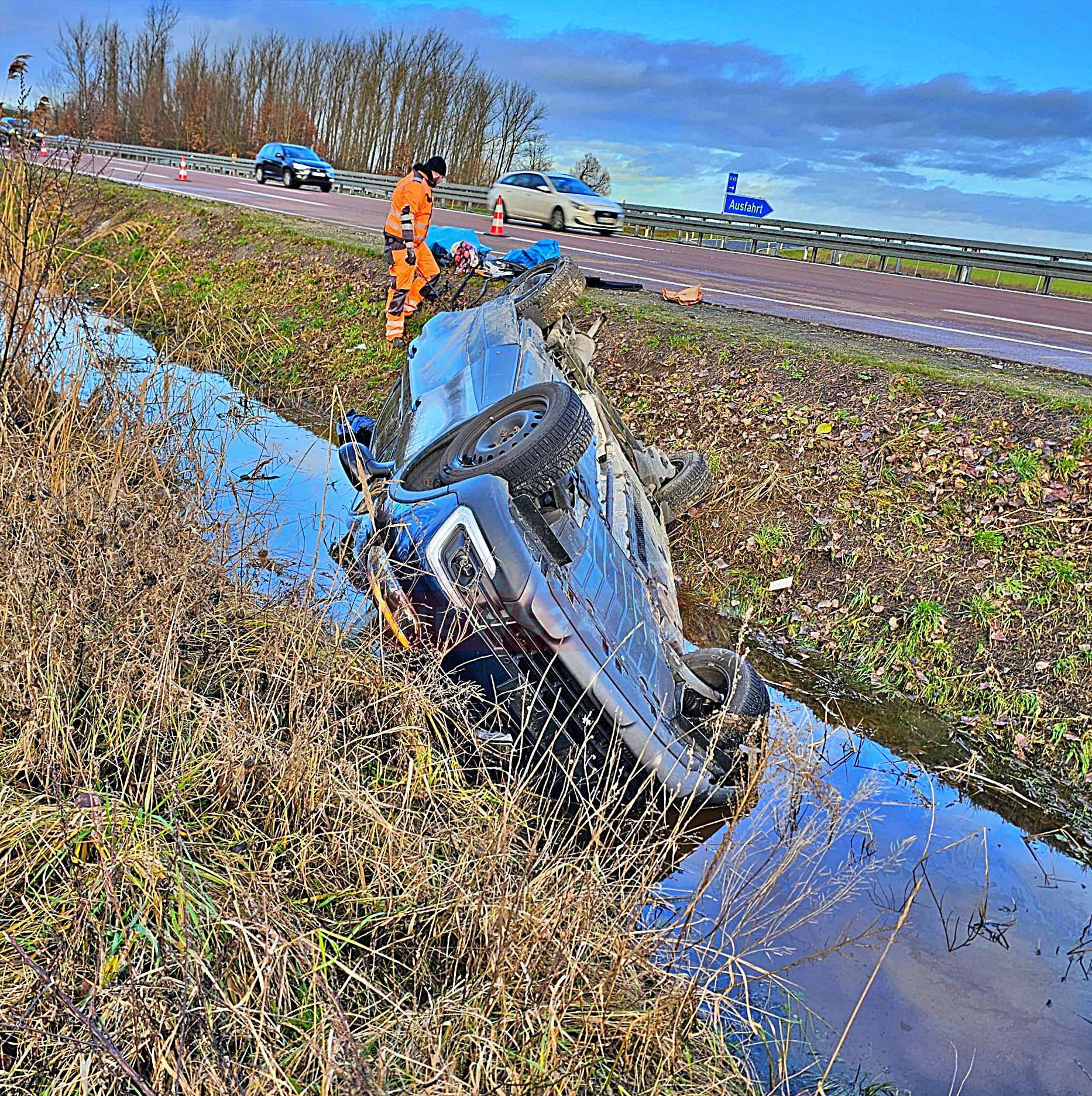 Neuruppin - Am heutigen ersten Weihnachtsfeiertag ereignete sich auf der A24 Höhe Neuruppin Süd ein schwerer Verkehrsunfall, bei dem fünf Personen leicht verletzt wurden. Nach ersten Angaben der Polizei befuhr ein Renault-Fahrer gegen etwa 10:40 Uhr an der Auffahrt Neuruppin Süd die A24. Beim Beschleunigen missachtete er die Vorfahrt eines Škoda und kollidierte mit diesem. Infolge des Zusammenstoßes verlor der Renault-Fahrer die Kontrolle über sein Fahrzeug, geriet ins Schleudern und landete schließlich Kopf über in einem Wassergraben neben der Autobahn.