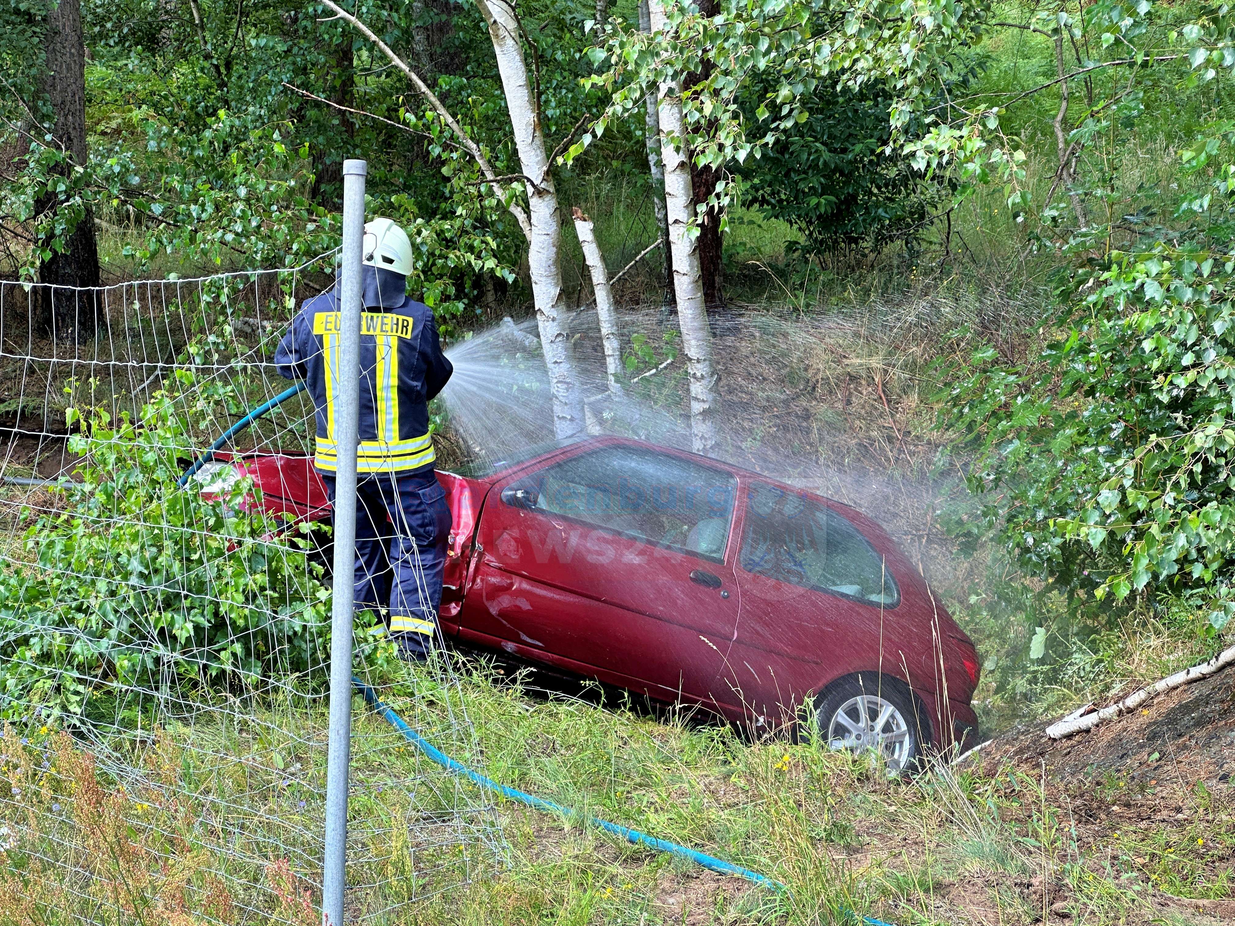 Das Fahrzeug drehte sich und prallte schließlich mit dem Heck gegen eine Birke. Die Feuerwehren aus Rossow und Wittstock/Dosse eilten zum Unfallort und sorgten für den Brandschutz. Um das Fahrzeug zu kühlen und einen möglichen Waldbrand zu verhindern, wurde Löschwasser eingesetzt.