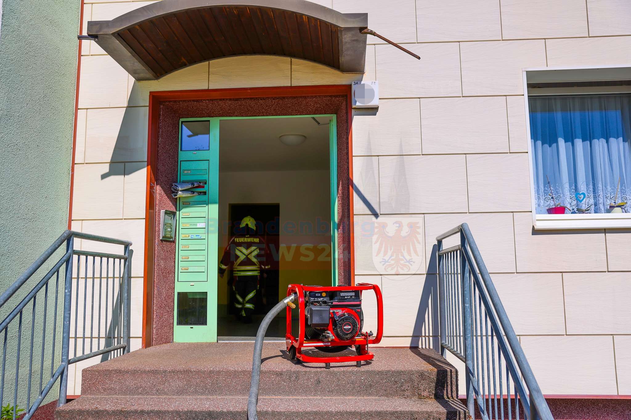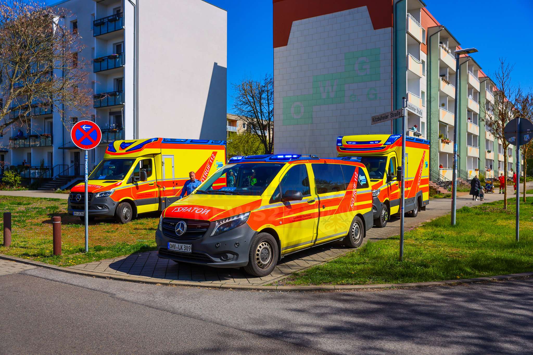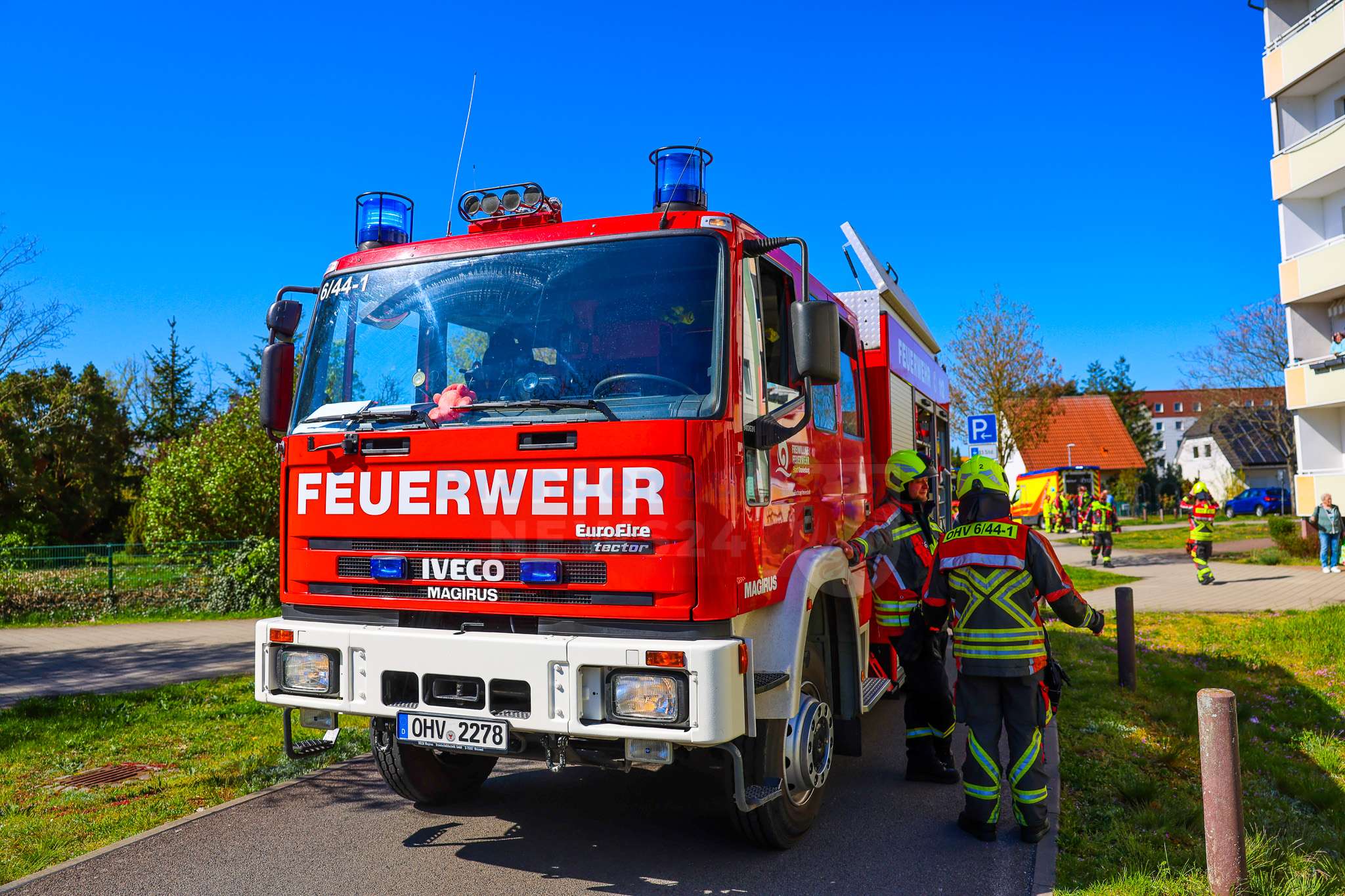 „Wir sind hier in der Kitzbüheler Straße zu einem Wohnungsbrand alarmiert worden. Rauch war augenscheinlich über dem Balkon sichtbar, zudem wurde noch eine Person in der Wohnung vermutet“, schilderte Einsatzleiter Sascha Gellert von der Feuerwehr Oranienburg die Lage vor Ort.
