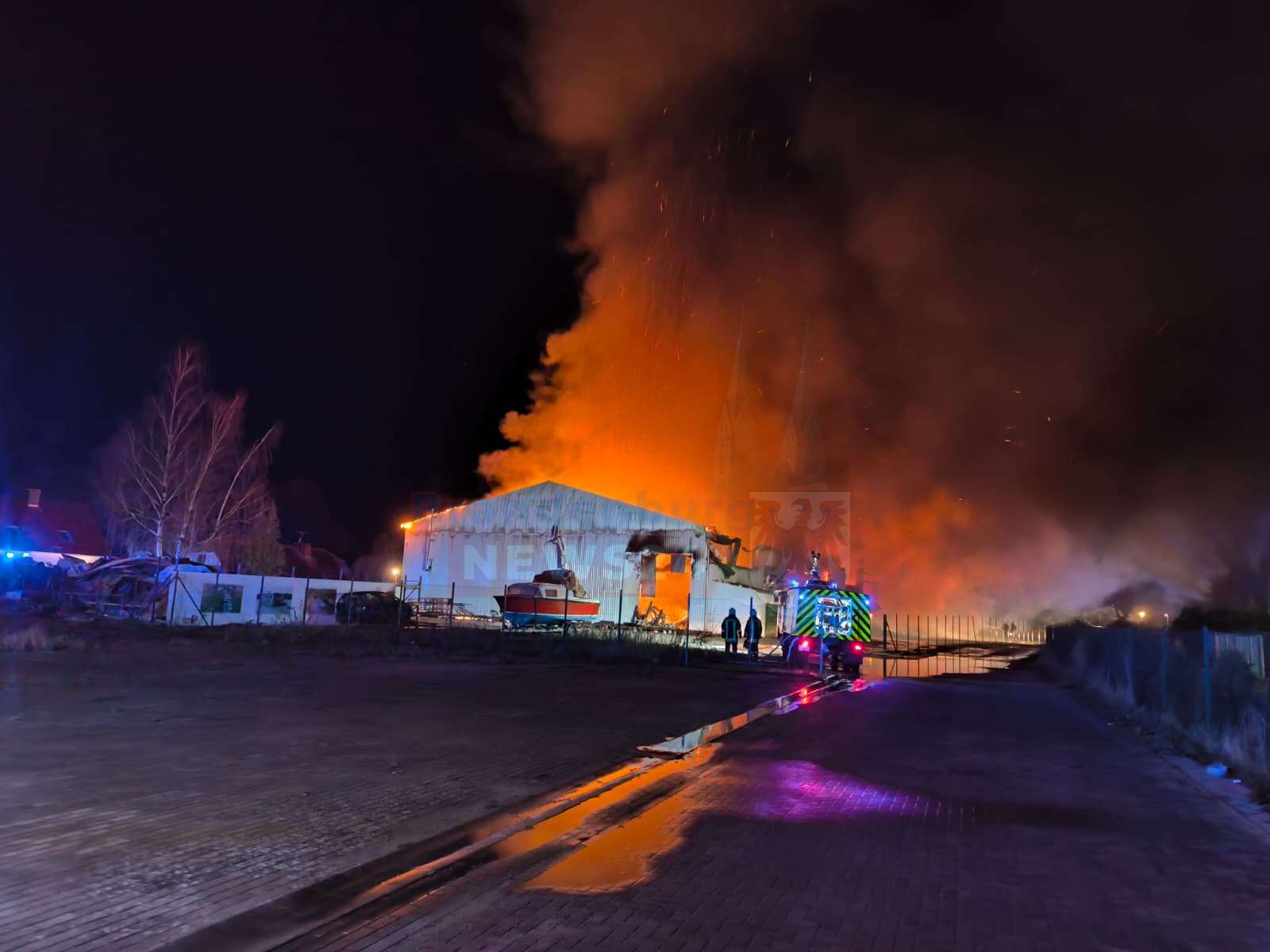 RettungsdienstPolizeiFeuerwehr Großbrand in Rheinsberg - 30 Boote bei Großbrand in Rheinsberg zerstört – Schaden auf 10 Millionen Euro geschätzt 18.11.2025 - Einsatzleiter der Feuerwehr bestätigt Totalverlust in Lagerhalle – Angrenzende Werkstatt erfolgreich geschützt – Kriminalpolizei ermittelt